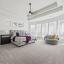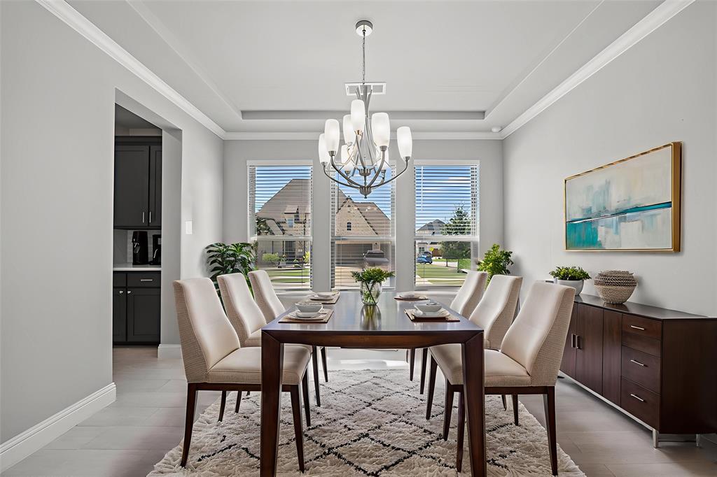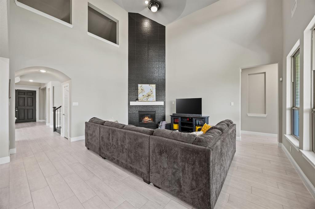 Step inside to an open, modern floor plan featuring soaring ceilings, large windows, and an abundance of natural light throughout. The spacious living room centers around a floor-to-ceiling stone fireplace with gas logs and opens seamlessly to a well-appointed gourmet kitchen outfitted with double ovens, a six-burner gas cooktop, granite island, custom cabinetry, and a large walk-in pantry. A butler’s pantry leads into the formal dining room, perfect for entertaining or hosting holiday meals.