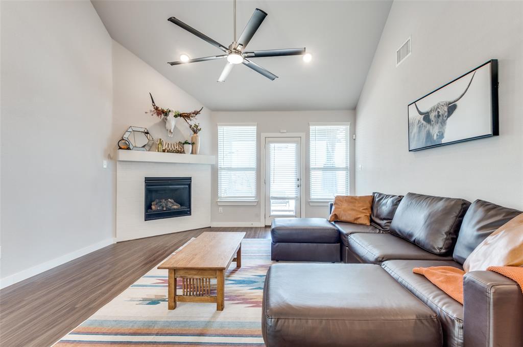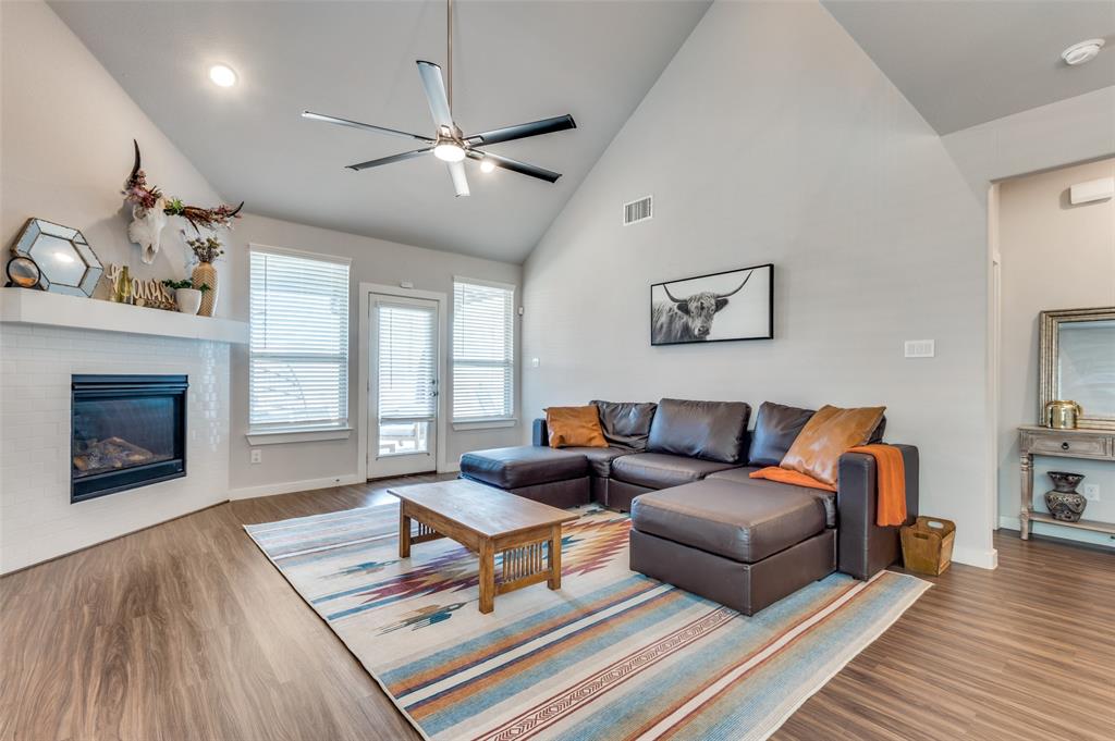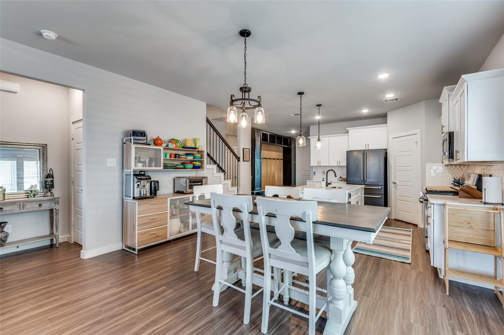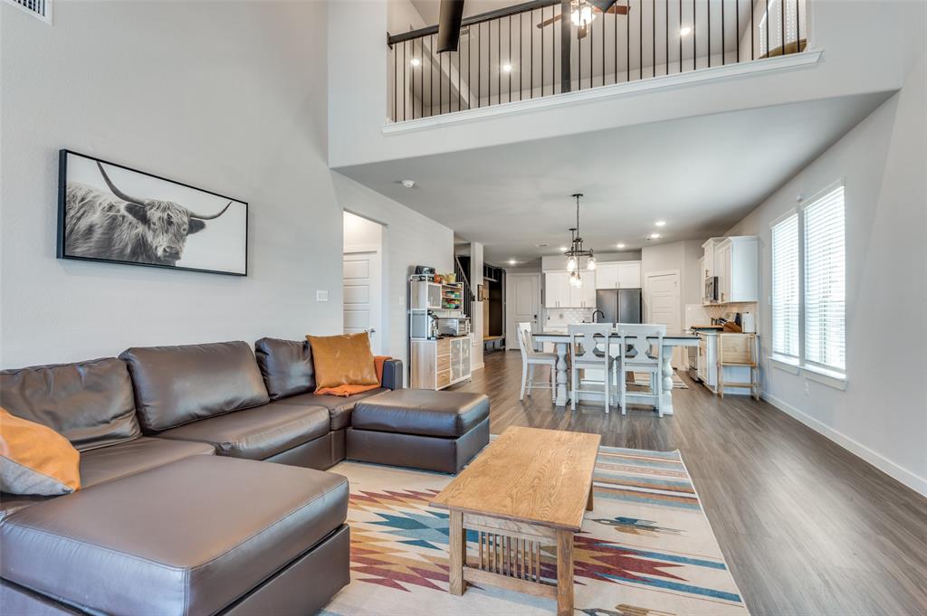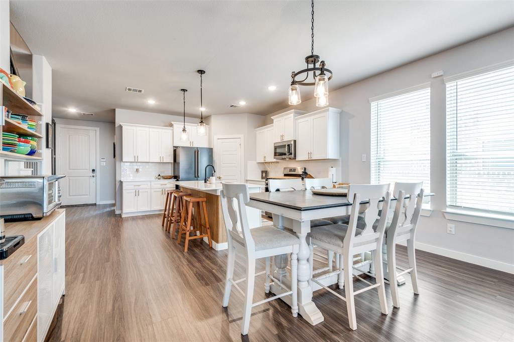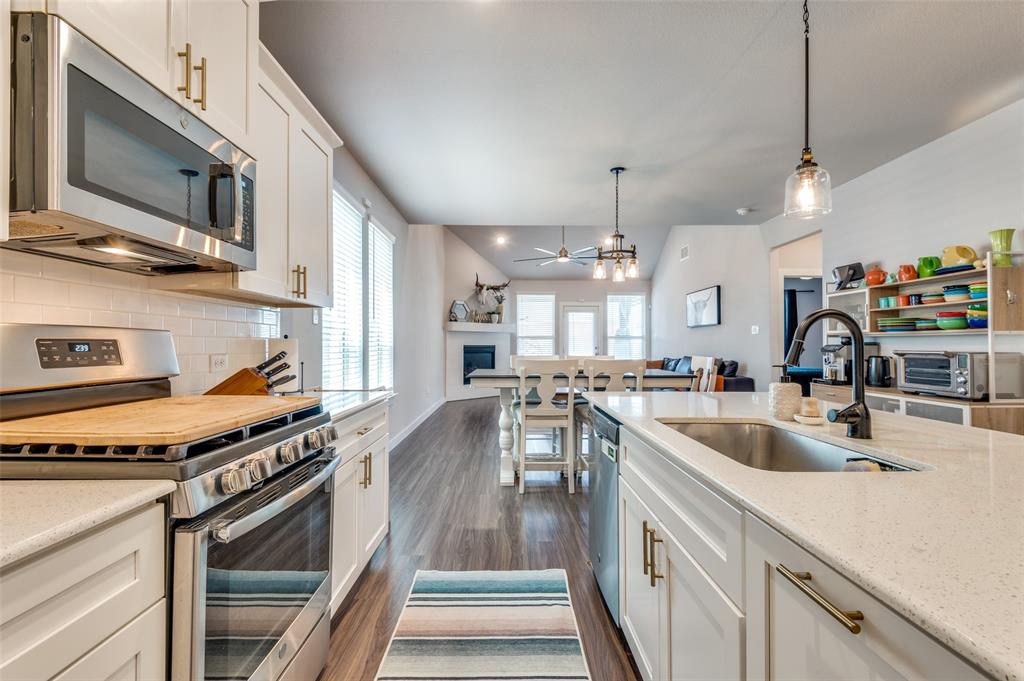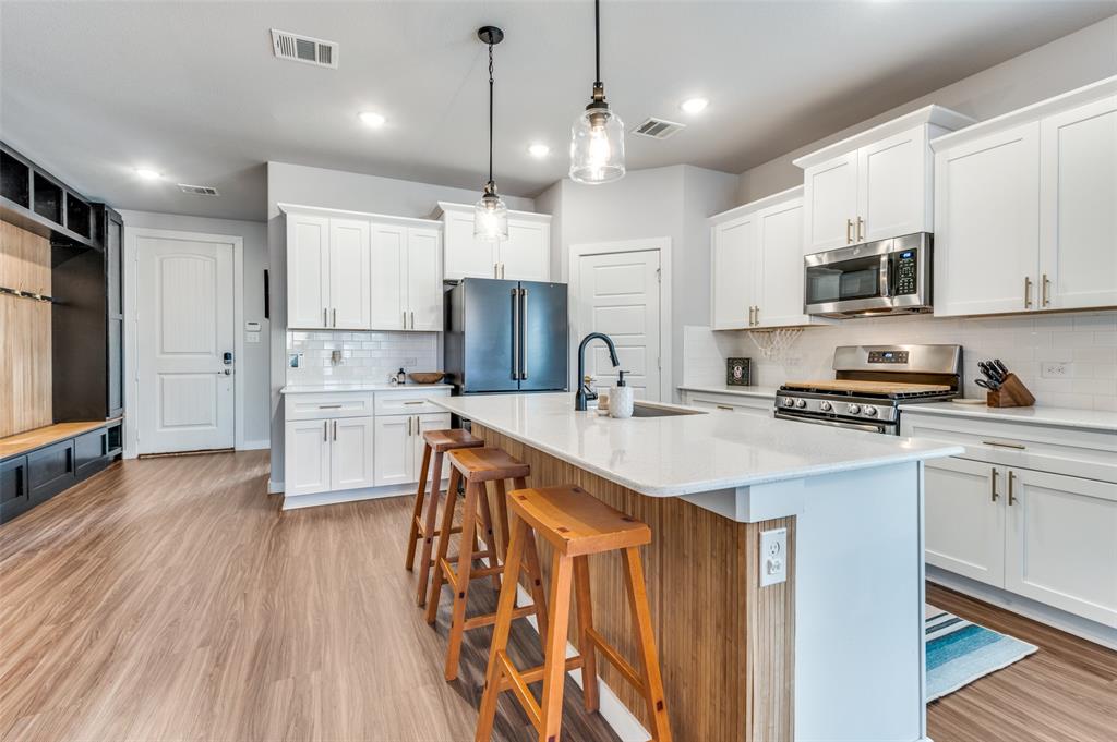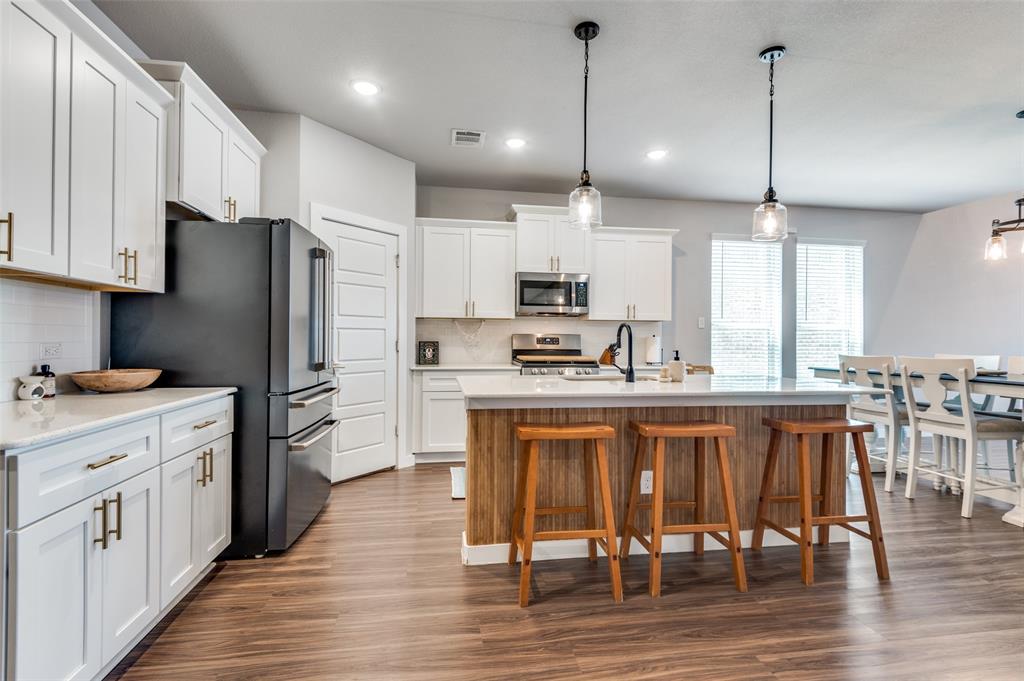 This immaculate home offers thoughtful upgrades, a functional layout, and stylish finishes throughout. The light-filled, open-concept floorplan features luxury vinyl plank flooring, designer fixtures, and a spacious living area that flows seamlessly into the kitchen and dining spaces. The kitchen is equipped with a gas cooktop, quartz countertops, white cabinetry, gold hardware, and a large center island—perfect for entertaining.