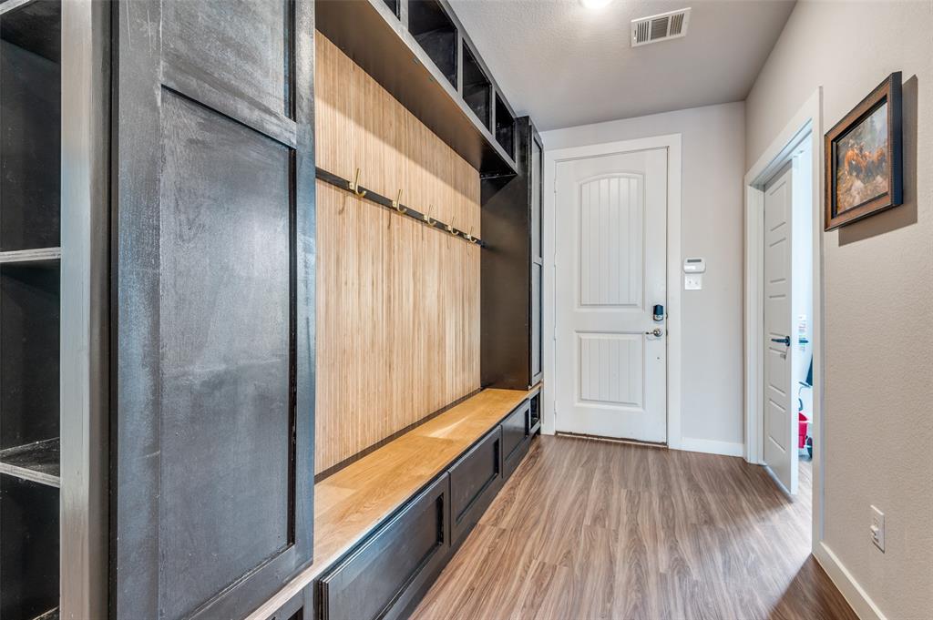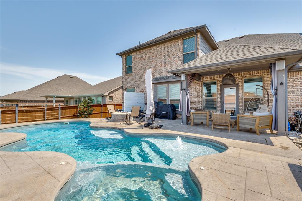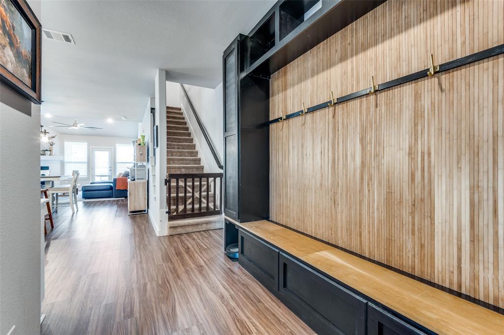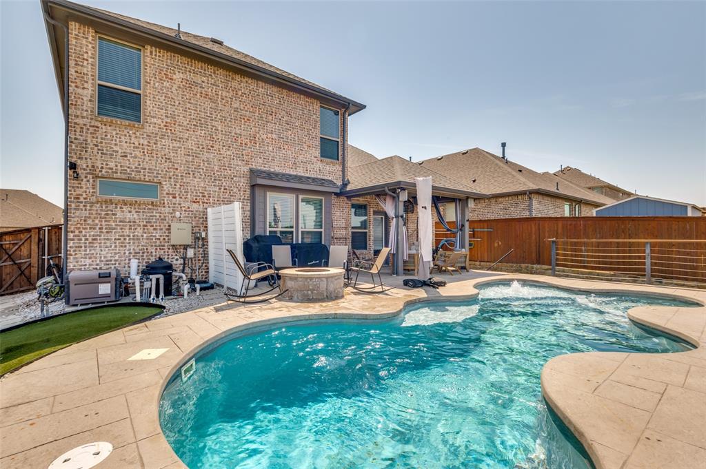 Main level includes a private home office, guest bedroom with full bath, and a generously sized primary suite with dual vanities and walk-in shower. The entryway includes a custom built-in mudroom bench for added convenience and storage. Upstairs offers a versatile game room and additional living space. Enjoy outdoor living year-round with a custom covered patio, built-in surround sound, gas firepit, artificial turf, and pool featuring a Catch-a-kid pool cover for safety. Garage includes built-in shelving, epoxy floors, and 240V access for an EV charger. Prime location with easy access to I-20 and just minutes from Haltom High School.