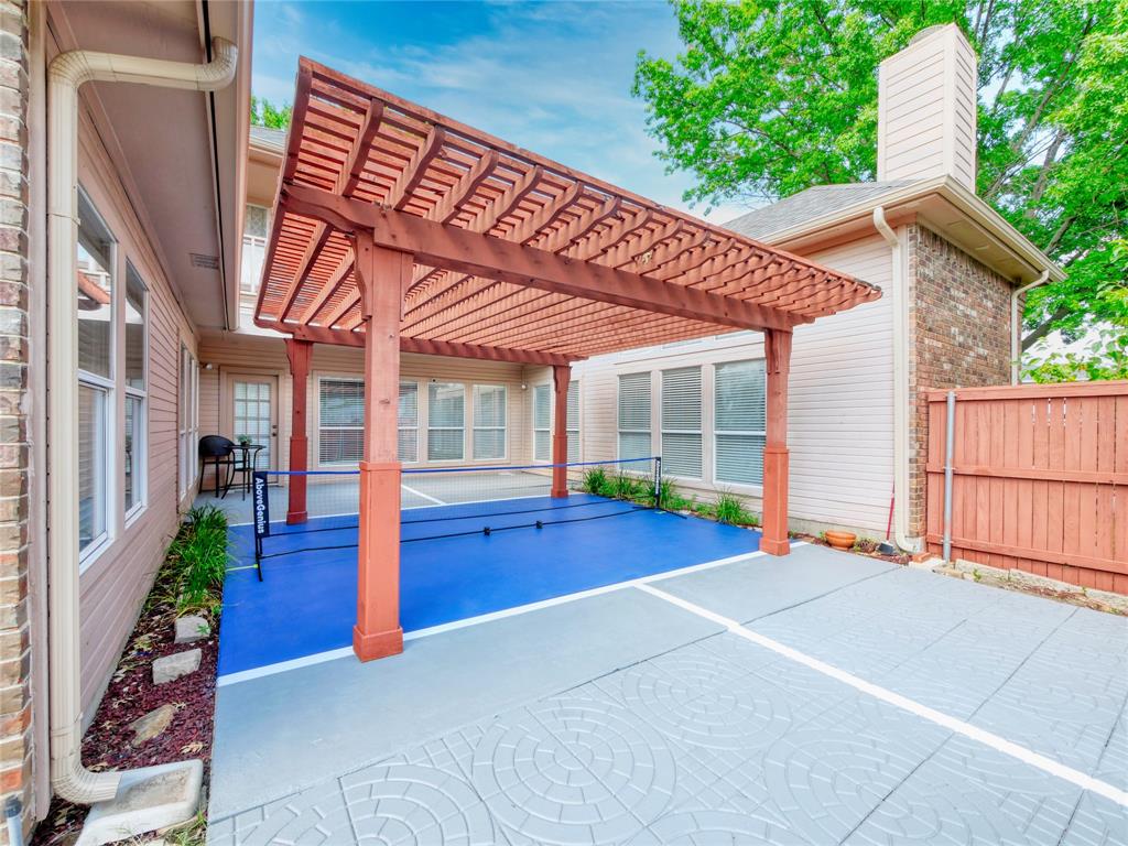 The standout feature is the private side yard, recently painted as a pickleball practice court—ideal for fitness, fun, and friendly play. A covered patio adds even more potential for outdoor enjoyment.
