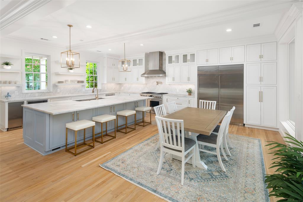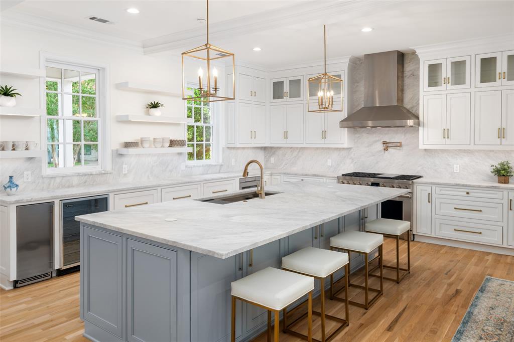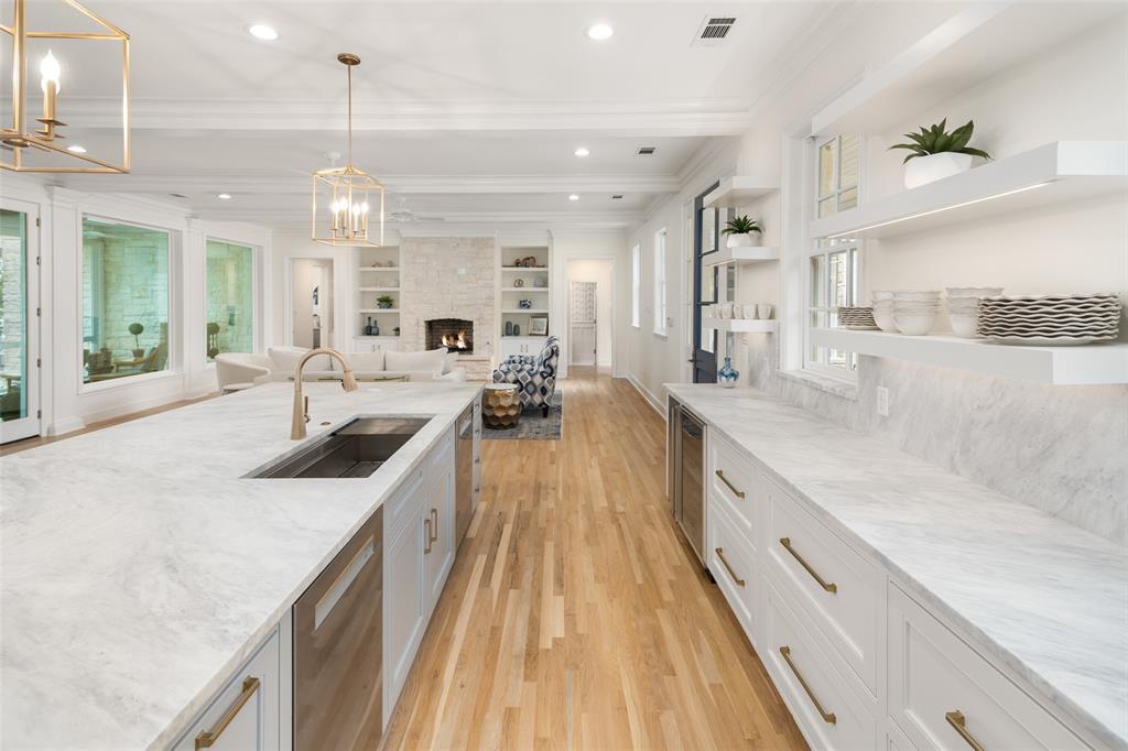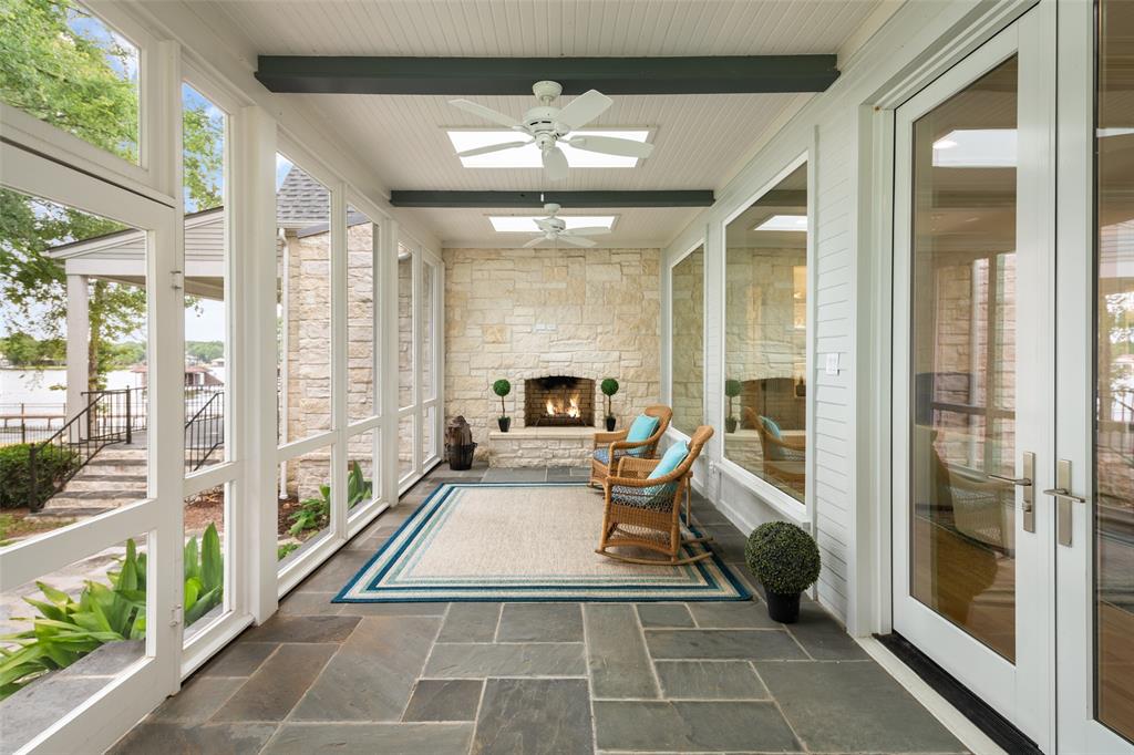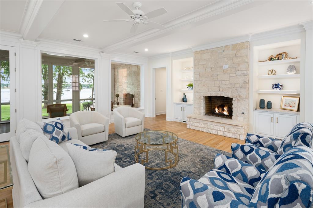 Inside, 10-foot ceilings span the open-concept kitchen, dining, and living areas. The kitchen is outfitted with dolomite countertops, custom cabinetry, and luxury appliances—including a Wolf range, Sub-Zero refrigerator and freezer, and dual Bosch dishwashers. The adjacent screened-in porch offers a quiet spot to relax, while a custom fire pit circle near the boathouse sets the stage for unforgettable evenings and front-row seats to the Thunder Over Cedar Creek Lake Airshow.