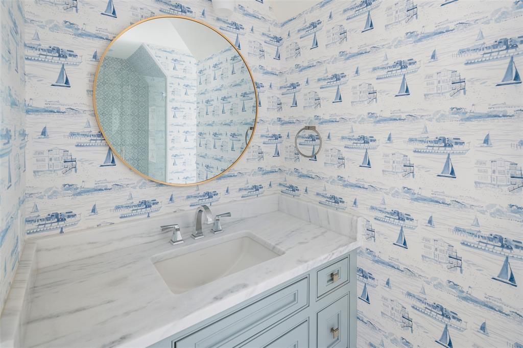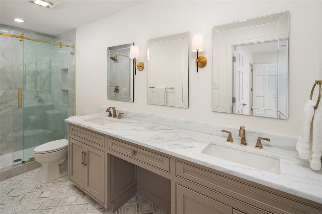 The main-level primary suite is a true retreat, featuring vaulted ceilings, lake views, a private patio, and a Zephyr morning bar. The spa-inspired bath includes a soaking tub, walk-in shower, and dual vanities. Upstairs, three guest suites all include en-suite baths, along with an oversized fifth bedroom—ideal for bunk space, media, or games—which also includes its own en-suite bath.