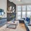 kitchen with granite countertops and waterfall island that opens up to the living room features a soaring ceiling, creating an