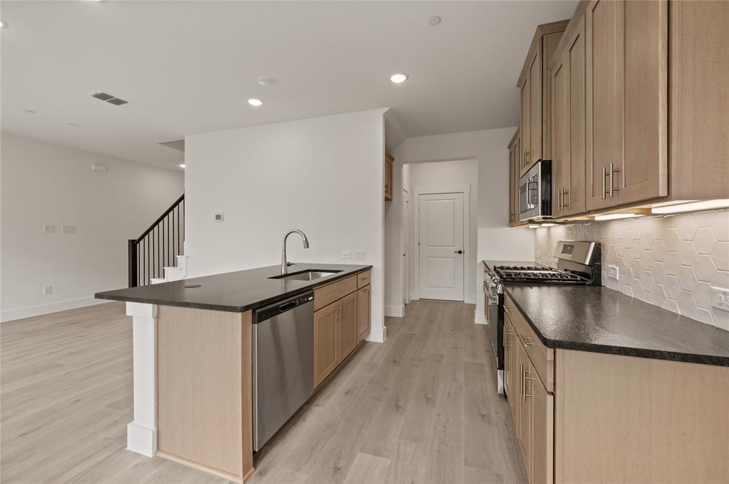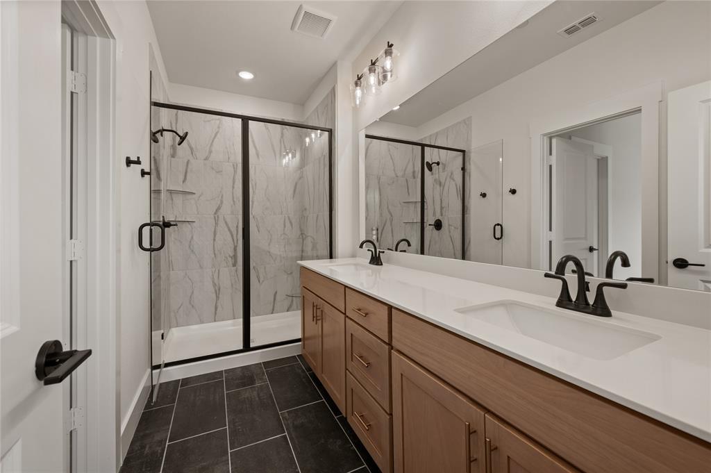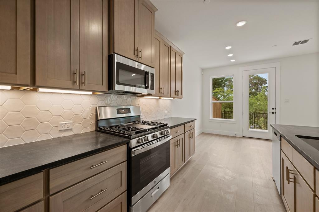 CADENCE HOMES MANOR floor plan. Brand New Luxury Townhome close to EVERYTHING! Beautiful tree and creek views from your living, dining, and kitchen in this luxury townhome. You know you are entering a special space as you enter the 8’ modern entry door. Enjoy designer finishes while you are cooking in this modern kitchen with Harvest color stained 42 inch upper cabinets and 3 CM Negresco leather granite countertops, stainless steel appliances, and easy to maintain engineered oak colored wood-like flooring throughout much of the first floor. The spacious patio leads to the private backyard and is the perfect place to entertain surrounded by nature! All 3 bedrooms are all nicely sized. Owner’s suite feels like a spa with a large walk-in shower and double vanities. Enjoy this booming location within a few minutes of the restaurant capital of NTX! MOVE IN READY NOW!