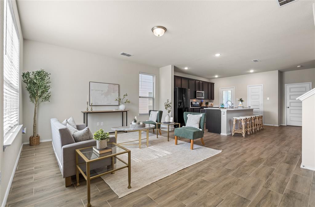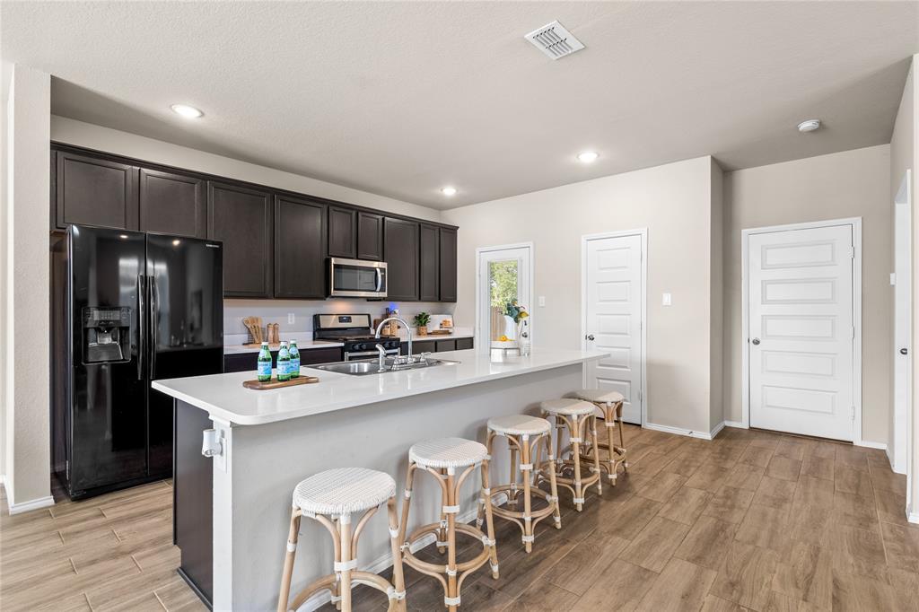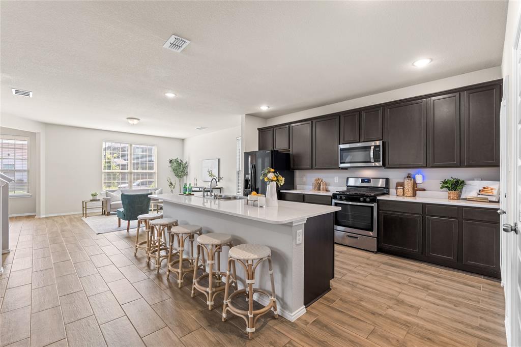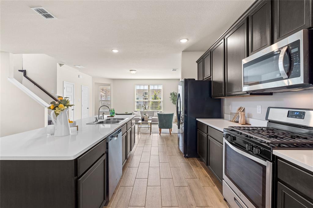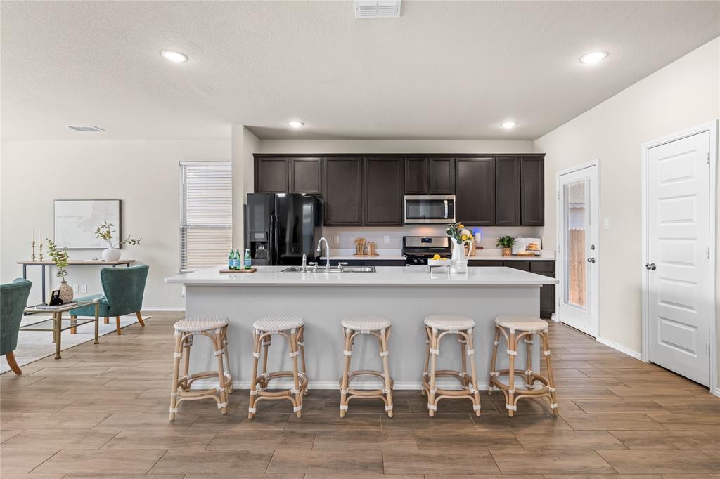 Step inside and you’ll find a light, airy interior with timeless neutral tones, wood-look tile flooring, and clean, modern finishes. The spacious kitchen is a standout, featuring dark espresso cabinetry, brand new black and stainless steel appliances, a gas range, and a large island with quartz countertops, perfect for morning coffee or casual meals. The adjoining living room is filled with natural light and flows effortlessly from the dining area, creating an open and inviting gathering space.