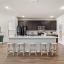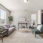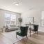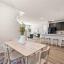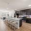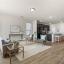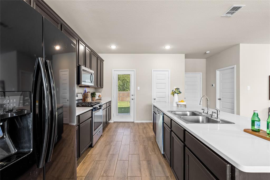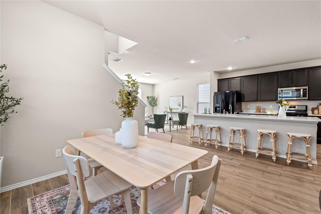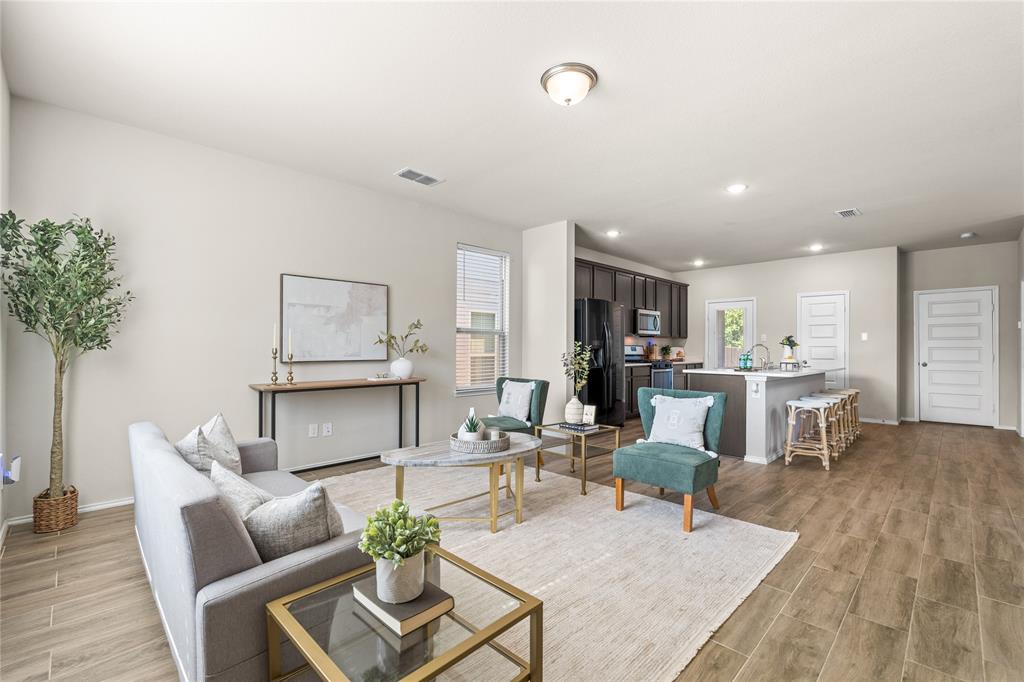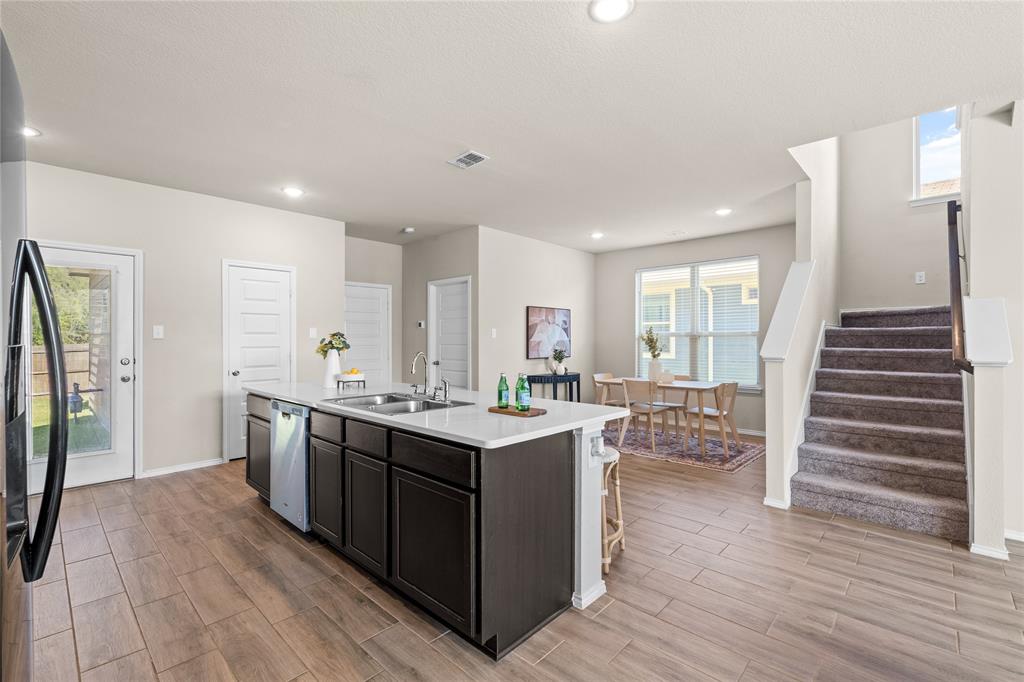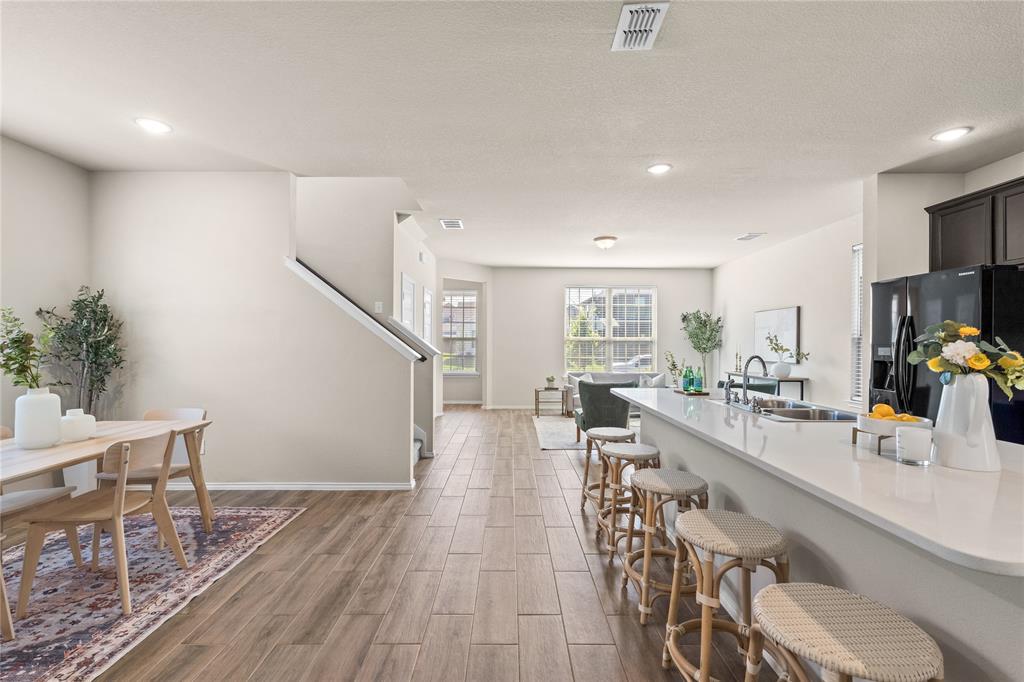 Step inside and you’ll find a light, airy interior with timeless neutral tones, wood-look tile flooring, and clean, modern finishes. The spacious kitchen is a standout, featuring dark espresso cabinetry, brand new black and stainless steel appliances, a gas range, and a large island with quartz countertops, perfect for morning coffee or casual meals. The adjoining living room is filled with natural light and flows effortlessly from the dining area, creating an open and inviting gathering space.