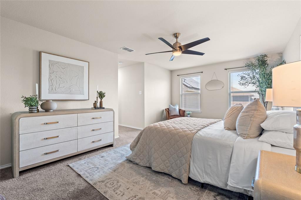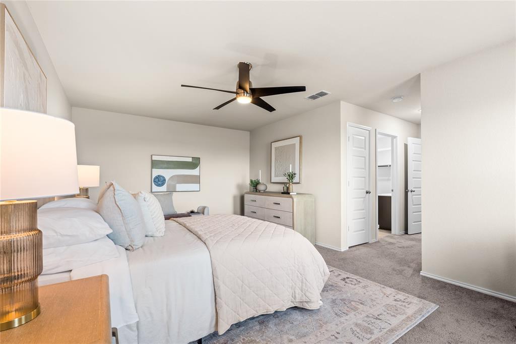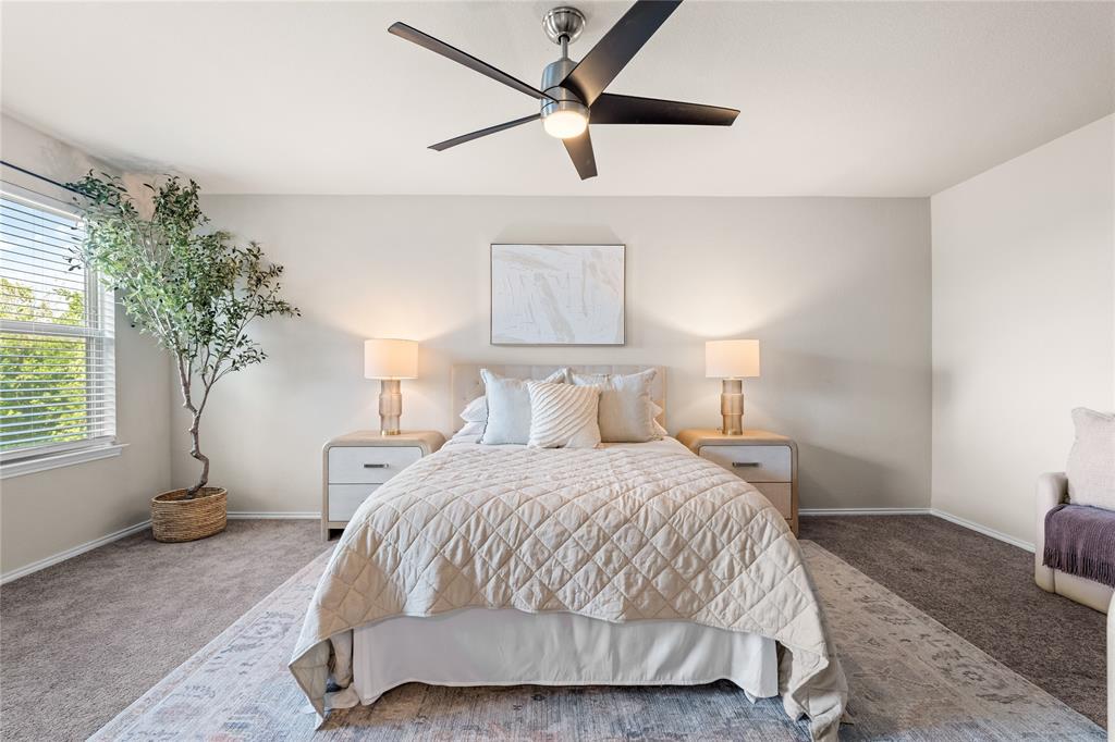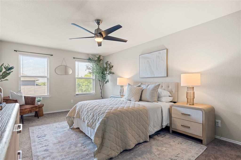 Upstairs, the oversized primary suite offers a peaceful retreat, complete with a walk-in closet and a private ensuite bathroom with dual sinks, a soaking tub, and a separate shower surrounded by warm gray tile. Secondary bedrooms are generously sized, and all feature plush carpeting and plenty of closet space. You’ll also love the abundance of storage space throughout the home, upstairs and down.