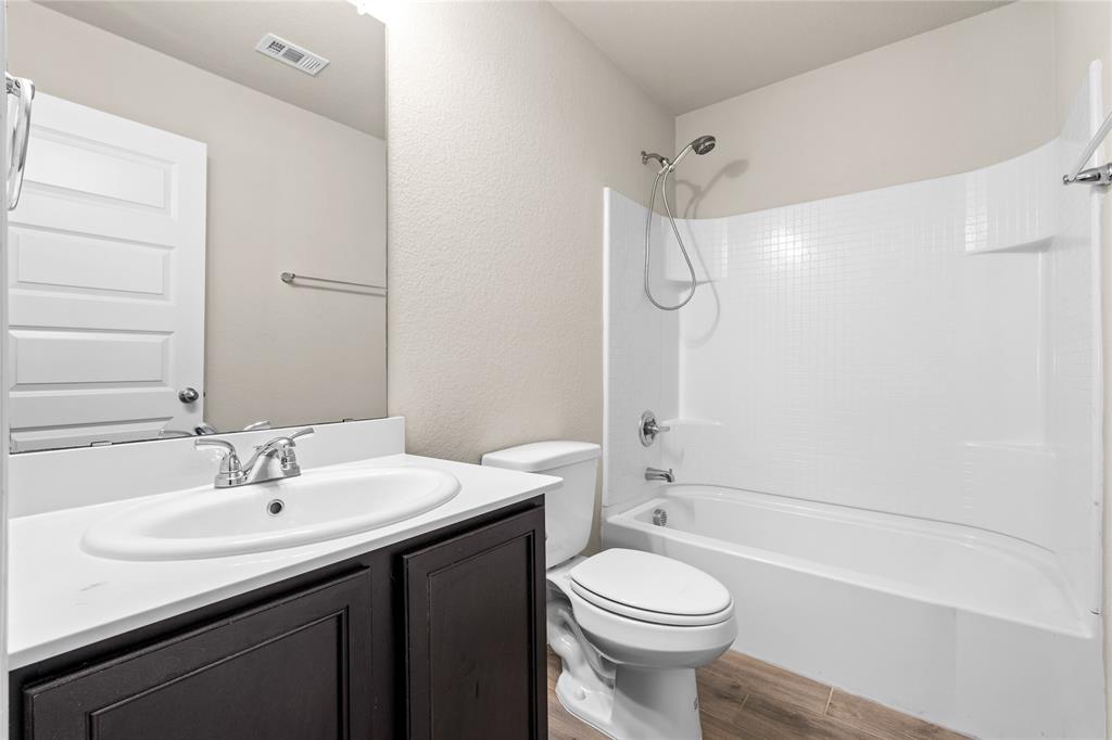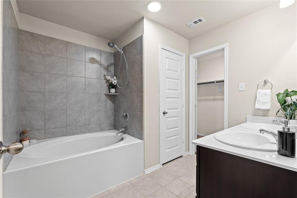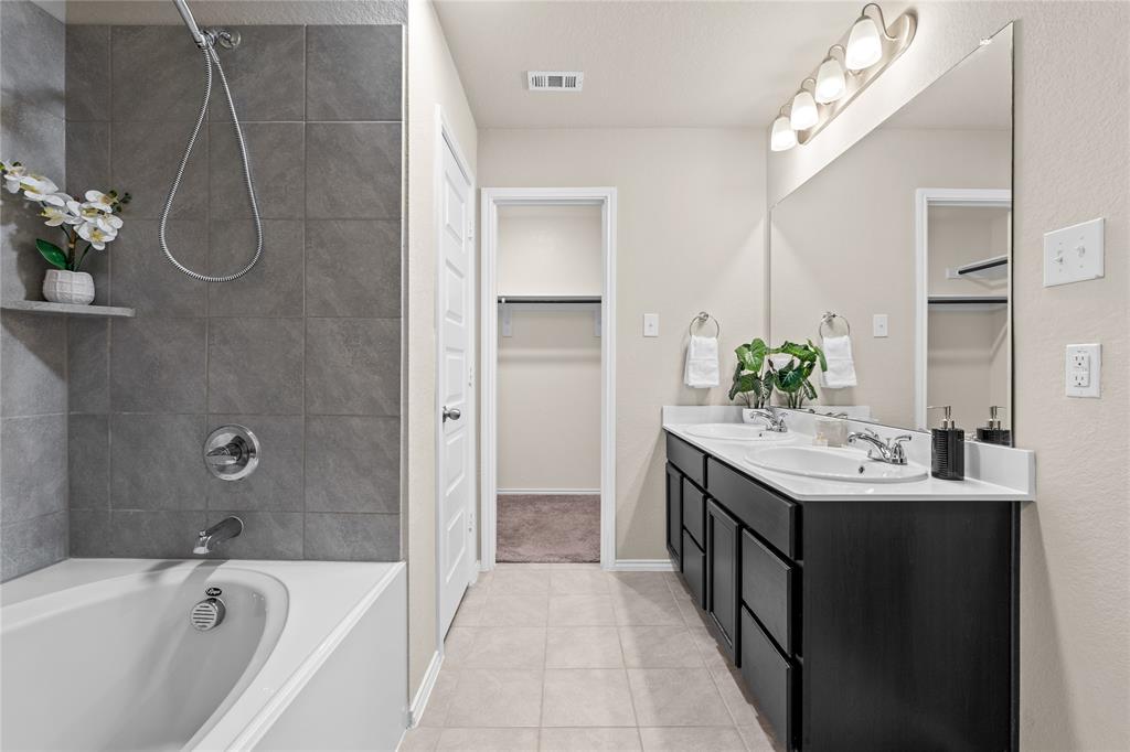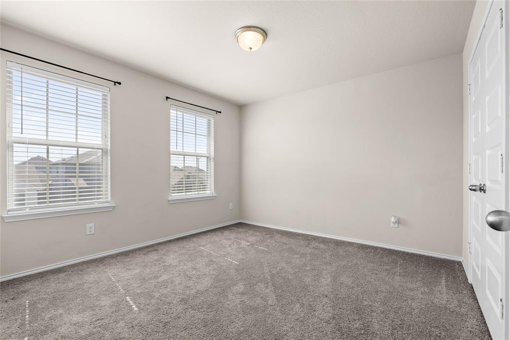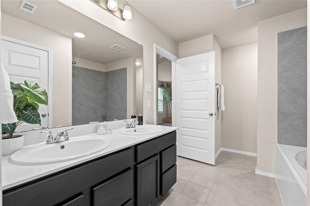 Upstairs, the oversized primary suite offers a peaceful retreat, complete with a walk-in closet and a private ensuite bathroom with dual sinks, a soaking tub, and a separate shower surrounded by warm gray tile. Secondary bedrooms are generously sized, and all feature plush carpeting and plenty of closet space. You’ll also love the abundance of storage space throughout the home, upstairs and down.