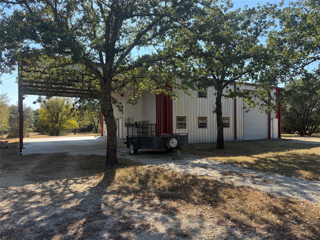 BACK ON THE MARKET, BUYER COULD NOT SELL THEIR PROPERTY! Spacious Home with RV Barn and Guest Apartment – A True Home Away From Home! This versatile property features a one-bedroom home with a large open living area. Designed with accessibility in mind, the home has tile floors, grab bars, and a handicap-accessible shower. Parking is a breeze with two carports: one large enough for four cars and another, attached to the shop, that accommodates two RVs with hookups. The property includes a massive 50 x 80 metal building, featuring a 50 x 50 insulated workshop with roll-up insulated doors (2 x 14 by 16, and one electric 12 by 18) and an attached guest apartment. This space is perfect for hobbies, storage, or hosting guests. Nestled on a picturesque 5-acre lot filled with live oaks, the property backs up to CORP land at Lake Whitney, providing a hike able access to nature and water. Enjoy the wildlife, including deer, turkey, and more, right in your backyard! A unique and serene retreat, ideal for country living with all the amenities you need.
