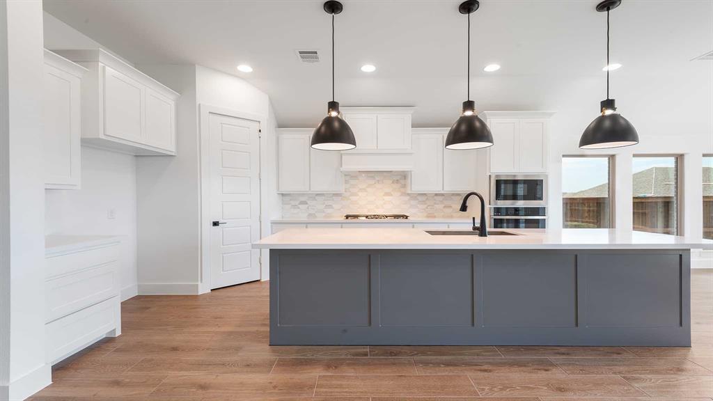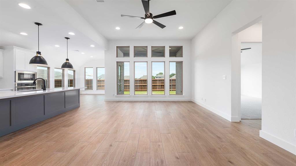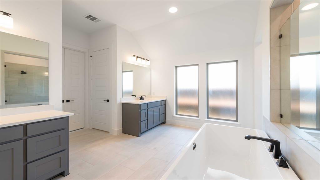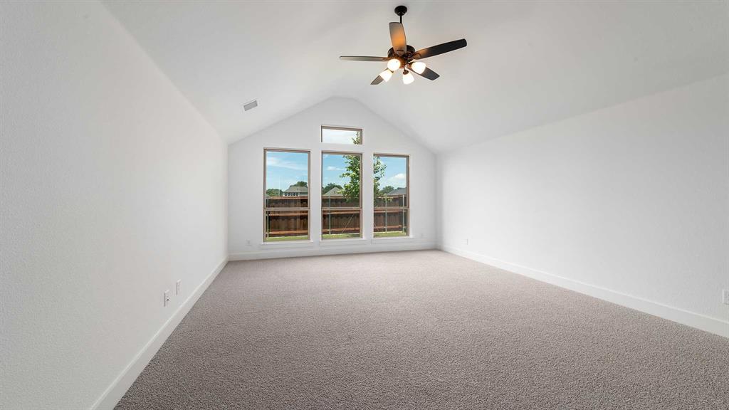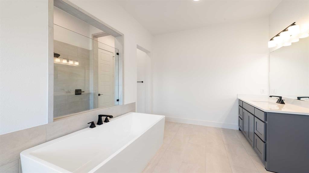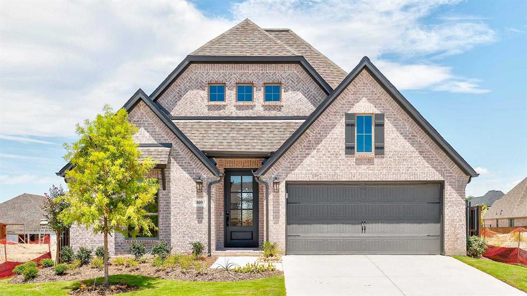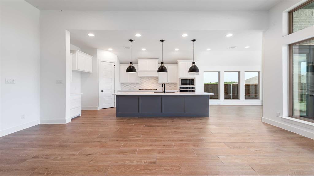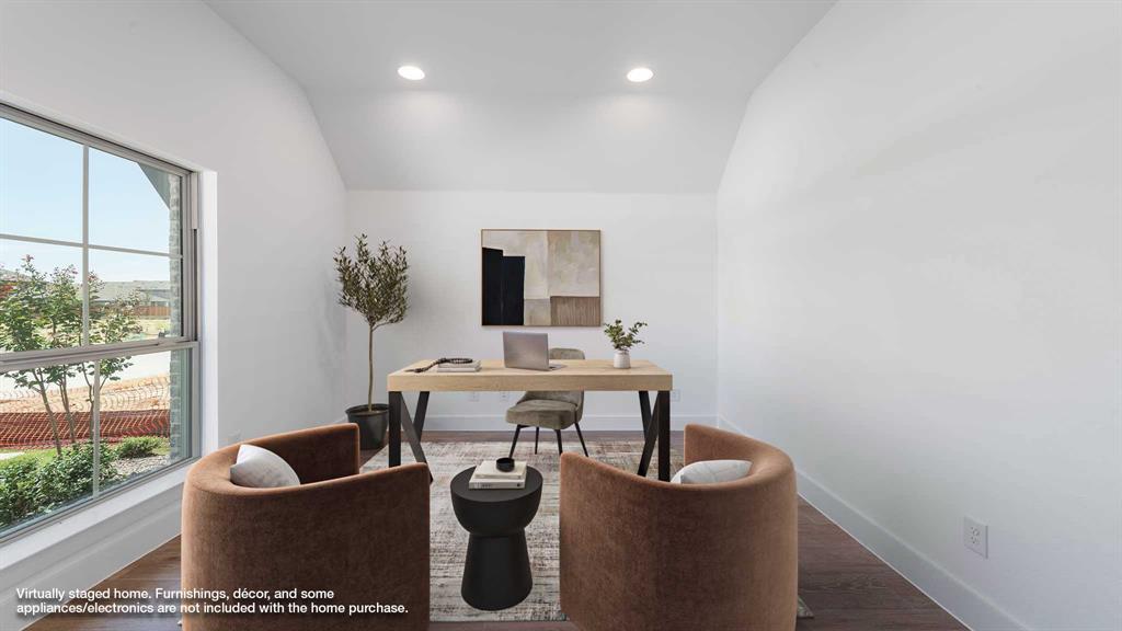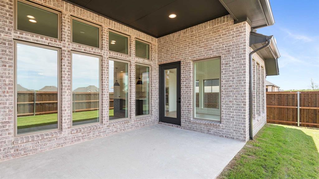 Home office with French doors set at entry with 12-foot ceiling. Coffered extended entry leads to open family room, kitchen and dining area. Family room features a wood mantel fireplace and wall of windows. Kitchen features corner walk-in pantry, 5-burner gas cooktop and generous island with built-in seating space. Primary bedroom highlights 12-foot ceiling and wall of windows. Double doors lead to primary bath with dual vanities, freestanding tub and separate glass-enclosed shower with separate walk-in closets. A guest suite with private bath adds to this one-story design. Covered backyard patio. Mud room off two-car garage.