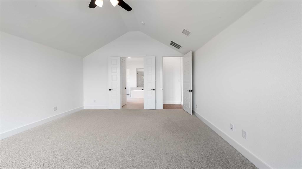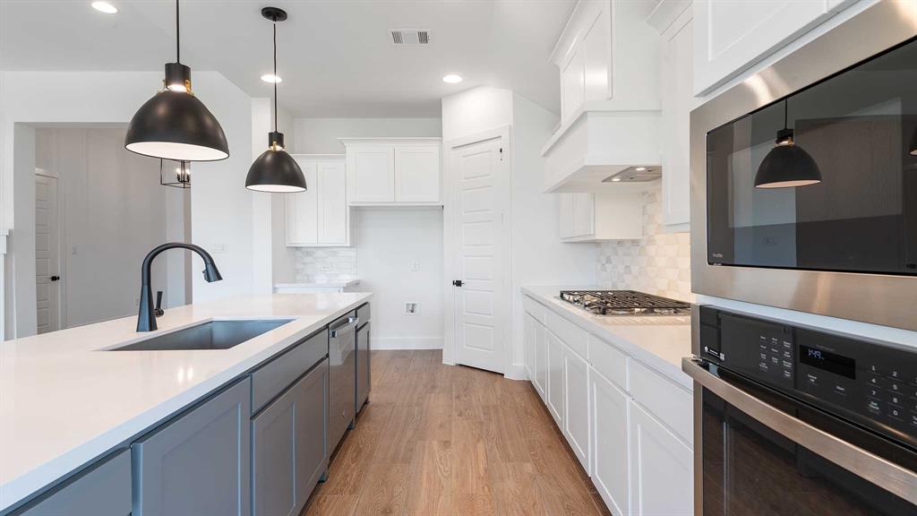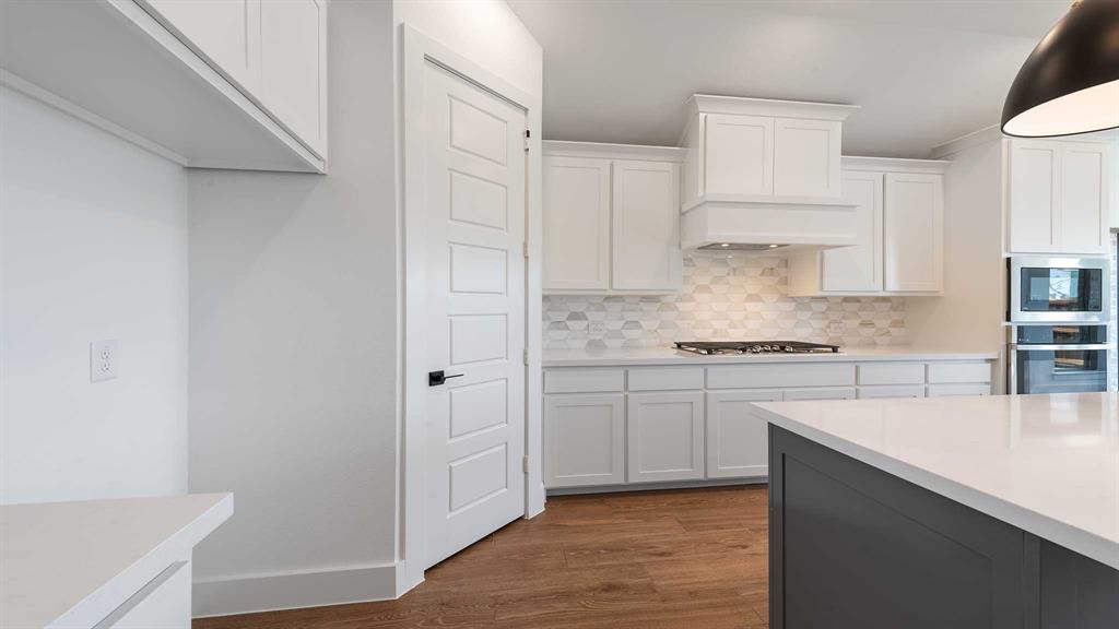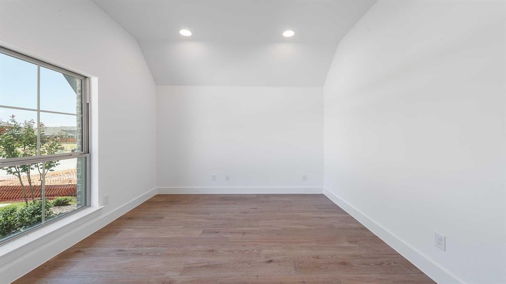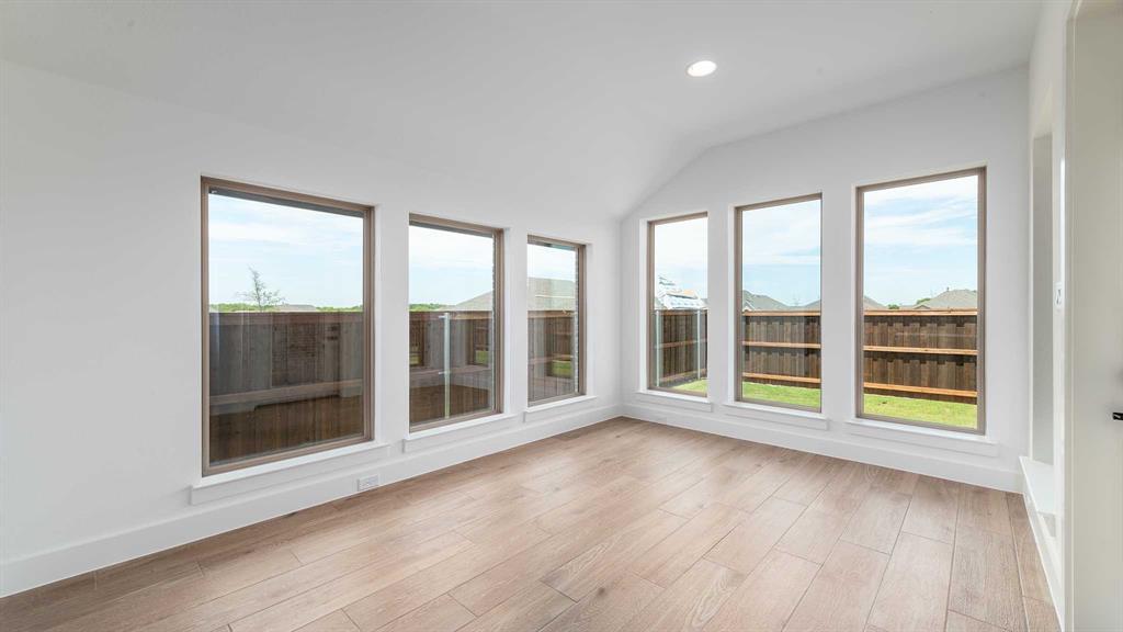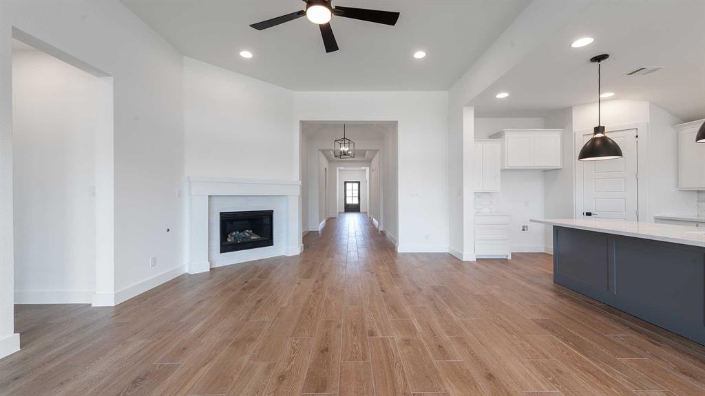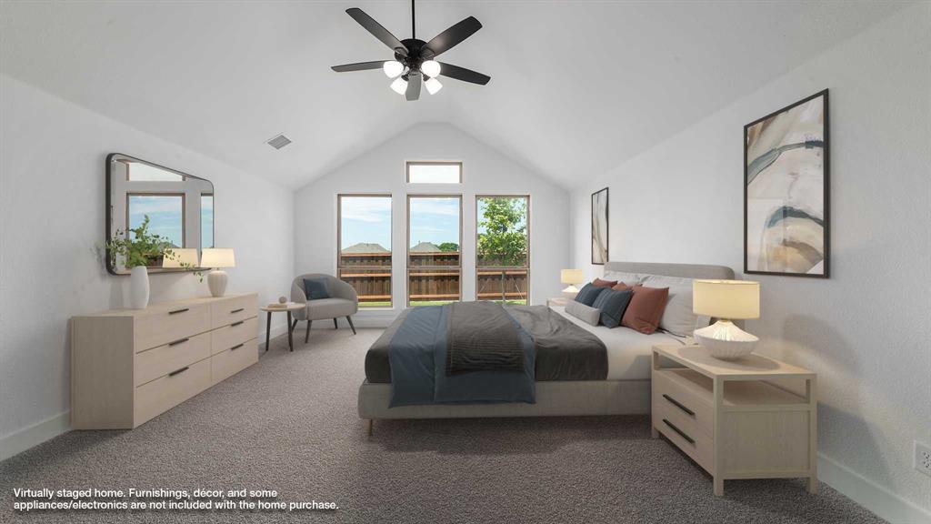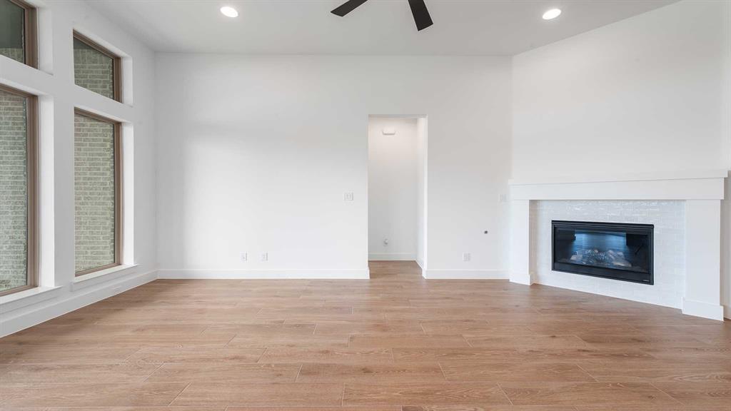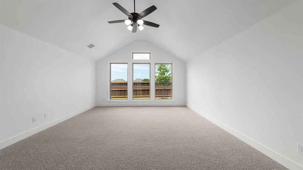 Home office with French doors set at entry with 12-foot ceiling. Coffered extended entry leads to open family room, kitchen and dining area. Family room features a wood mantel fireplace and wall of windows. Kitchen features corner walk-in pantry, 5-burner gas cooktop and generous island with built-in seating space. Primary bedroom highlights 12-foot ceiling and wall of windows. Double doors lead to primary bath with dual vanities, freestanding tub and separate glass-enclosed shower with separate walk-in closets. A guest suite with private bath adds to this one-story design. Covered backyard patio. Mud room off two-car garage.