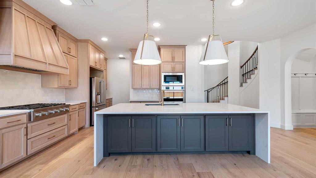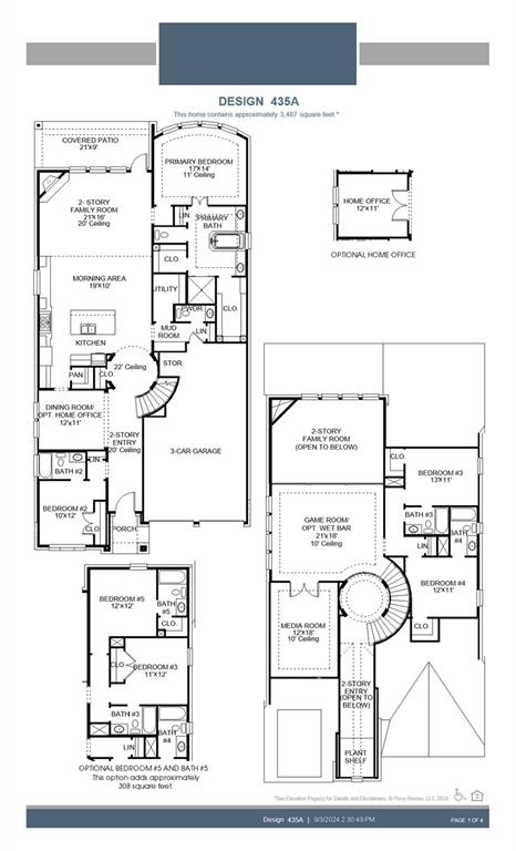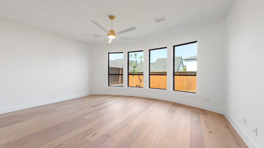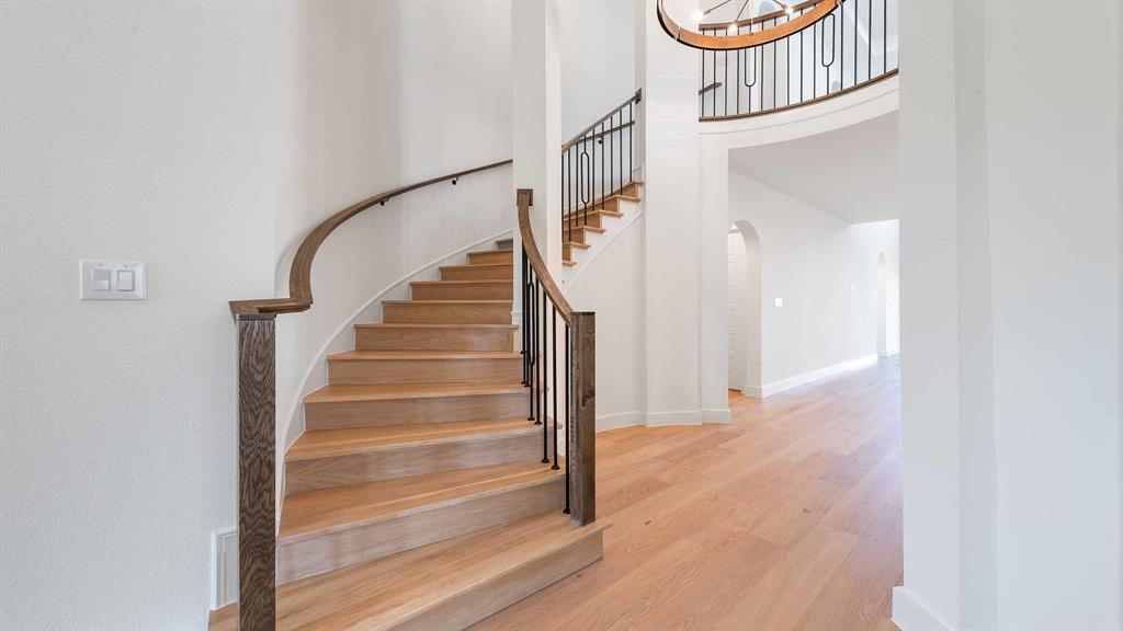 Grand two-story entry. Home office with French doors opens to curved staircase. Hardwood floors throughout first floor living areas. Open kitchen offers corner walk-in pantry, double wall oven, 6-burner gas range top, and generous island with built-in seating space. Morning area opens to two-story family room with a wood mantel fireplace and sliding glass door. First-floor primary suite includes bedroom with wall of windows. Double doors lead to primary bath with dual vanities, a freestanding tub, separate glass-enclosed shower and two walk-in closets. A guest suite and powder room complete first floor. A game room, media room, secondary bedrooms, two full bathrooms and additional guest suite are upstairs. Covered backyard patio. Mud room off three-car garage.