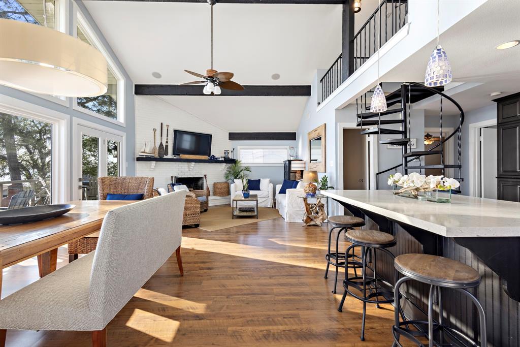 Enjoy gorgeous sunrises and expansive waterfront views just 45 minutes from Dallas. With some of the best water depth on the lake, enjoy the ease of water activities directly from your dock - perfect for fishing, paddle boarding, kayaking and swimming. Gorgeous wall of windows creates light filled living spaces and combined with the wrap around deck maximizes enjoyment of the views. Large island, double-oven, dishwasher for easy entertaining. Downstairs great room allows for separate entertaining space with access to the covered porch. This 4 bedroom 3 full bath home is currently set up to sleep up to 17 with potential for more. One bedroom currently serves as a wet room, perfect for quickly storing all those water necessities. The home is beautifully furnished and the furnishings convey, so lake life enjoyment can start on day 1. Covered boat dock includes 3 lifts one for a boat and 2 jet skis and convenient stair entry to the lake. Convenience and access are key features - just 5 minutes from the Marina for gas & boat-up dining and a short commute to top local favorites like Fig’s Steakhouse, Fig’s Backyard, Triple N Ranch Winery, Whistlestop Café, Lone Star Marina, and Tiki Hut Bar & Grill and brand new Eight at Tool community park with pickleball courts, walking and jogging trails, play areas for kids and a dog park. Life is short - start making those memories now!