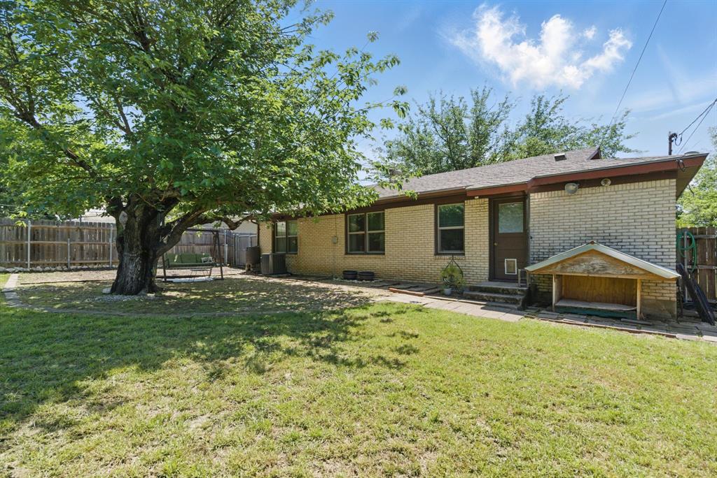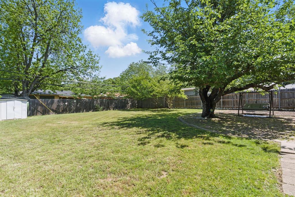 The spacious fenced backyard includes a storage building and even a dog house — perfect for pets, gardening, or relaxing in your own private space.