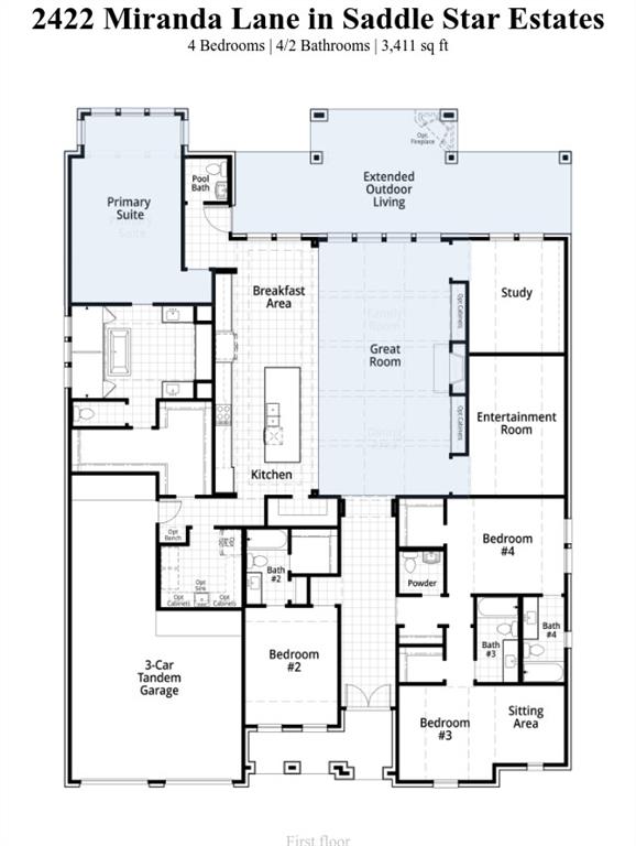 MLS# 20915729 - Built by Highland Homes - August completion! ~ 1-story, 4 Bedrooms, 4 Bathrooms, 2 Powder Baths, Great Room, Entertainment Room, Study, Oversized Outdoor Living Area, 3 Car Tandem Garage. Impressive new open plan from our Positano Collection on the greenbelt. Kitchen and Great room are open and airy, large island with sink, abundant cabinetry & counter space, private primary suite with sitting area, oversized shower with 2 shower heads, free-standing rectangular tub and access through the primary closet to the laundry room, upgraded double entry doors with glass, wood flooring slowing from the entry to the main living areas and into the primary bedroom and study, many tile upgrades...must see this beauty!