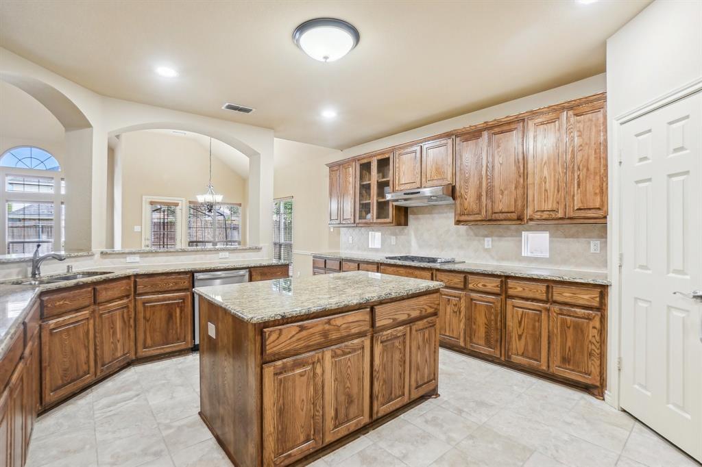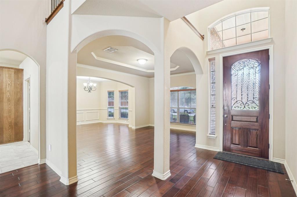 Welcome to 1001 Sanderling Drive, a stunning customized Brentwood model built by First Texas Homes, located in the heart of Garland, Texas. This expansive residence offers five generously sized bedrooms, four full bathrooms, and one half bathroom, perfectly blending luxury, functionality, and thoughtful design. Step onto the inviting front porch and into a home designed with comfort and privacy in mind. The custom-tinted windows not only enhance energy efficiency but also provide a sleek, modern aesthetic and added seclusion. The spacious layout includes two bedrooms on the main floor, including the luxurious primary suite and a secondary bedroom, each with its own private bath—ideal for multi-generational living or guest accommodations. Inside, the home is equipped with a central vacuum system, including a convenient suction vent in the kitchen that makes everyday cleanups effortless. Upstairs, a massive game room offers endless possibilities for entertainment and recreation. A standout feature of this property is the oversized three-car garage, providing ample space for vehicles, storage, or even a workshop setup. Outdoors, the property truly shines with a beautifully landscaped yard featuring mature, fruit-producing peach, pear, pomegranate, and fig trees. The covered patio is ready for your dream outdoor kitchen or entertainment area, with existing rough-ins for water, sewer, and gas connections. Additional upgrades include a recently replaced roof with high-quality shingles and a modern tankless hot water heater, ensuring long-term efficiency and peace of mind. 1001 Sanderling Drive is a rare blend of custom craftsmanship and smart enhancements, ready to welcome you home. Information provided is deemed reliable, but is not guaranteed and should be independently verified by the buyer.