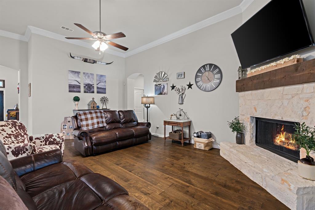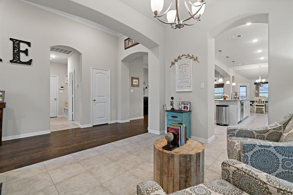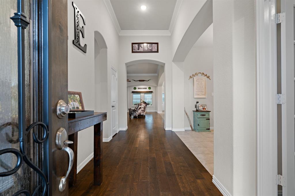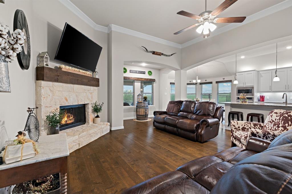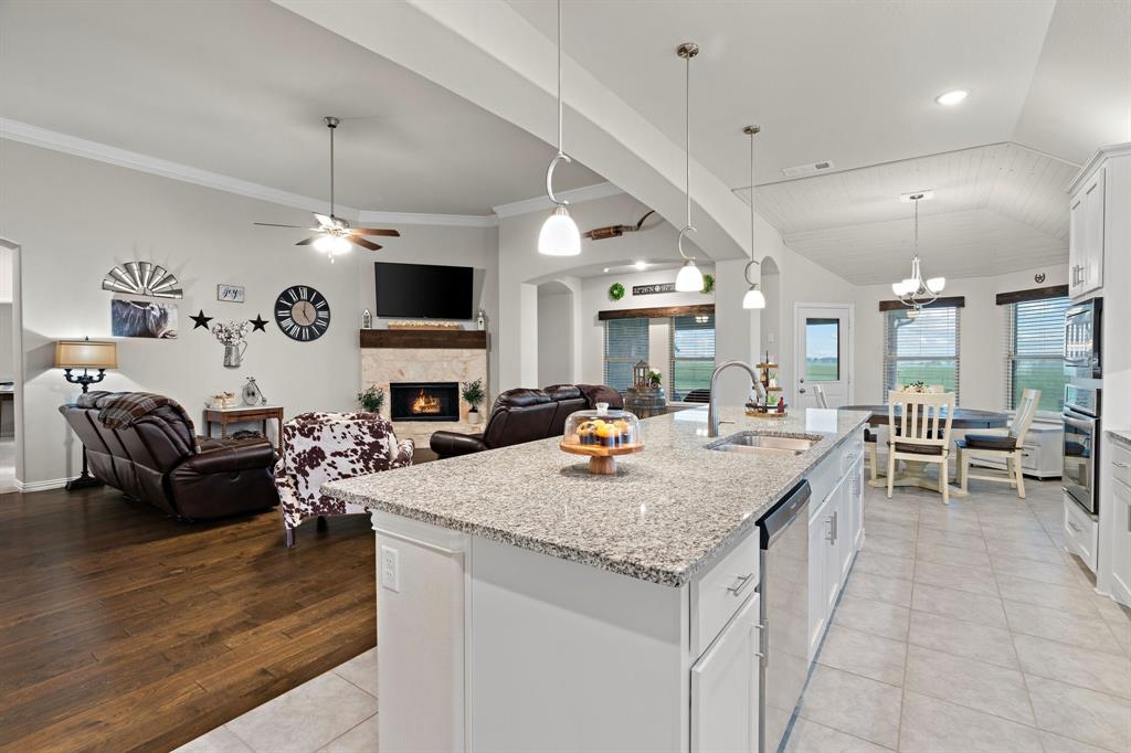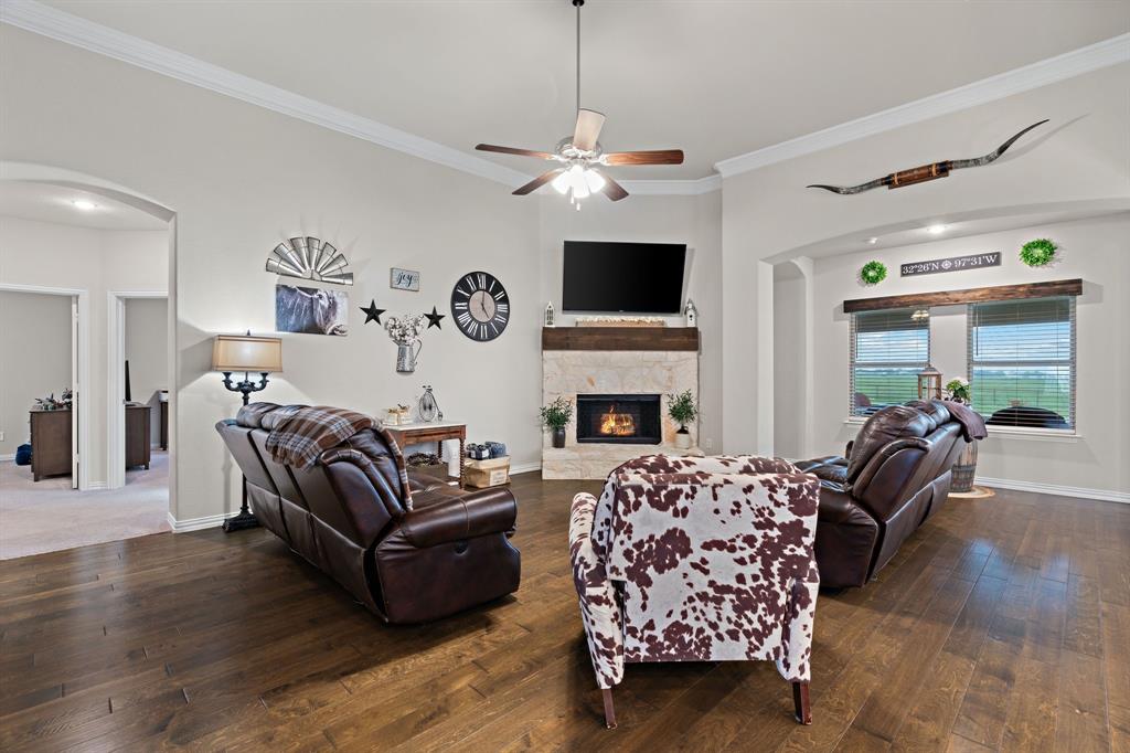 Welcome to the ultimate winning ticket! This exceptional property is a true trifecta — offering a beautiful home, a fully equipped 20x20 shop, and a sparkling saltwater pool — all perfectly positioned to lead you straight to the winner’s circle. This stunning 4-bedroom, 3-bath ranch-style home sits on 1.4 acres, offering unobstructed views of a pristine 160+ acre ranch. The open-concept kitchen, dining, and living spaces are perfect for both everyday living and entertaining. The kitchen is truly a chef’s dream, anchored by an impressive 11+ foot island that invites family and friends to gather around. Elegant crown molding, a grand corner fireplace, and exquisite crown molding details complete the large living room. Enjoy privacy with a split-bedroom layout and take advantage of the spacious office — ideal for remote work, with high-speed fiber internet already in place. Step outside to your private backyard oasis featuring a gorgeous saltwater pool and attached spa, finished with a durable and elegant PebbleTec bottom. Car enthusiasts and hobbyists alike will appreciate the oversized 3-car-attached garage and the additional 20x20 shop, complete with 110 electricity and dual roll-up doors to let the fresh country breeze flow through. This property offers the perfect blend of luxury, comfort, and functionality — all with breathtaking country views just beyond your backyard. Don’t miss your chance to bet on a sure thing.