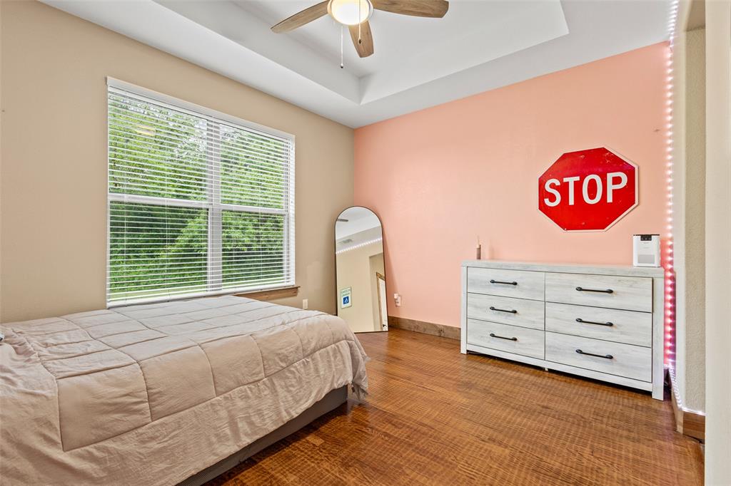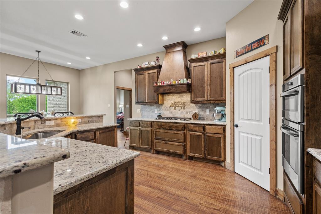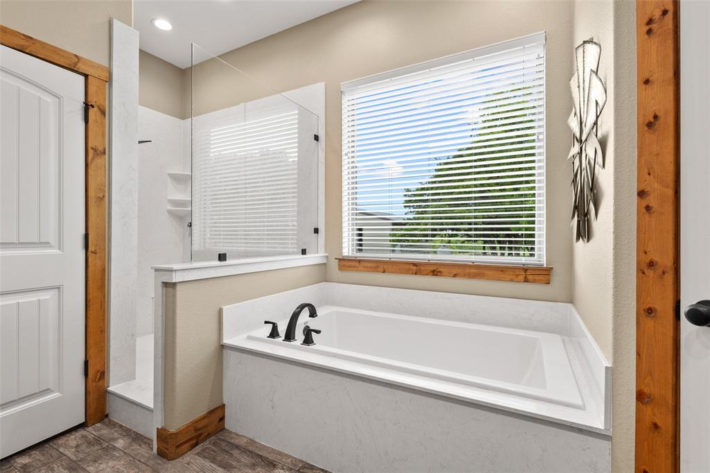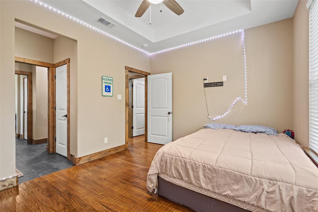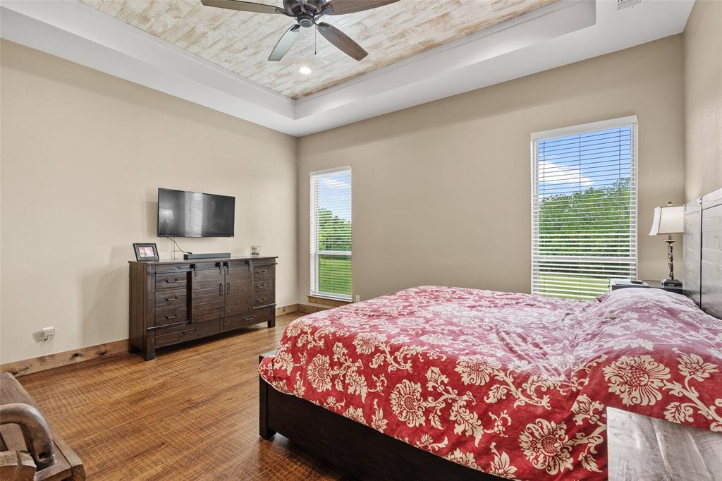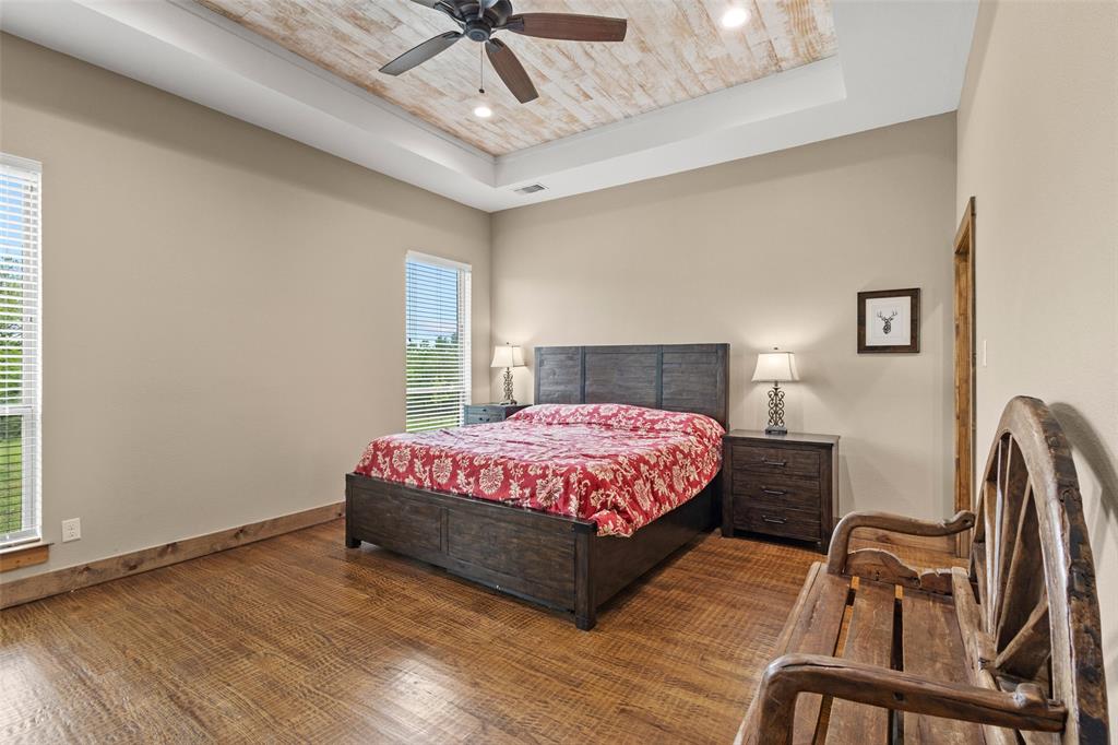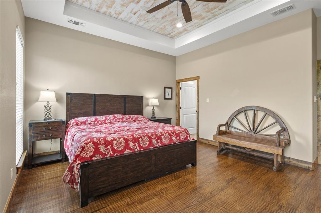 Inside, you'll find rich hand-scraped wood floors, elegant tray ceilings in the master suite, and a seamless connection from the master closet straight into the laundry room for unmatched convenience. The cozy living room features a propane fireplace, while an additional fireplace on the back patio creates the perfect outdoor gathering spot year-round.