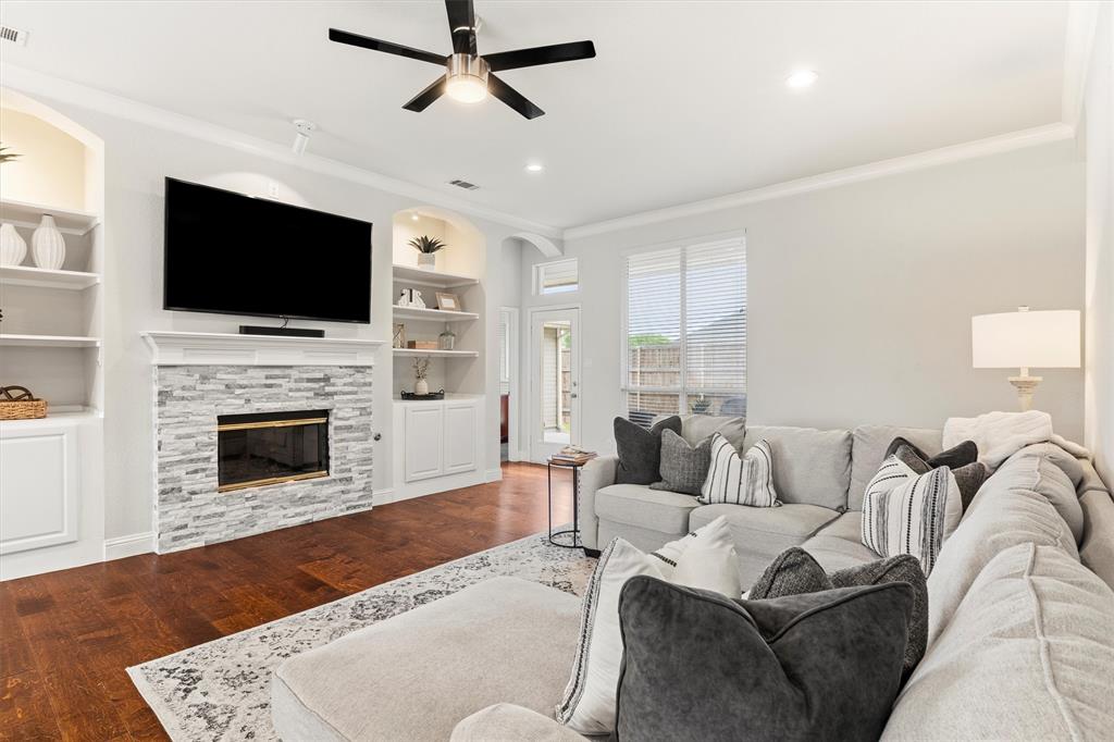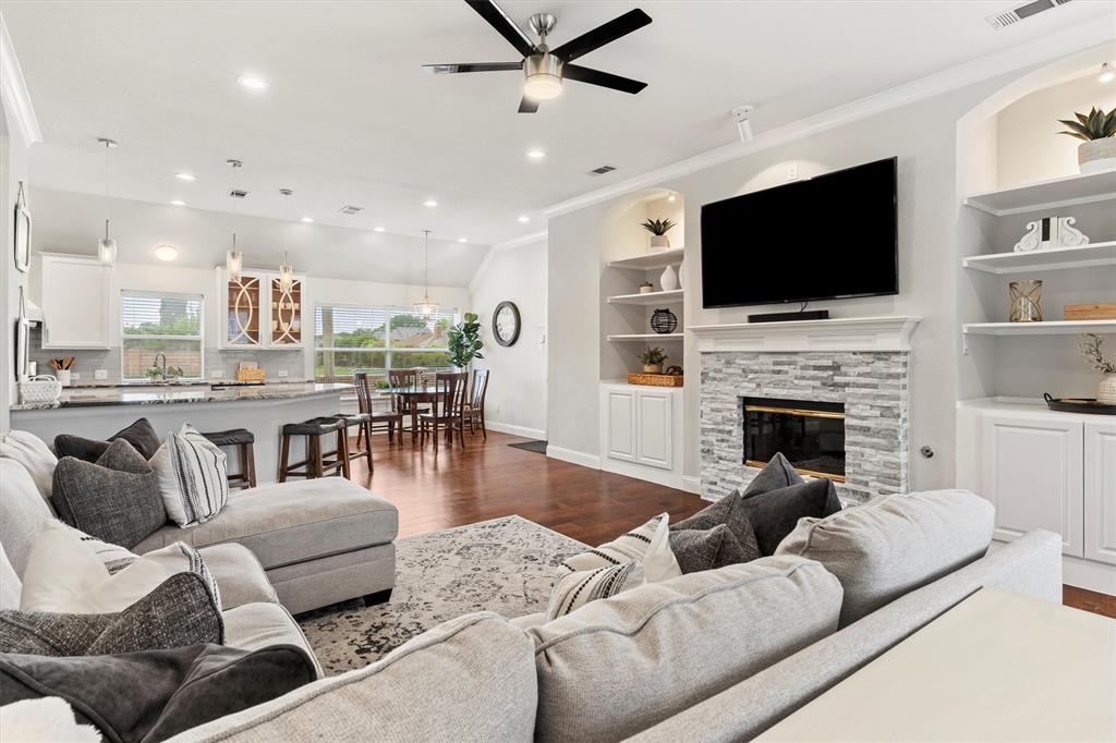 The heart of the home is the modern kitchen, showcasing beautiful granite countertops, a classic subway tile backsplash, and stainless steel appliances—perfect for both everyday living and entertaining. The spacious living area includes a striking fireplace framed by built-in shelving, offering both style and utility. Ample natural light enhances the welcoming feel throughout.