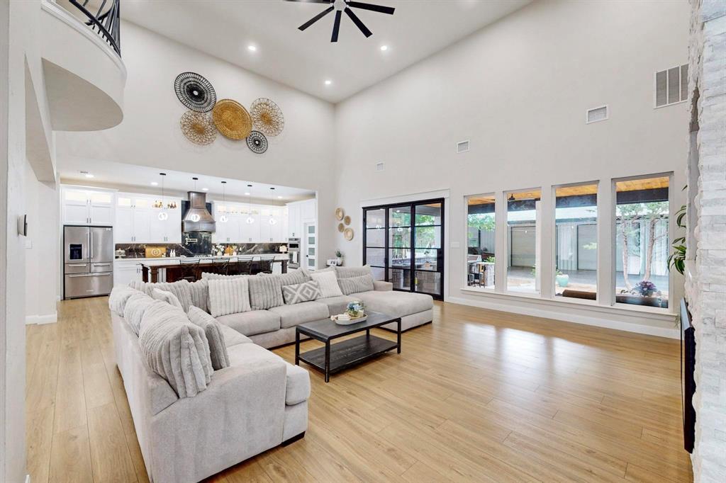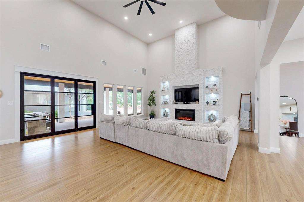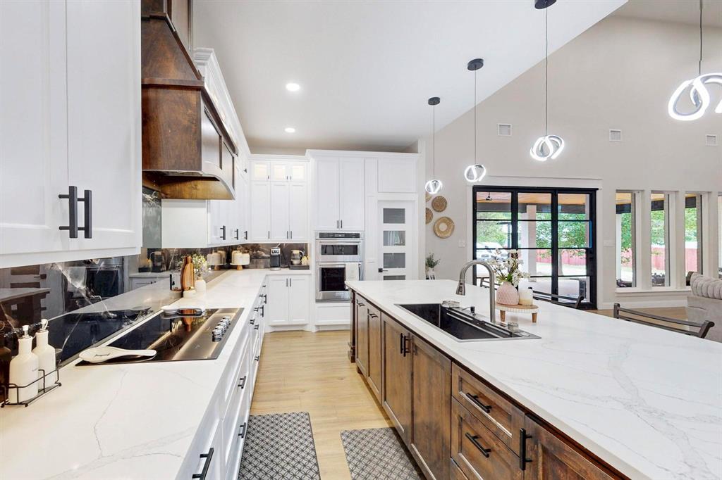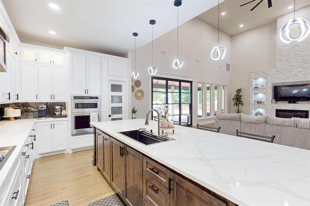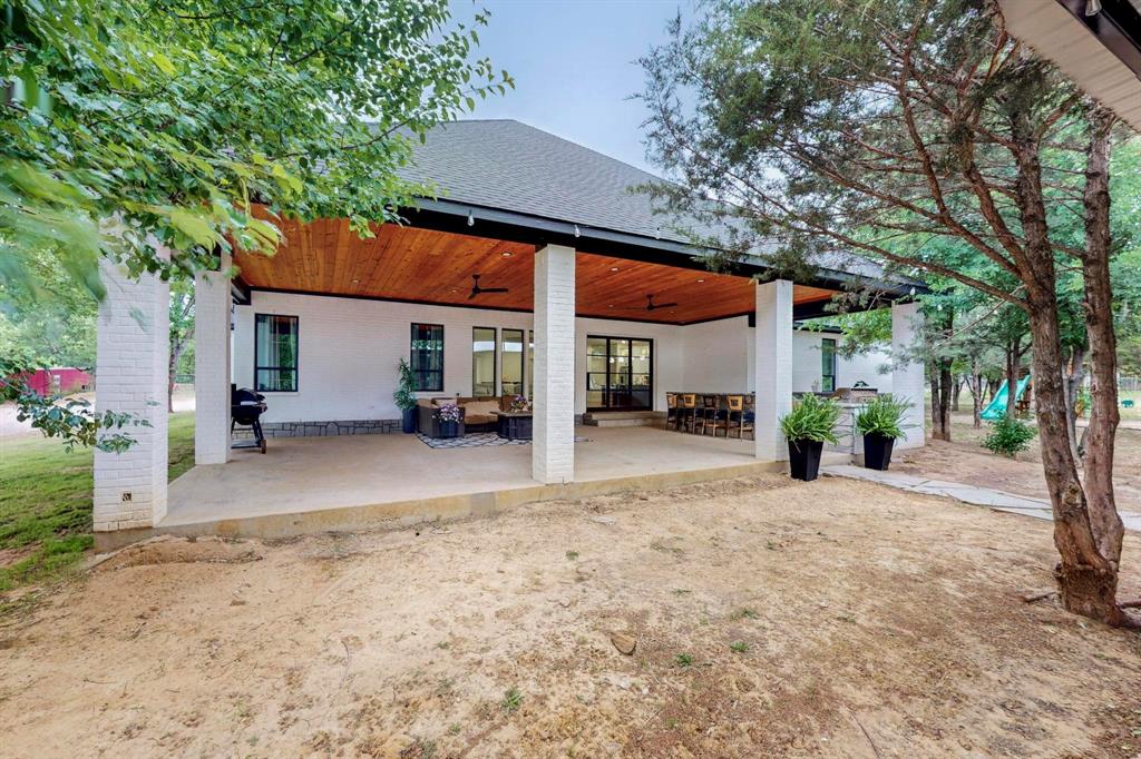 The outdoor living area is equally impressive, with a large covered back porch and outdoor kitchen, perfect for relaxing evenings or lively gatherings,