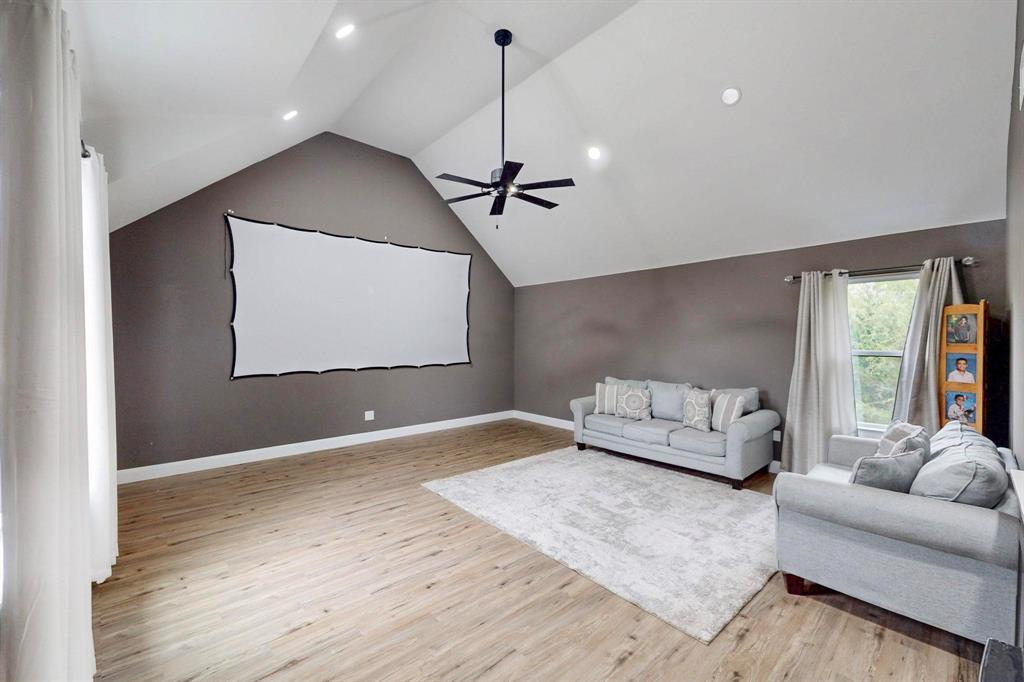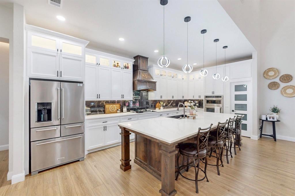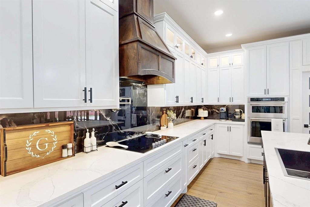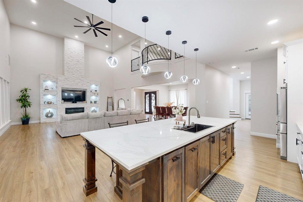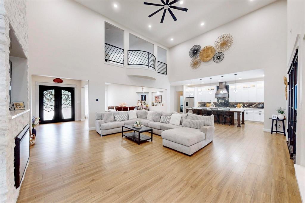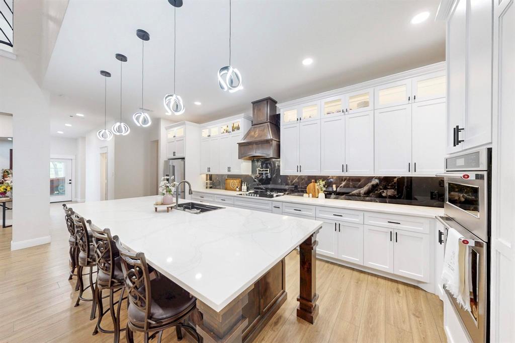 The outdoor living area is equally impressive, with a large covered back porch and outdoor kitchen, perfect for relaxing evenings or lively gatherings,