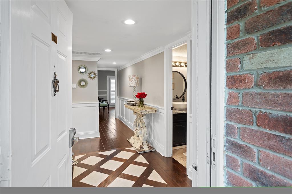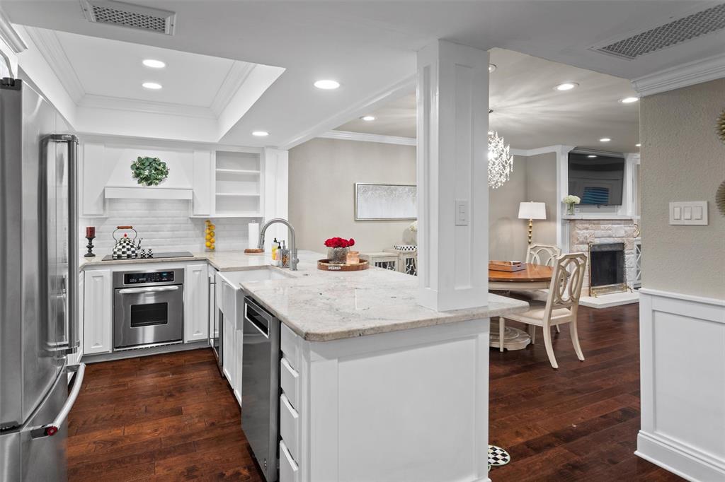 TASTEFULLY REMODELED AND UPDATED first floor condo with double patio and view of pool. Conveniently located near parking area and your own golf cart garage or storage area. Prepare to be impressed. Step inside to discover a freshly painted and modernized, open concept condo. Beautiful hardwood floors throughout except for tile baths. Exquisite chandeliers and numerous canned lights brighten the entire kitchen and living area. Custom finishes, such as triple crown molding and custom baseboards, add a touch of elegance at every turn. Kitchen boasts pretty white custom cabinets with solid and glass doors (lighted) and open shelving, under counter lighting, slide out spice racks, top-tier granite, 3-D subway tile backsplash, custom range hood, built-in wine cooler, stainless appliances and farmhouse sink and new faucet. SS Kitchen-Aid appliances Super-wide counter extends into dining area with room for four bar stools. Handsome Austin stone fireplace with custom trim surrounds and adjacent built-in shelves for books, photos and ornamentals. Living room and primary bedroom have access to patio; plantation shutters on doors. Primary bath features separate shower, granite countertop and two sinks. Guest bath has granite counter and a classy vessel sink. New toilets and light fixtures in bathrooms. Unit has one covered and one uncovered parking space. Golf cart garage has an automatic opener that can be accessed with keypad or remote. Perfect downsize home or weekend getaway. Walking distance to clubhouse.