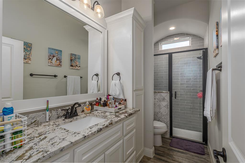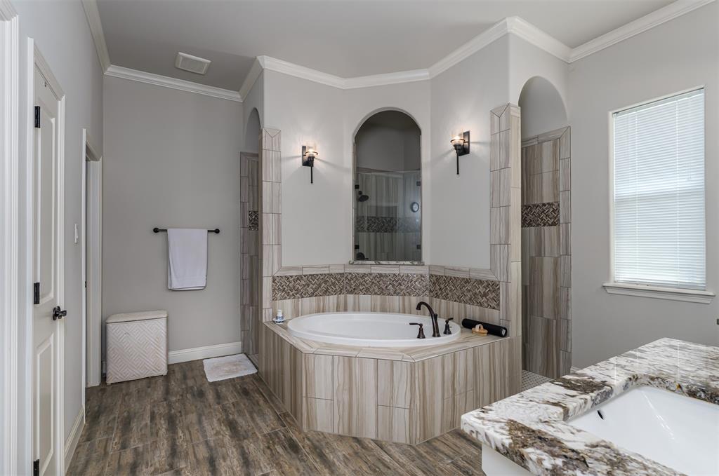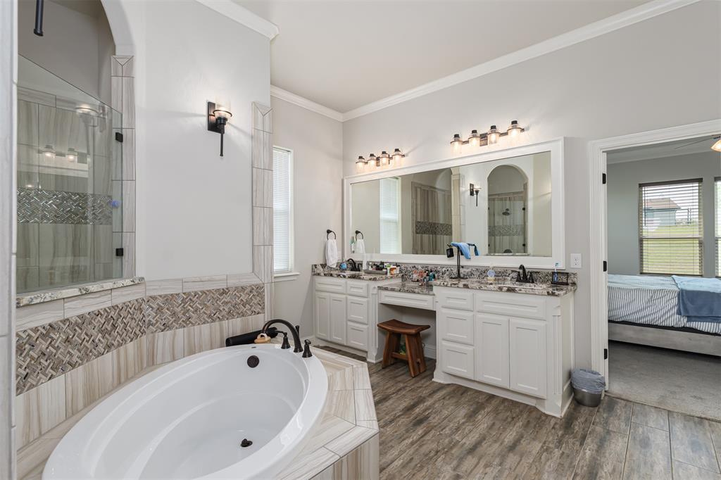 The kitchen is a standout feature with its large island, granite countertops, and modern design—ideal for everyday living and gatherings. The primary suite offers a peaceful retreat with an ensuite bath that includes a separate shower, dual sinks, and a garden tub for soaking.