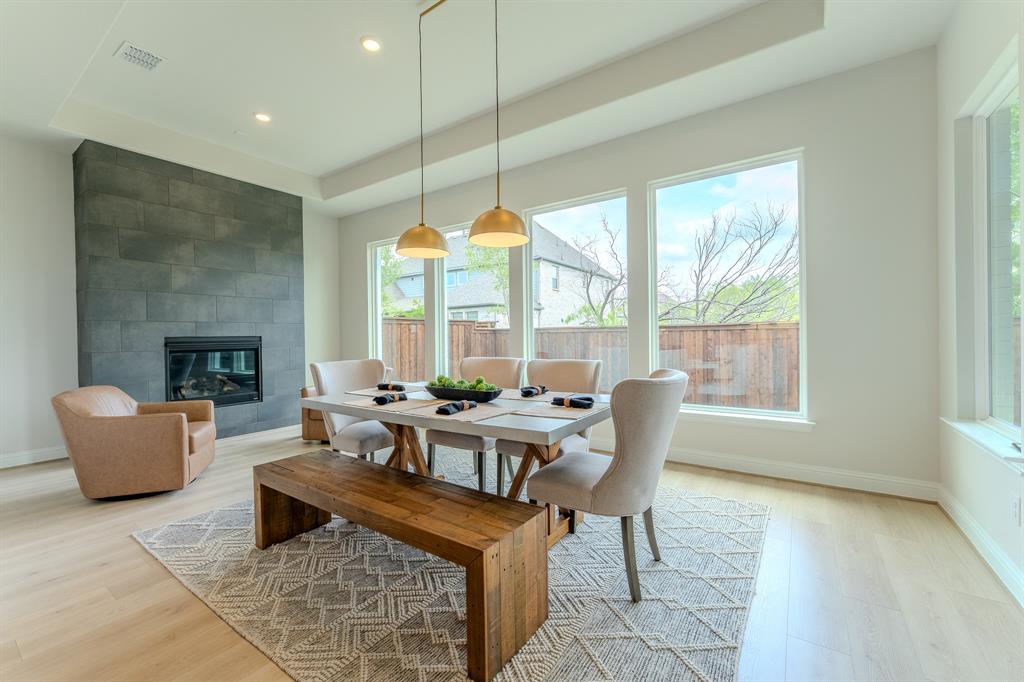Just off the kitchen, a cozy hearth room with a fireplace creates the perfect corner for slow mornings or intimate dinners.