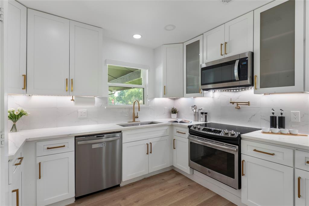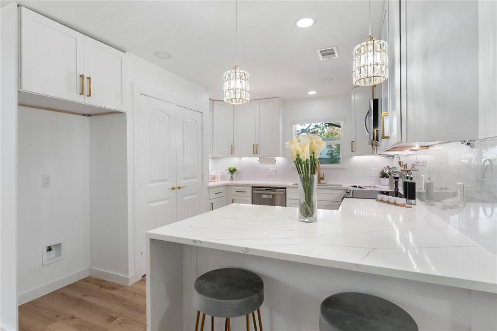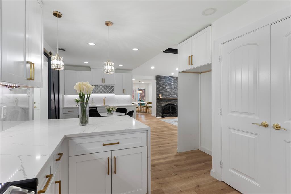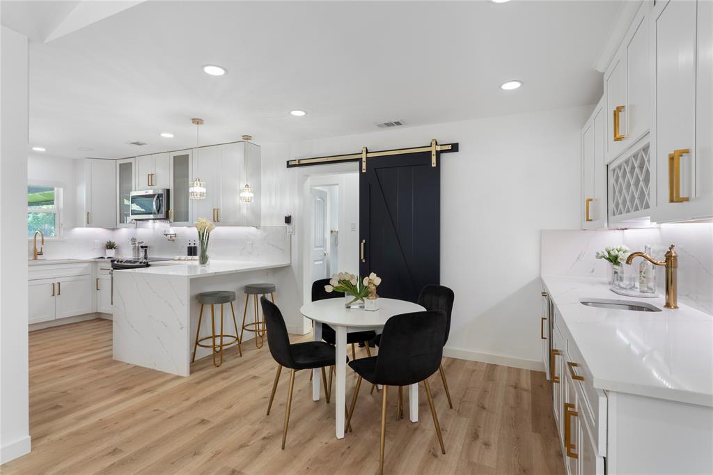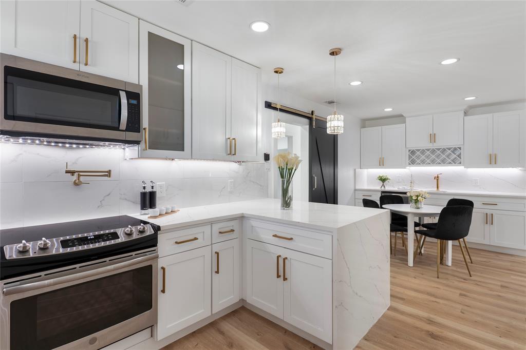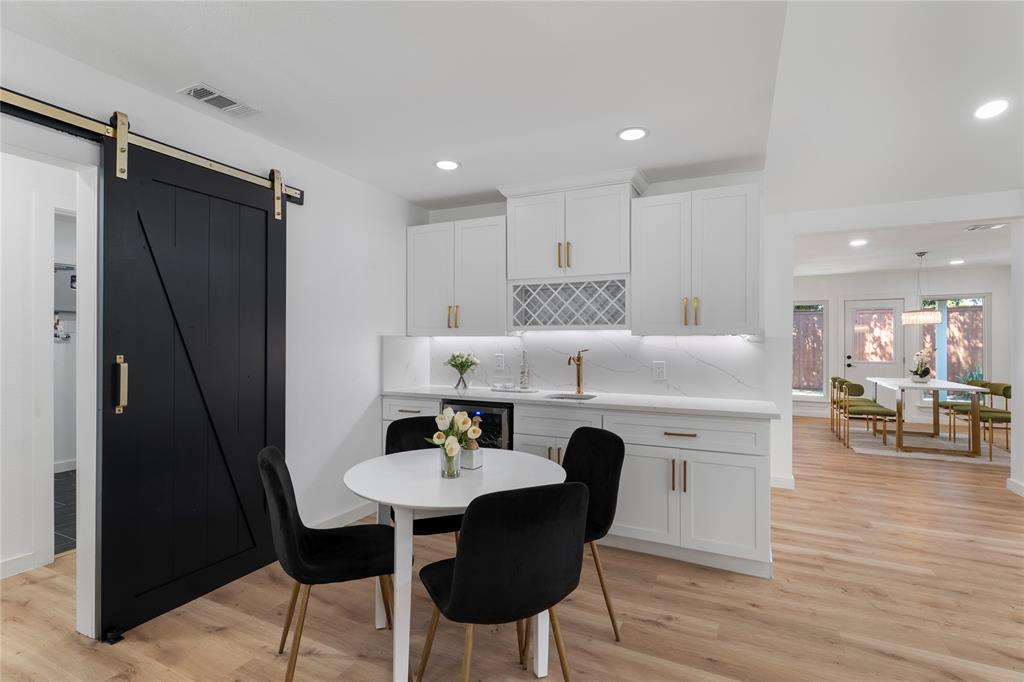 The gourmet kitchen is a true showstopper, boasting quartz countertops, an oversized pantry, and a convenient pot filler. A nearby breakfast area includes built-in cabinetry, a prep sink, and a beverage refrigerator—ideal for serving and storage.