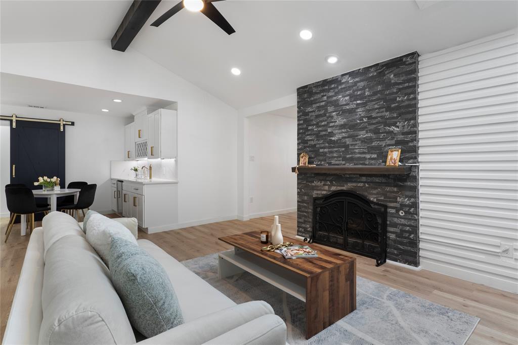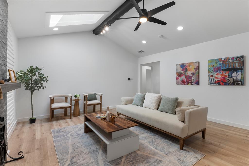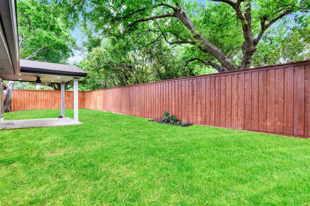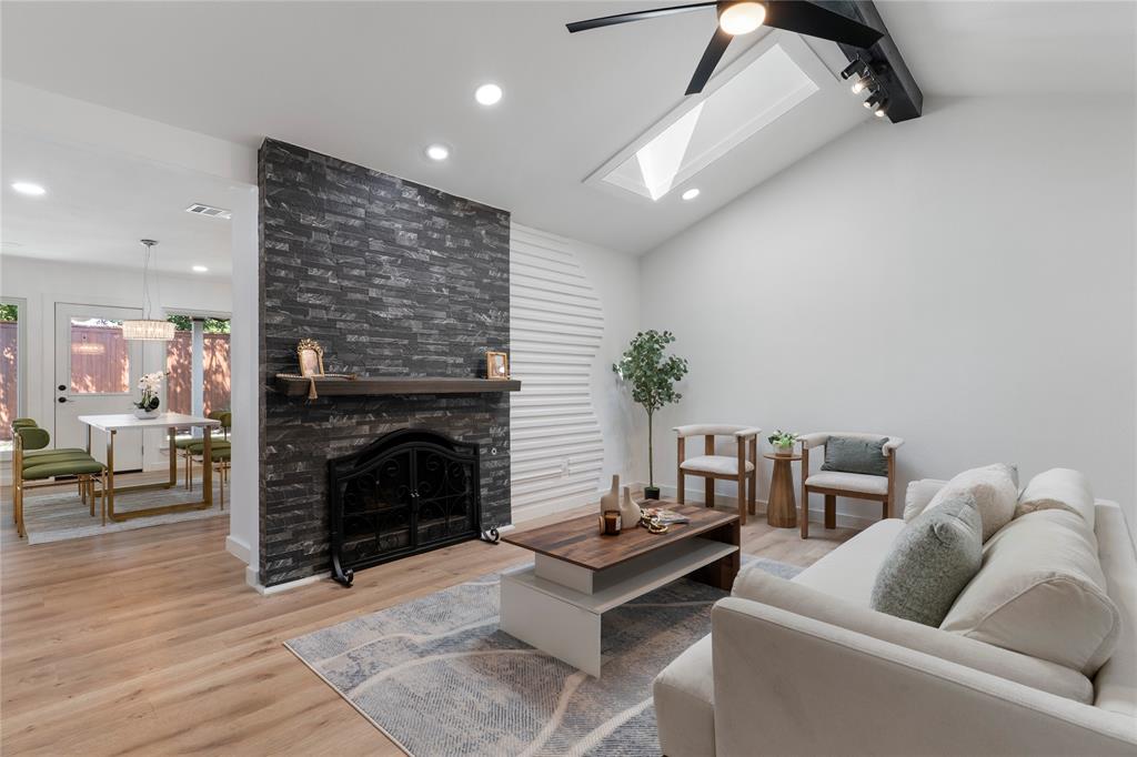 The expansive living room with a cozy fireplace flows seamlessly into the dining area, which overlooks the large, private backyard. Enjoy outdoor living year-round on the oversized covered porch surrounded by a board-on-board privacy fence and mature trees.