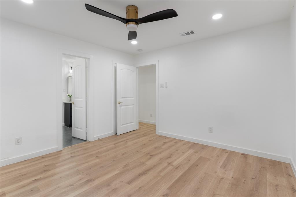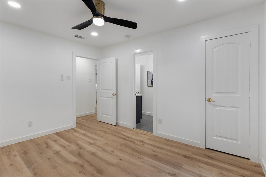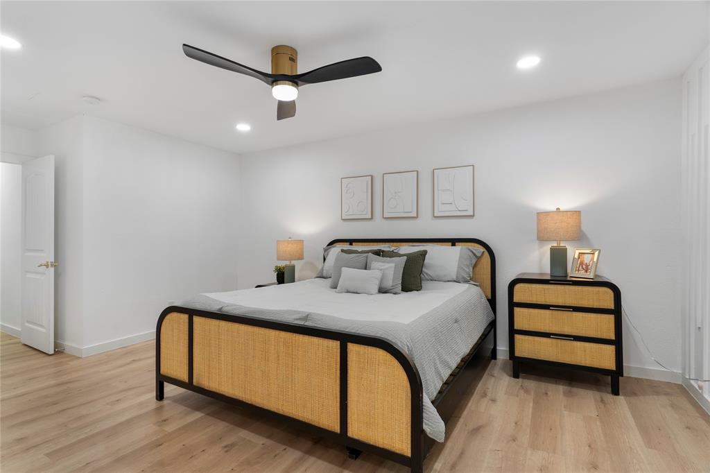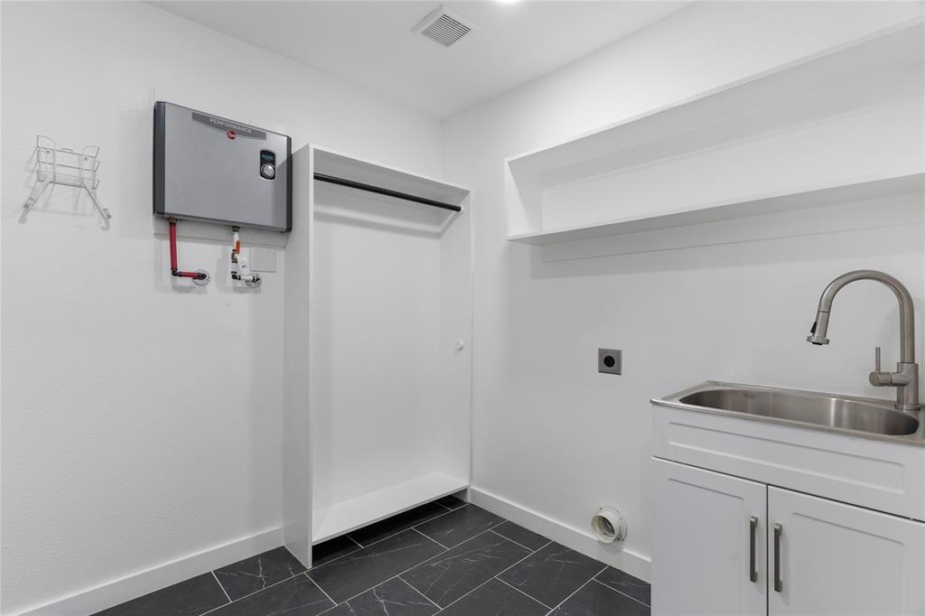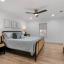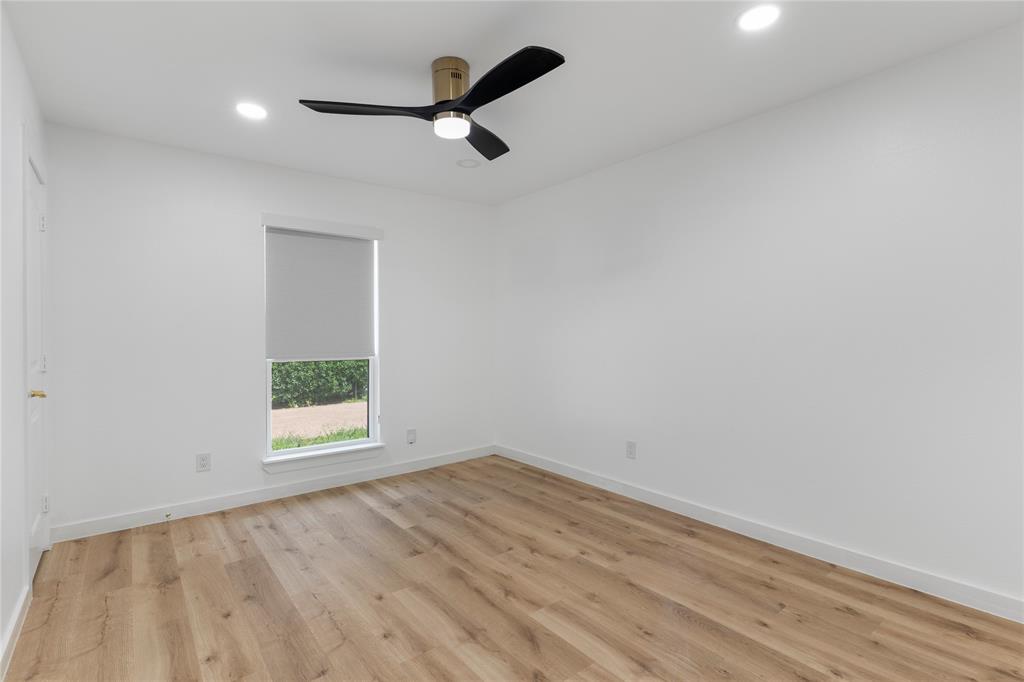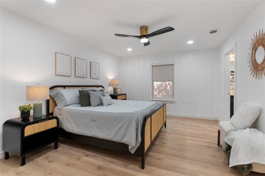 Retreat to the luxurious primary suite complete with a spa-like ensuite featuring dual sinks, a garden tub, a large walk-in shower, and a custom-built walk-in closet. On the opposite side of the home, a sliding barn door offers privacy to a spacious bedroom, full bath, and an oversized laundry room with tankless water heater and ample storage.