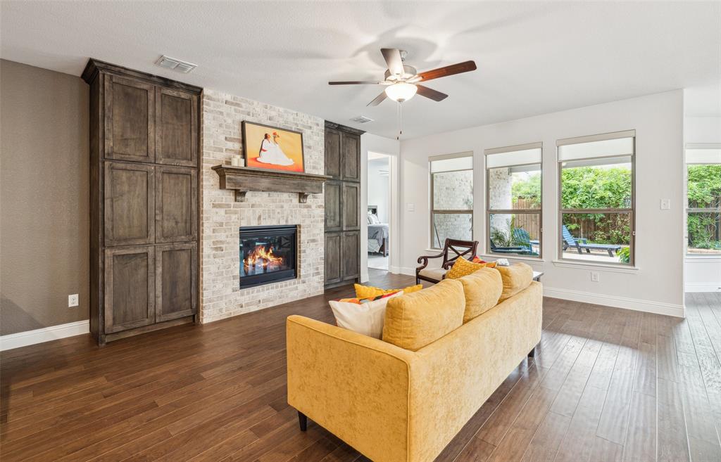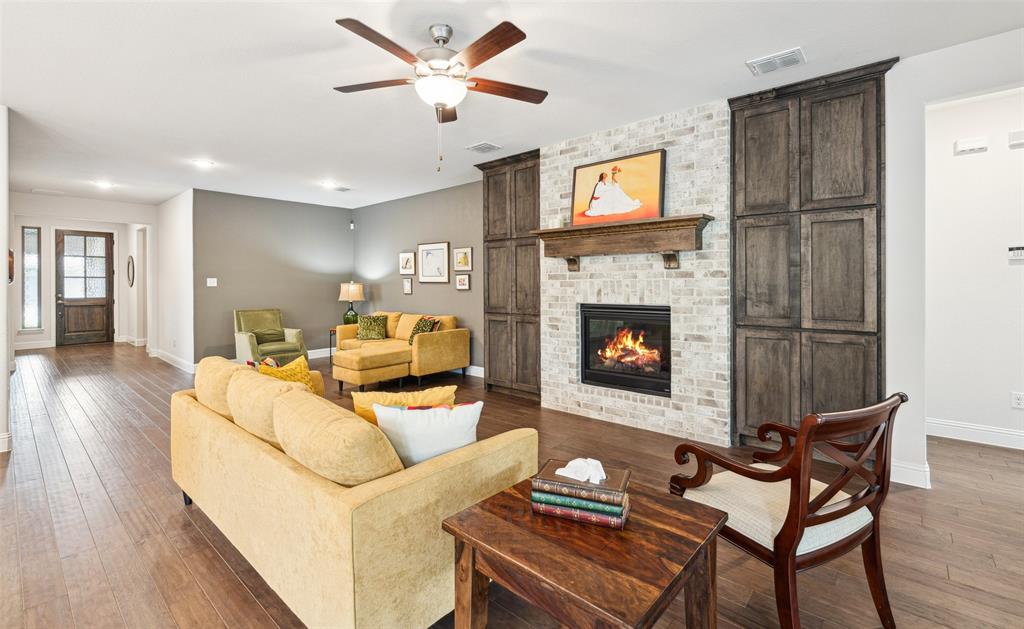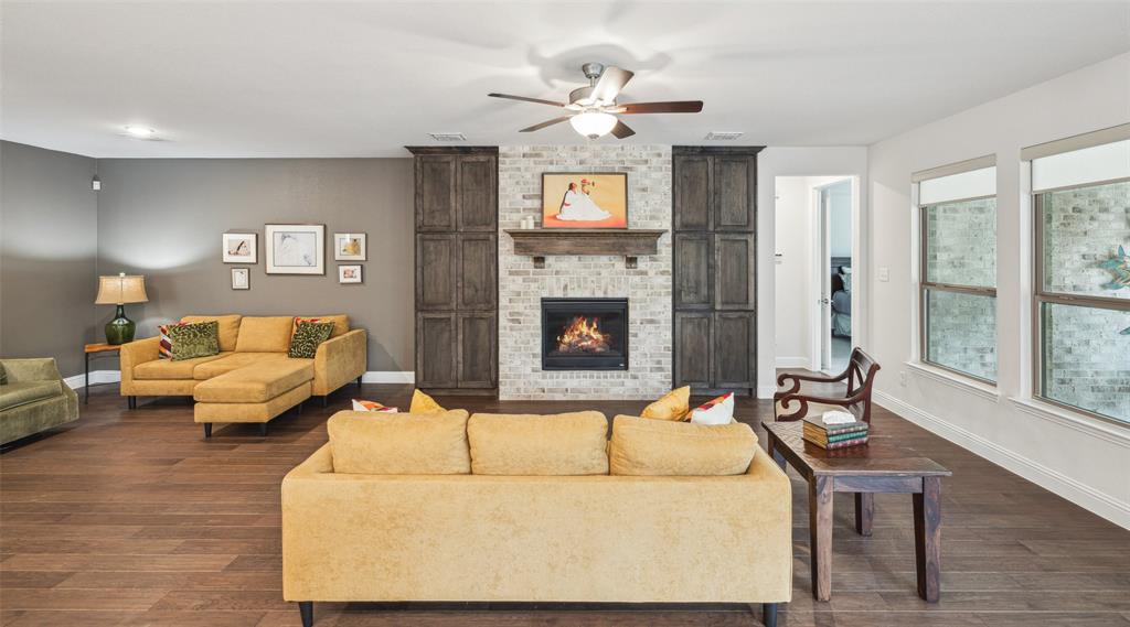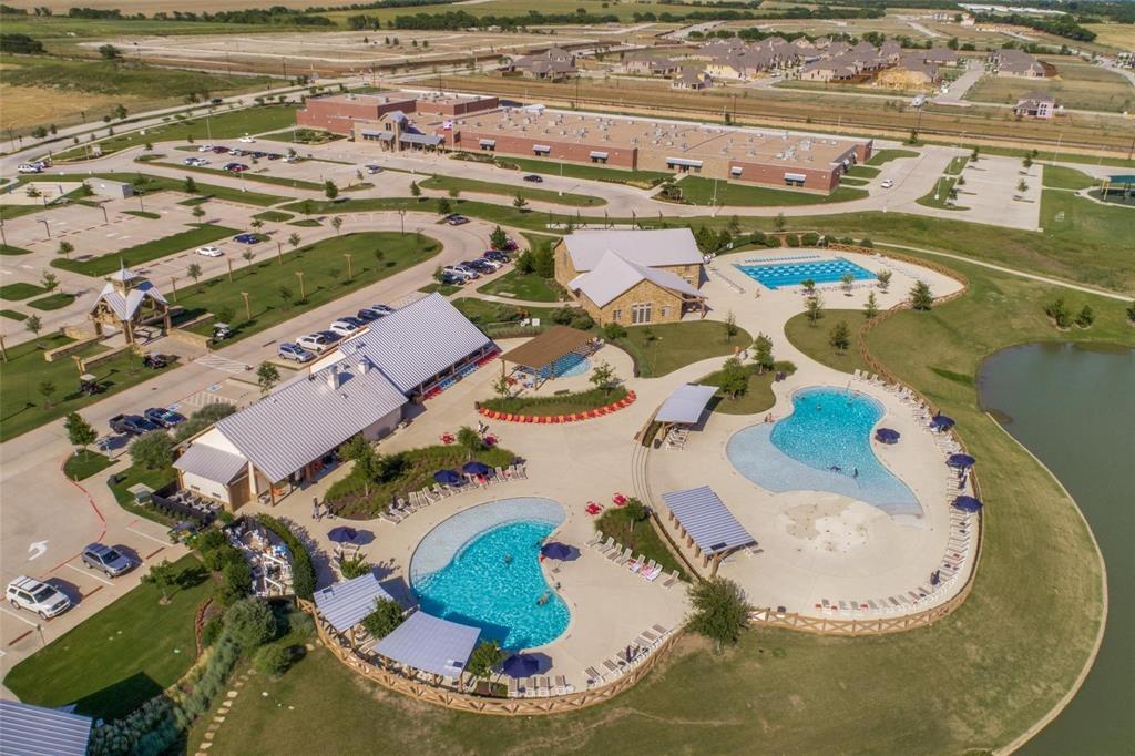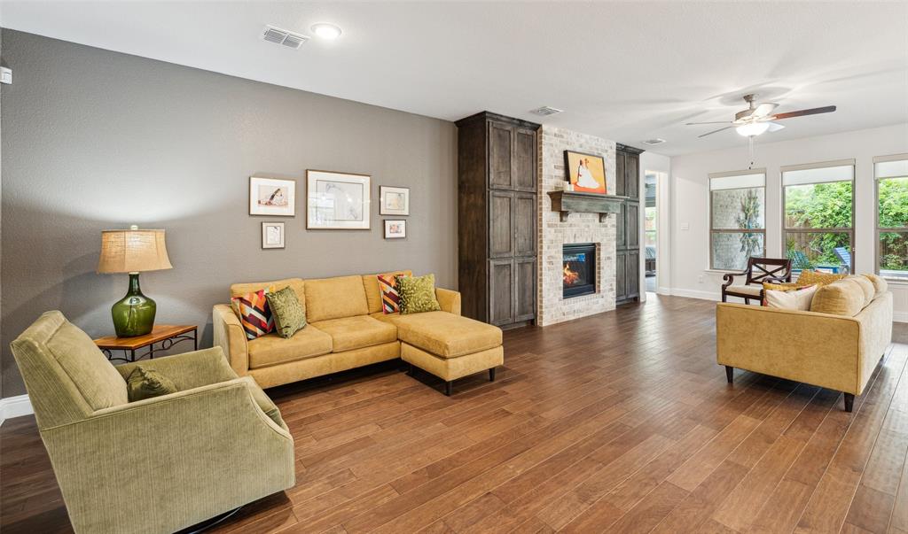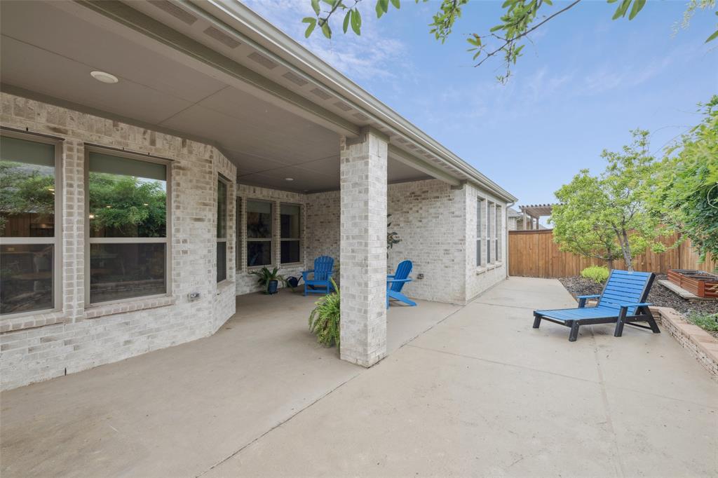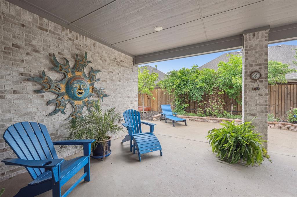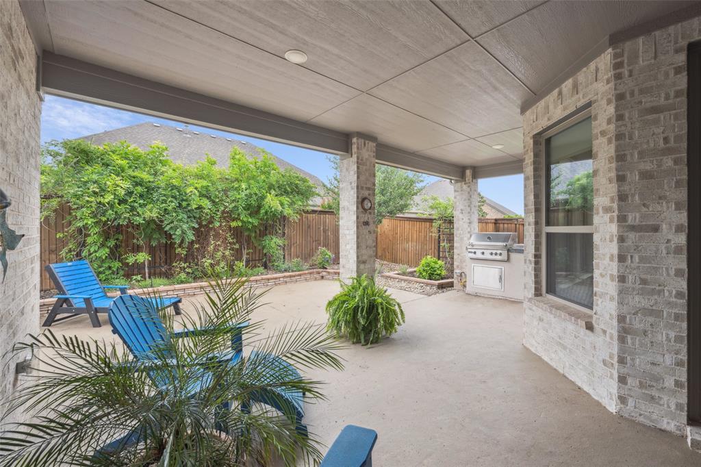 Welcome to your dream home in the highly sought-after Light Farms Sweetwater subdivision—where luxury meets lifestyle. This spacious one-story beauty combines functional elegance with high-end finishes and custom touches throughout. Step inside to find rich wood flooring and sleek roller shades adorning every window, setting the tone for the home’s modern yet warm aesthetic. The expansive living room boasts a striking brick fireplace with gas logs, custom built-ins, and flows seamlessly into a chef-worthy kitchen featuring quartz countertops, 42” custom cabinetry, double oven, farmhouse sink, gas cooktop, walk-in pantry, and a generous island with seating—perfect for entertaining and everyday living. The primary suite offers a serene retreat with views of the private backyard and a luxurious bath featuring an oversized walk-in shower, dual sinks with quartz countertops, a linen closet, and medicine cabinets. Two additional bedrooms provide versatile space, one showcasing a Murphy bed and custom built-ins—ideal for guests or a home office. Enjoy movie nights in your dedicated media room with surround sound, and keep things tidy with a built-in mudroom. The garage is a true standout with epoxy flooring and a ceiling fan for added comfort. Step outside to your own oasis: a wrap-around covered patio with a built-in gas grill, surrounded by lush landscaping including wisteria, honeysuckle, holly trees, and live oak—all enhancing the sense of privacy and tranquility. Brand new roof and gutters add even more value to this meticulously maintained home. Living in Light Farms isn’t just about the home—it’s about the experience. Residents enjoy four resort-style pools, multiple parks and playgrounds, a state-of-the-art fitness center, hike & bike trails, tennis and sand volleyball courts, a dog park, fishing pond, and more! Don’t miss your chance to own this bright, open, and beautifully styled home in one of Prosper’s premier master-planned communities.