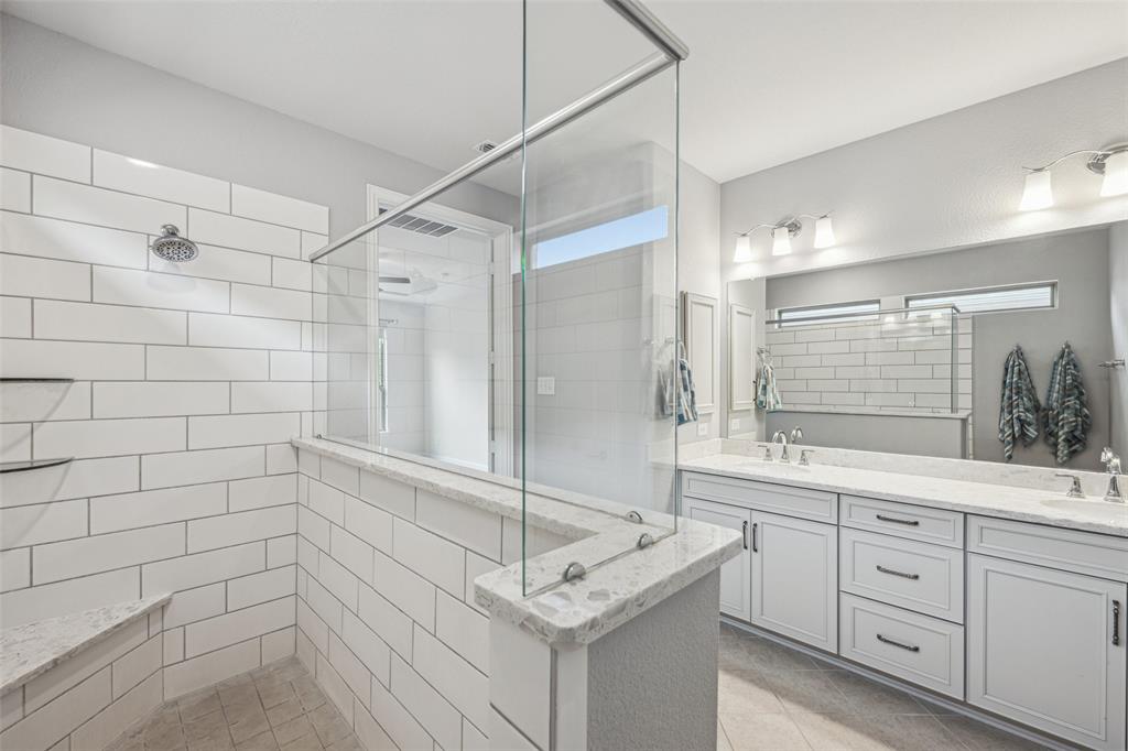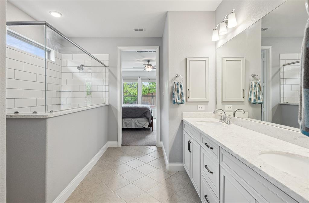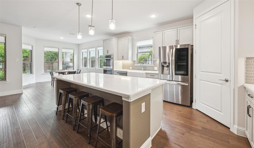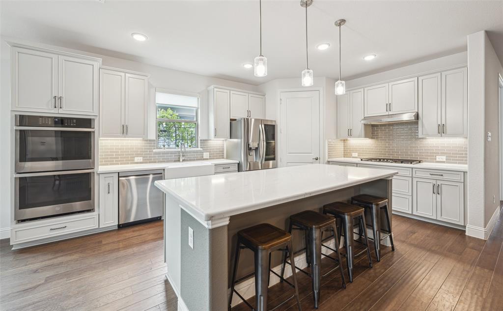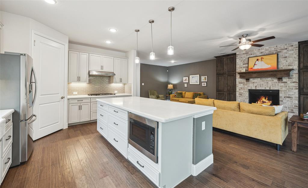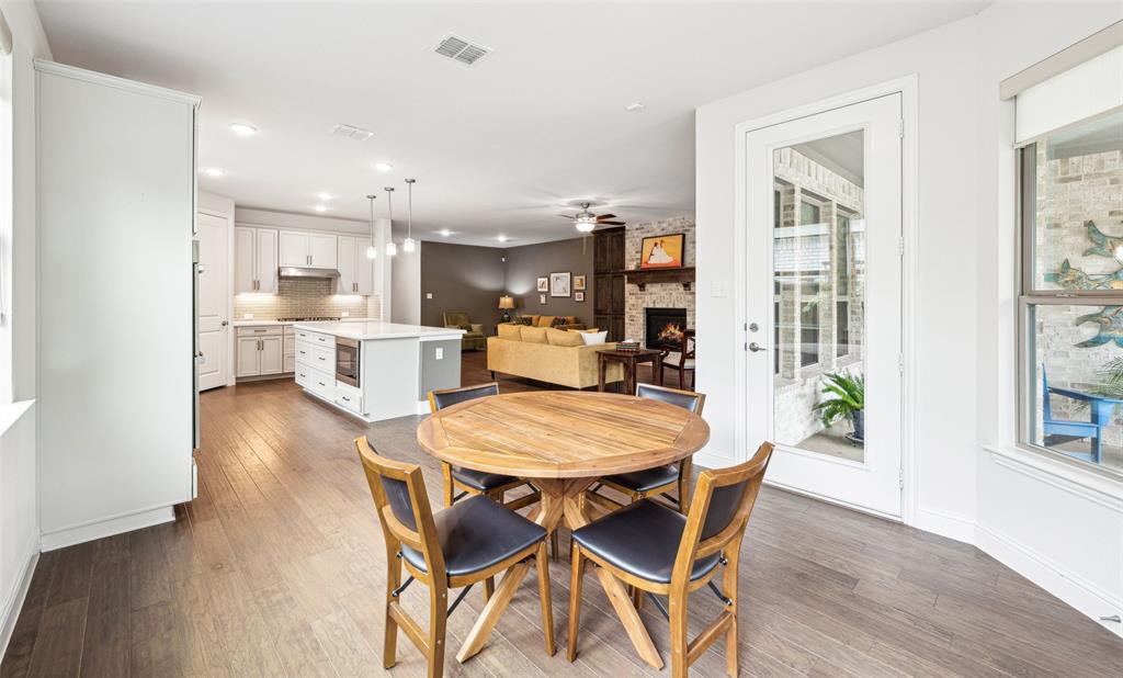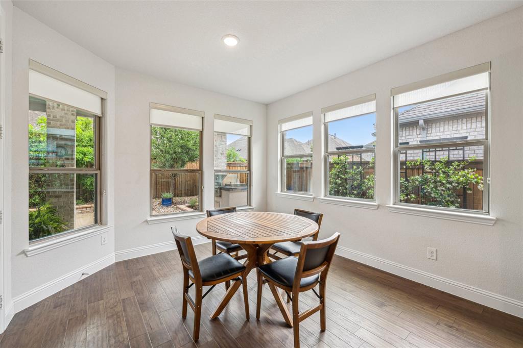 Welcome to your dream home in the highly sought-after Light Farms Sweetwater subdivision—where luxury meets lifestyle. This spacious one-story beauty combines functional elegance with high-end finishes and custom touches throughout. Step inside to find rich wood flooring and sleek roller shades adorning every window, setting the tone for the home’s modern yet warm aesthetic. The expansive living room boasts a striking brick fireplace with gas logs, custom built-ins, and flows seamlessly into a chef-worthy kitchen featuring quartz countertops, 42” custom cabinetry, double oven, farmhouse sink, gas cooktop, walk-in pantry, and a generous island with seating—perfect for entertaining and everyday living. The primary suite offers a serene retreat with views of the private backyard and a luxurious bath featuring an oversized walk-in shower, dual sinks with quartz countertops, a linen closet, and medicine cabinets. Two additional bedrooms provide versatile space, one showcasing a Murphy bed and custom built-ins—ideal for guests or a home office. Enjoy movie nights in your dedicated media room with surround sound, and keep things tidy with a built-in mudroom. The garage is a true standout with epoxy flooring and a ceiling fan for added comfort. Step outside to your own oasis: a wrap-around covered patio with a built-in gas grill, surrounded by lush landscaping including wisteria, honeysuckle, holly trees, and live oak—all enhancing the sense of privacy and tranquility. Brand new roof and gutters add even more value to this meticulously maintained home. Living in Light Farms isn’t just about the home—it’s about the experience. Residents enjoy four resort-style pools, multiple parks and playgrounds, a state-of-the-art fitness center, hike & bike trails, tennis and sand volleyball courts, a dog park, fishing pond, and more! Don’t miss your chance to own this bright, open, and beautifully styled home in one of Prosper’s premier master-planned communities.