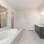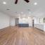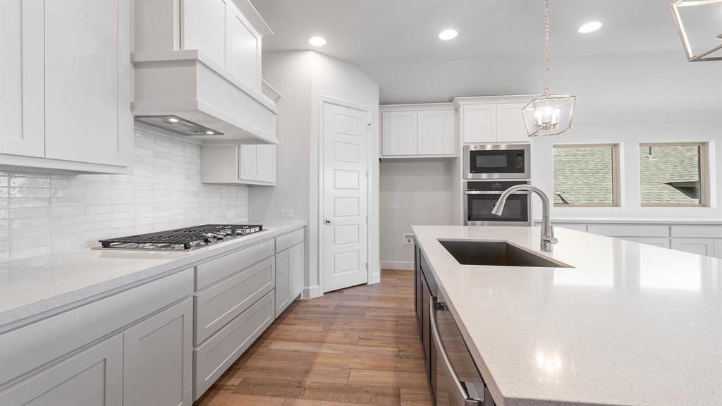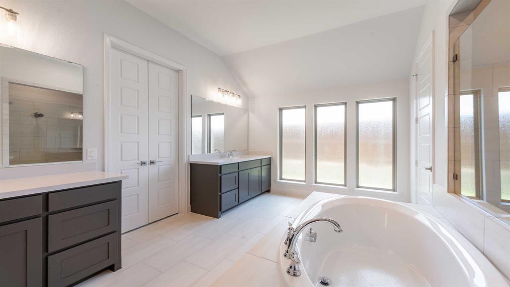 Home office with French doors set at entry with 12-foot ceiling. Extended entry highlights coffered ceiling. Open kitchen features generous counter space, corner walk-in pantry and island with built-in seating space. Dining area flows into open family room with a cast stone fireplace and wall of windows. Primary suite includes bedroom with wall of windows. Dual vanities, garden tub, separate glass-enclosed shower and two large walk-in closets in primary bath. A guest suite with private bath adds to this four-bedroom home. Covered backyard patio. Mud room off three-car garage that has additional garage bay space.