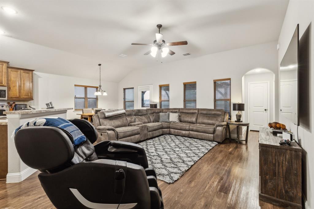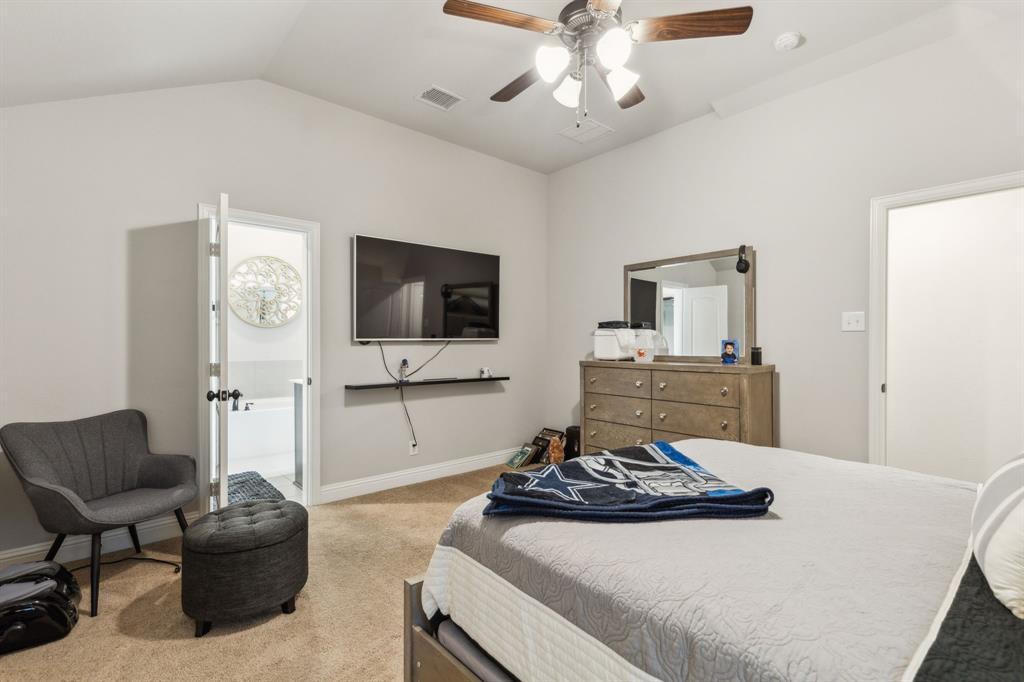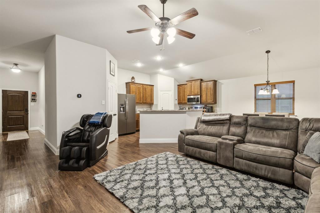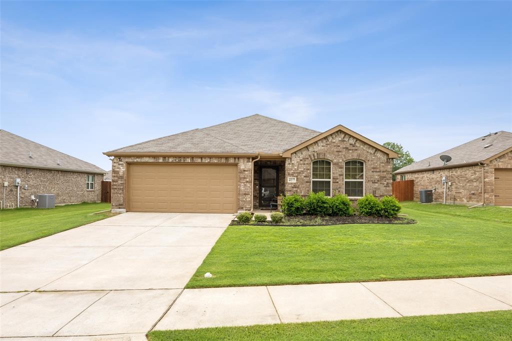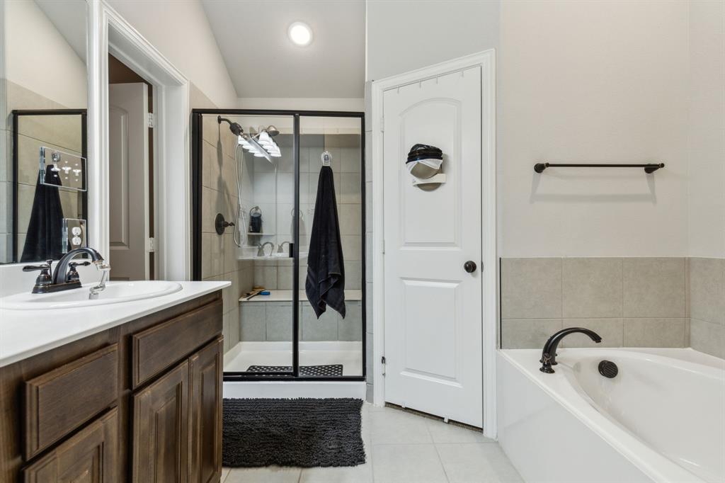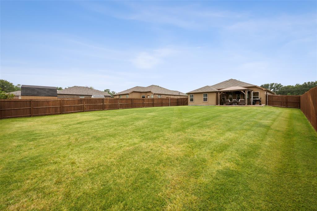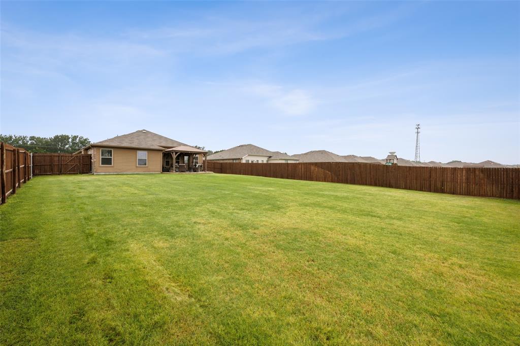 Experience comfortable one-level living in this charming 3-bedroom, 2-bathroom home, ideally situated just minutes from Route 377 in Aubrey, TX. Designed for both ease and style, the open-concept layout offers a seamless connection between the living room, dining area, and kitchen—highlighted by soaring ceilings and recessed lighting that create a bright, airy ambiance. The private primary suite is a peaceful retreat, featuring a walk-in closet, dual vanity, soaking tub, and a separate glass-enclosed shower. A walk-in laundry room adds convenience to the thoughtfully arranged floor plan. Step outside to enjoy a covered patio and a fully fenced backyard with wood fencing—perfect for relaxing or entertaining.