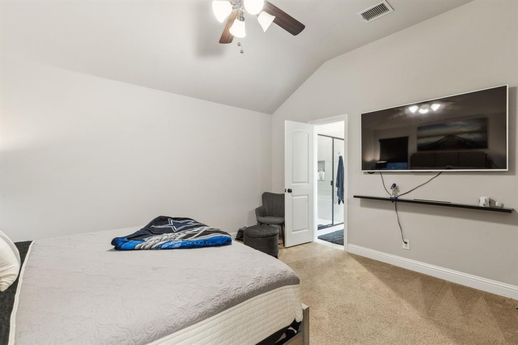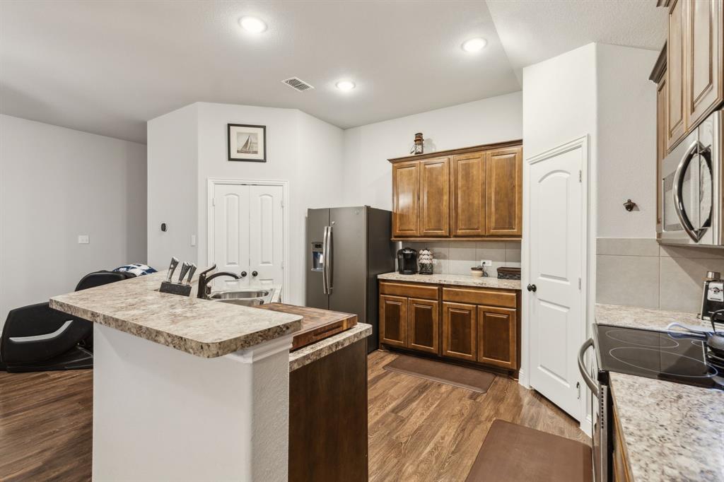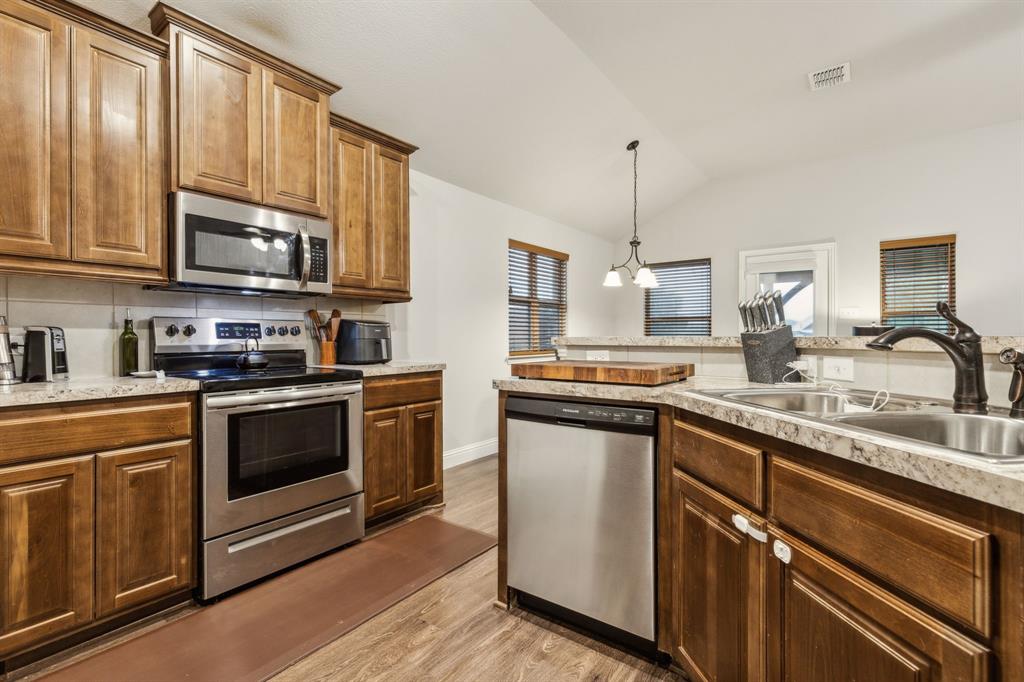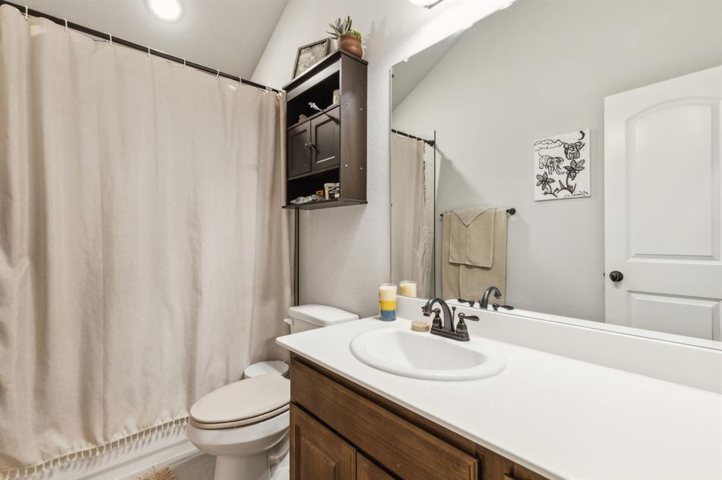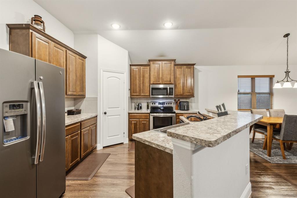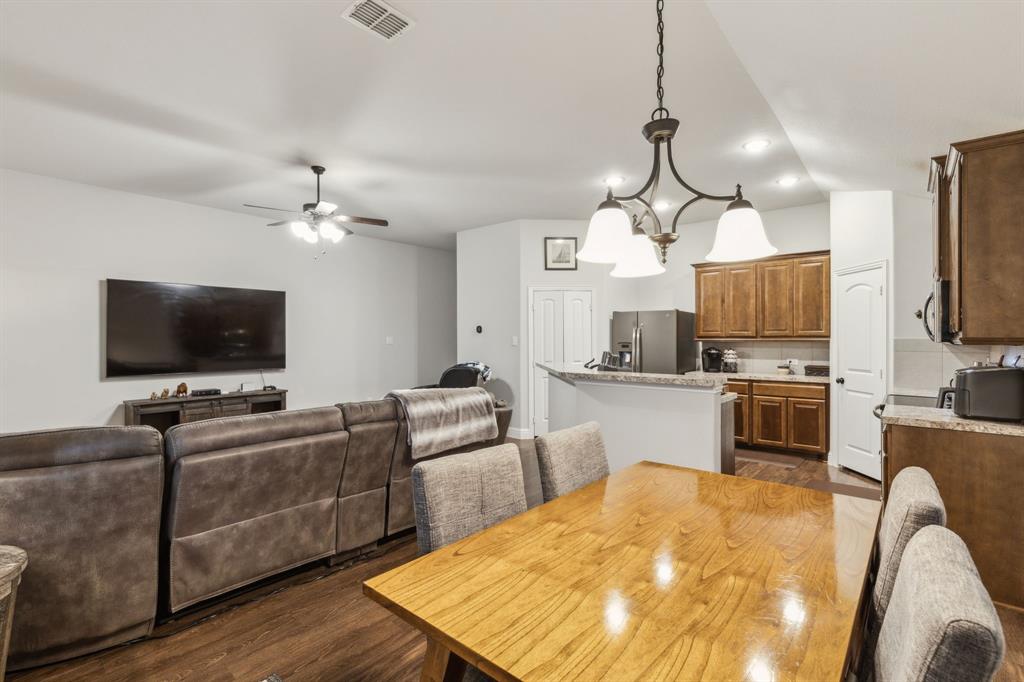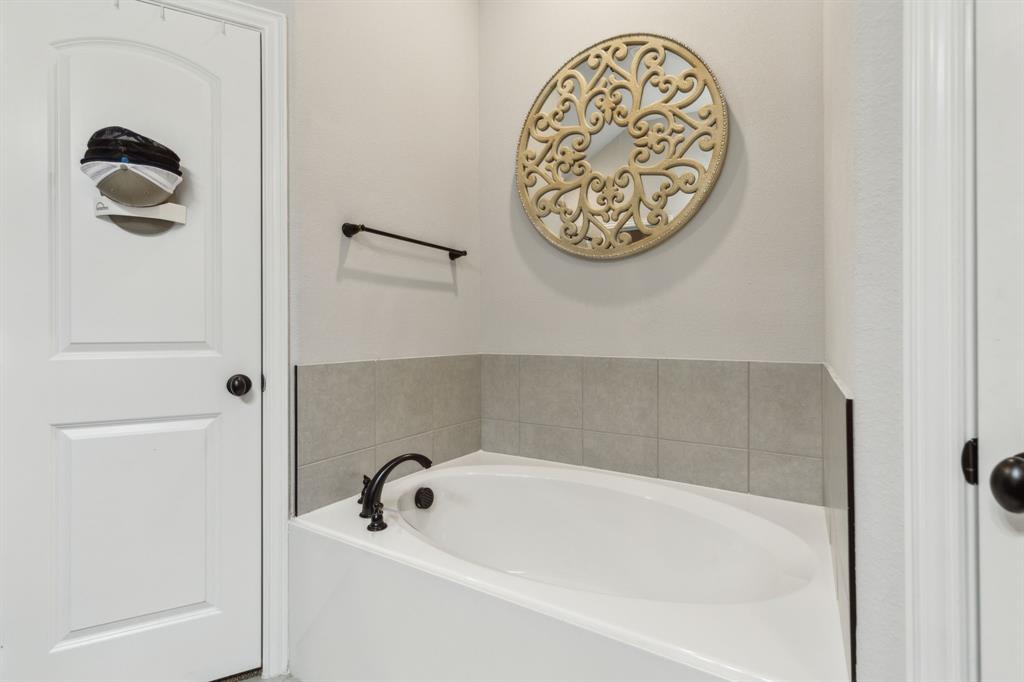 Experience comfortable one-level living in this charming 3-bedroom, 2-bathroom home, ideally situated just minutes from Route 377 in Aubrey, TX. Designed for both ease and style, the open-concept layout offers a seamless connection between the living room, dining area, and kitchen—highlighted by soaring ceilings and recessed lighting that create a bright, airy ambiance. The private primary suite is a peaceful retreat, featuring a walk-in closet, dual vanity, soaking tub, and a separate glass-enclosed shower. A walk-in laundry room adds convenience to the thoughtfully arranged floor plan. Step outside to enjoy a covered patio and a fully fenced backyard with wood fencing—perfect for relaxing or entertaining.
