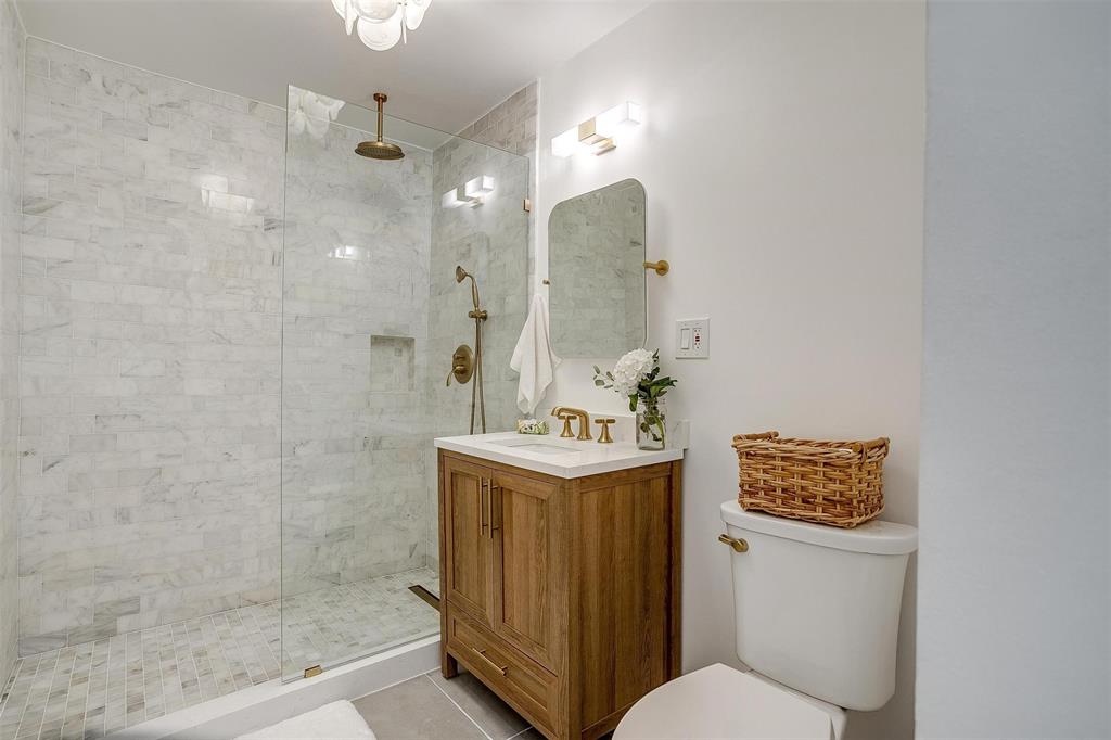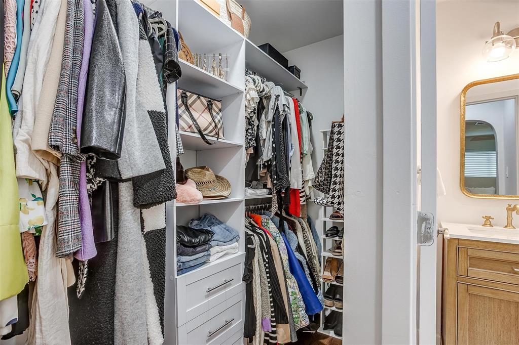The primary suite boasts a walk-in closet plus a second custom closet, offering abundant storage. Its luxurious ensuite bathroom features a walk-in shower, double vanity, and elegant custom tile with a glass enclosure.