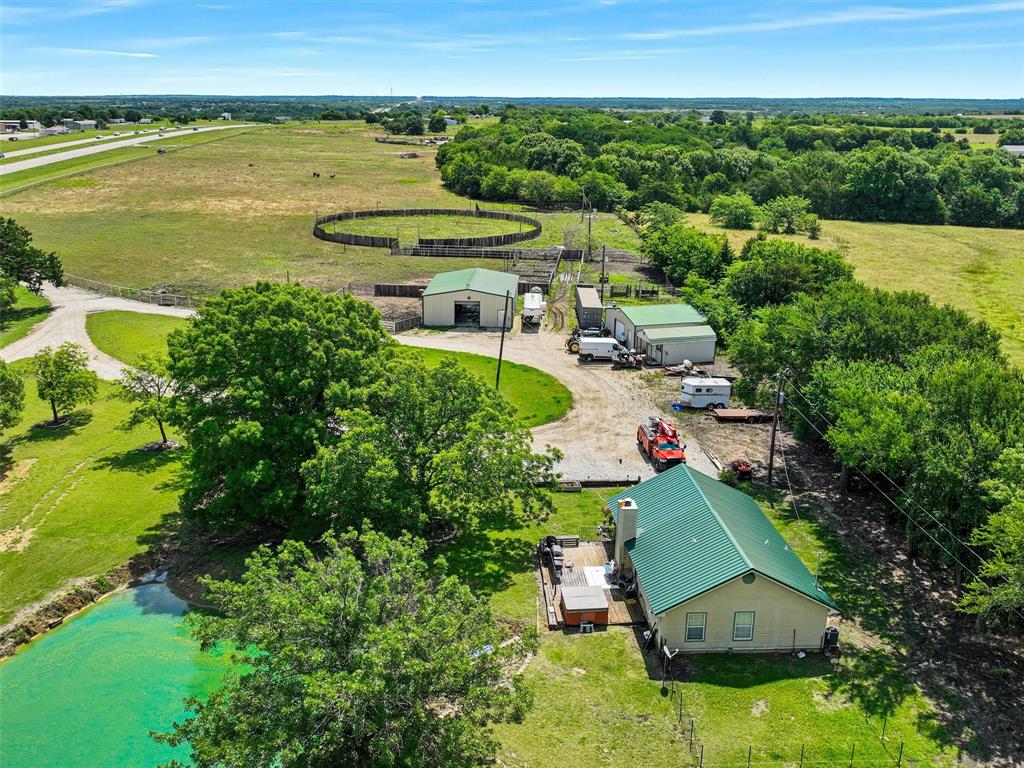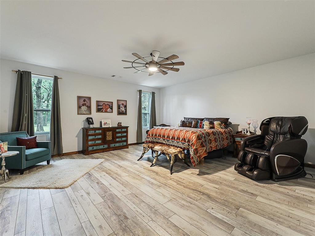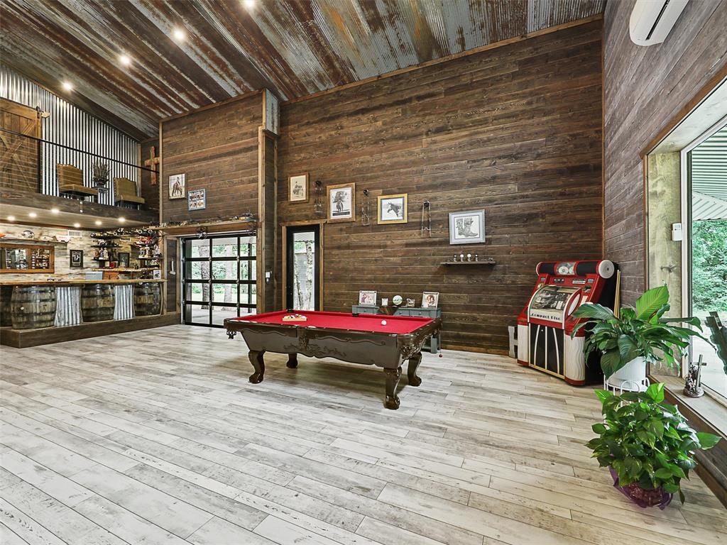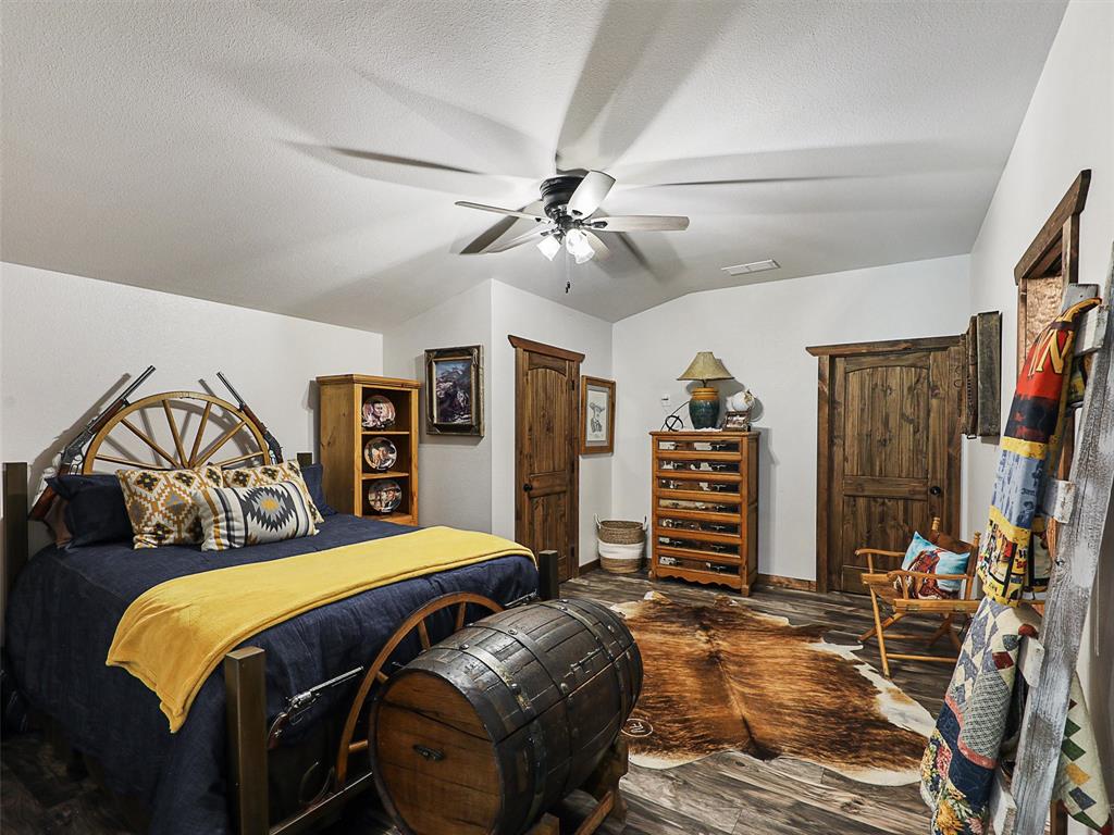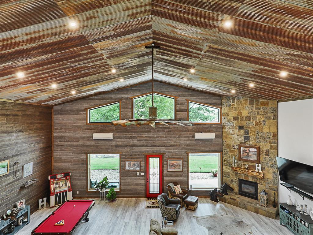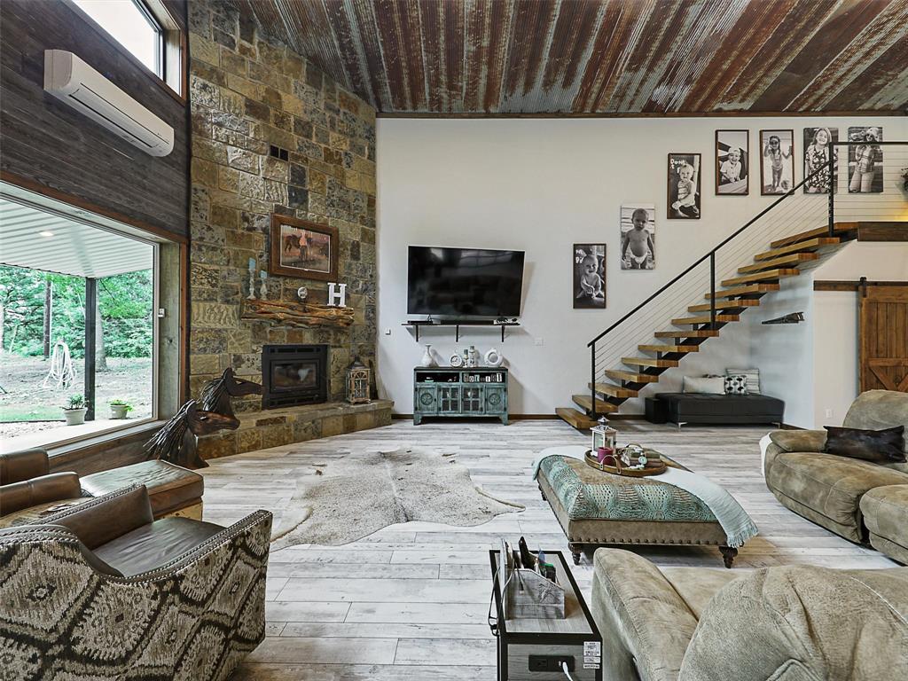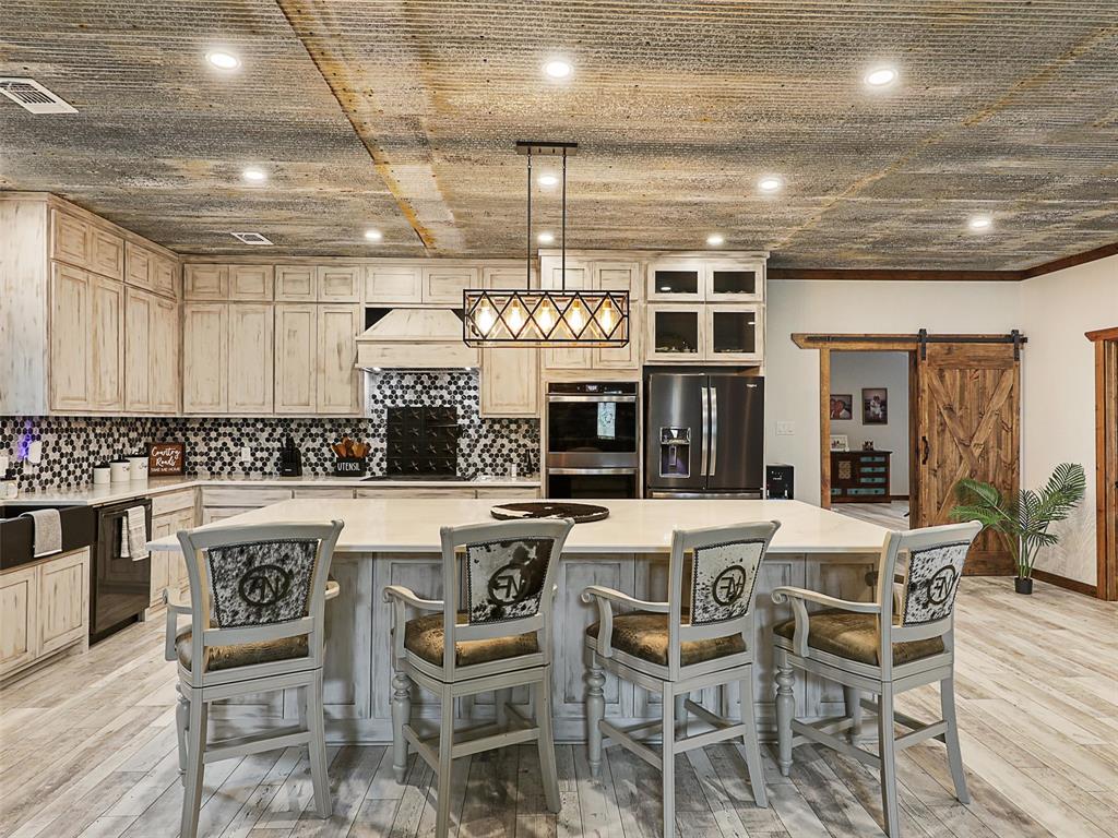 Rustic luxury meets modern ranch living on 28.56 unrestricted acres with over 2,000 feet of Hwy 82 frontage. This gated estate features a 2023-built barndominium-style main residence offering 3 bedrooms, 3 bathrooms, and a dramatic open layout with reclaimed tin ceilings, a floor-to-ceiling stone fireplace, and panoramic views of the countryside. The chef’s kitchen includes quartz countertops, double ovens, and a large island, flowing into a whiskey-barrel bar area with open shelving and a roll-up glass door—perfect for indoor-outdoor entertaining.