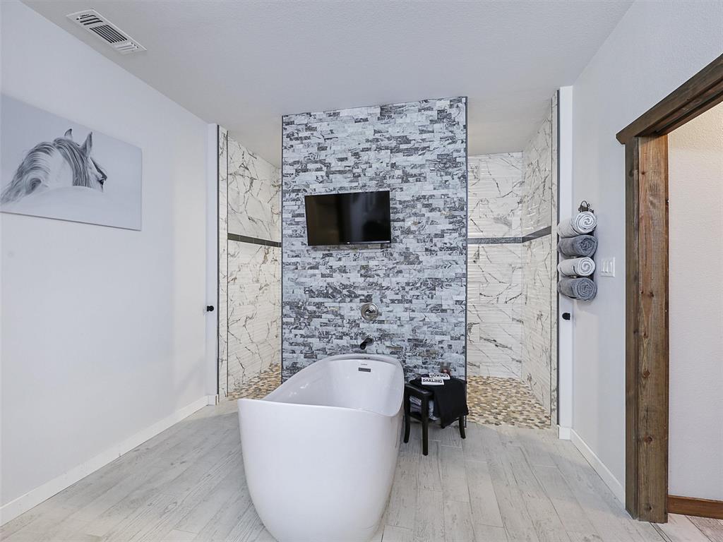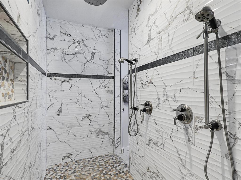 The spacious primary suite boasts a spa-inspired bath with a walk-through double shower, freestanding tub, and dual vanities. Two additional bedrooms and full baths are thoughtfully designed with comfort and character.