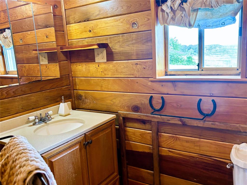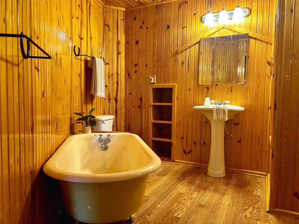 The home embodies the outdoor spirit of this one-of-a-kind retreat, featuring a spacious open-concept living, dining, and kitchen area accented by natural plank walls and ceilings. The thoughtfully designed kitchen boasts an island with a breakfast bar, while the cozy living area is warmed by a wood-burning stove—ideal for crisp winter nights. The first-floor bedroom includes a full bath with a shower, and an upstairs bedroom offers another full bath, ensuring comfortable accommodations.