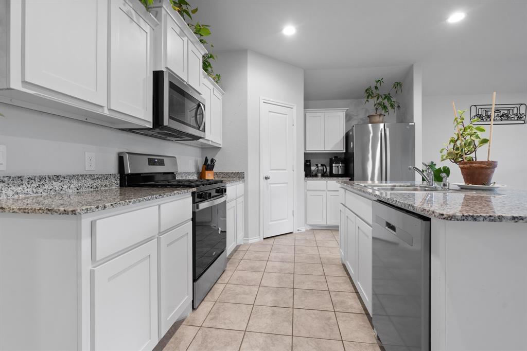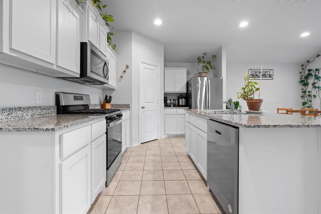 Beautifully designed home featuring an open-concept layout with spacious living and dining areas. At the heart of the home, the chef’s kitchen boasts a large seating island, sleek granite countertops, stainless steel appliances, a gas range, and a convenient walk-in pantry. Primary suite offers a wide vanity, an oversized 5-foot shower, and an expansive walk-in closet. Thoughtful details like tiled entryways, hallways, and wet areas enhance both style and durability. Plus, enjoy the benefits of a fully connected smart home technology package. Step outside to relax on the covered front porch or back patio, all within the privacy of a 6-foot fenced backyard. Additional features include a gas tankless water heater, professional landscaping, full sod coverage, and a sprinkler system.
