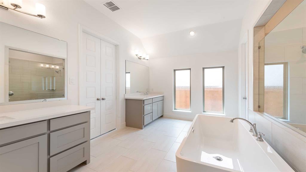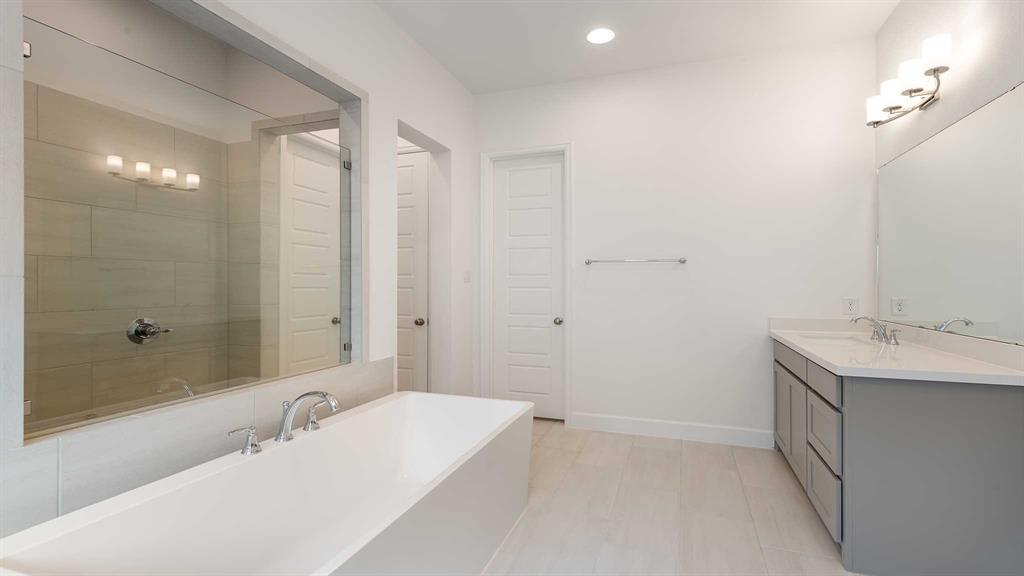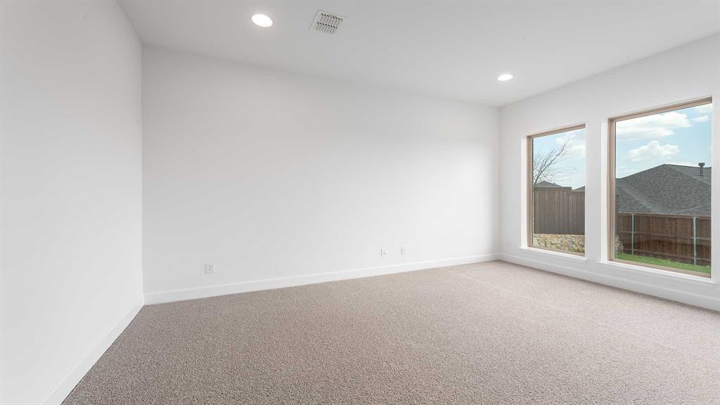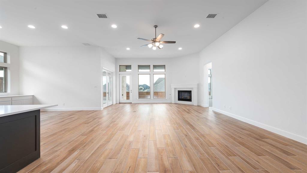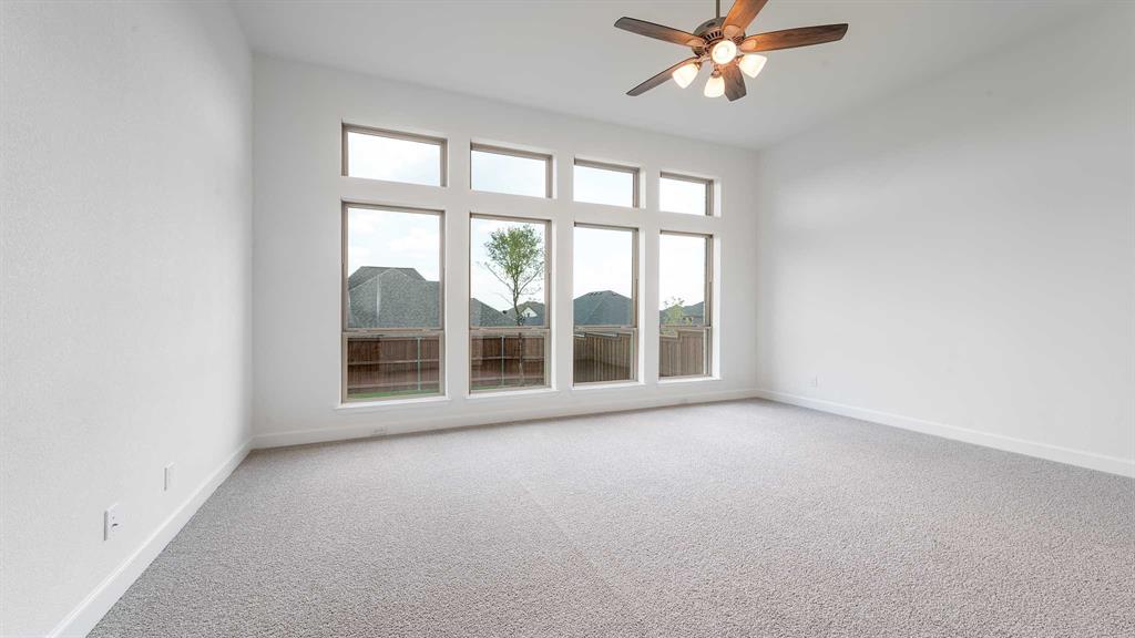 Home office with French doors frame entry. Open family room with a wood mantel fireplace and wall of windows extends to kitchen and dining area. Island kitchen with built-in seating space, 5-burner gas cooktop and a walk-in pantry. Game room with French doors just off the family room. Private primary suite with wall of windows. Primary bathroom features a French door entry, dual vanities, freestanding tub, separate glass enclosed shower and two walk-in closets. Guest suite with full bathroom and walk-in closet. Additional bedrooms with walk-in closets a half bathroom and Hollywood bathroom completes this design. Covered backyard patio. Utility room and mud room off the three-car garage.