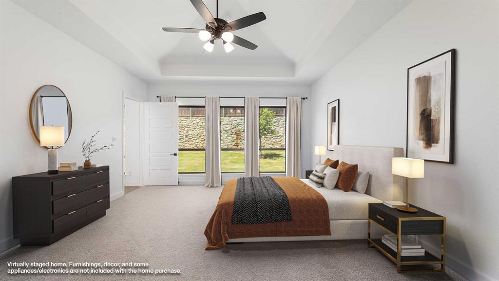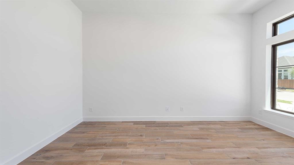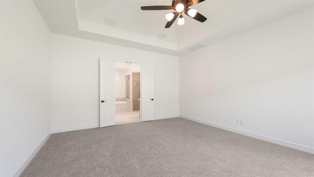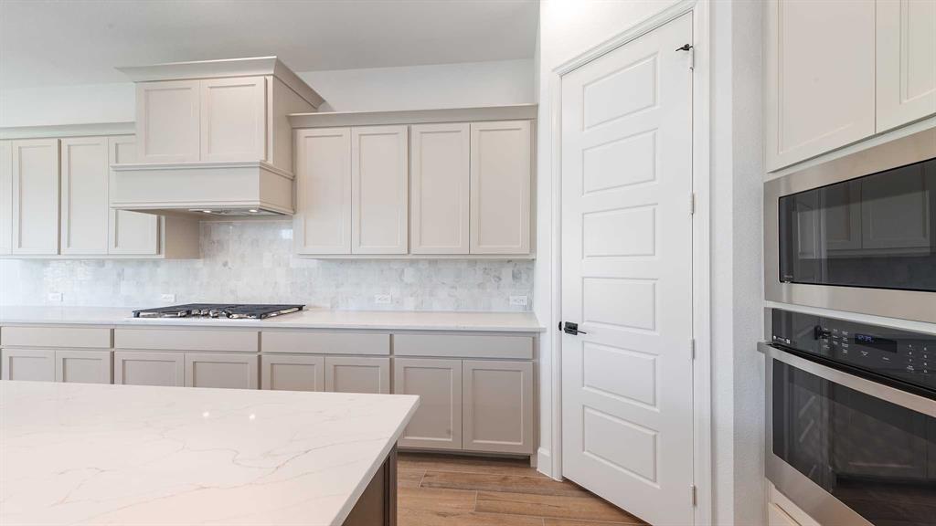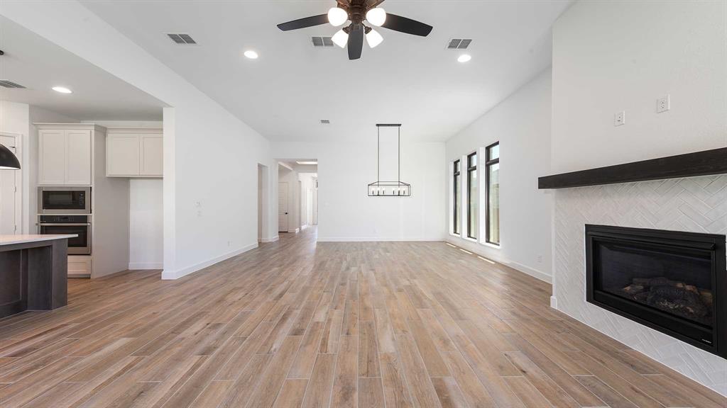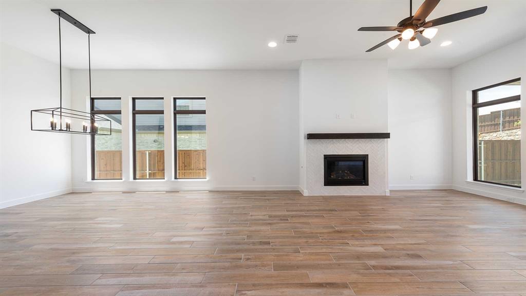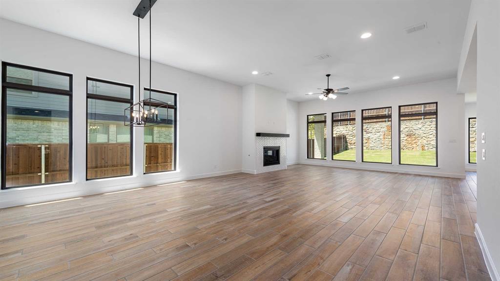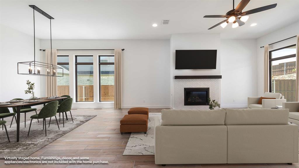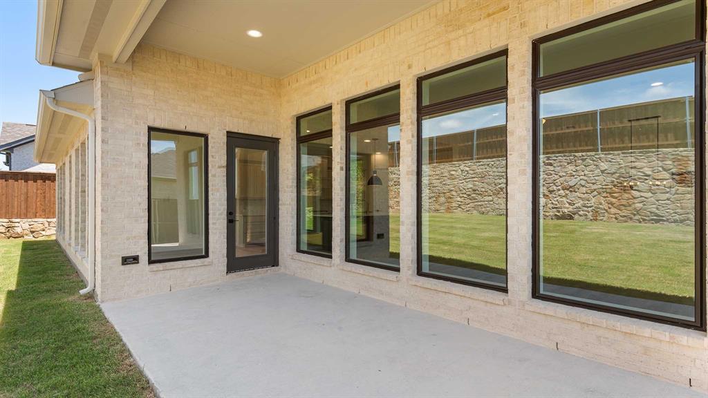 Home office with French doors set entry. Media room with French doors off extended entry. Formal dining room flows into open family room with a wood mantel fireplace and wall of windows. Kitchen features corner walk-in pantry, 5-burner gas cooktop and generous island with built-in seating space. Adjoining morning area features wall of windows. Primary suite includes double-door entry to primary bath with dual vanities, garden tub, separate glass-shower and two walk-in closets. Guest suite offers private bath. High ceilings and abundant closet space add to this spacious four-bedroom design. Covered backyard patio. Mud room off three-car garage.