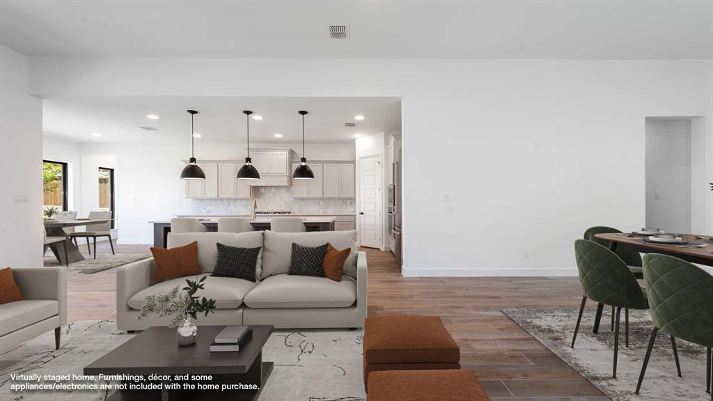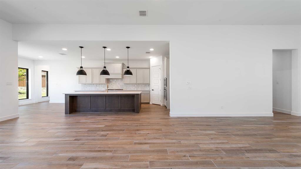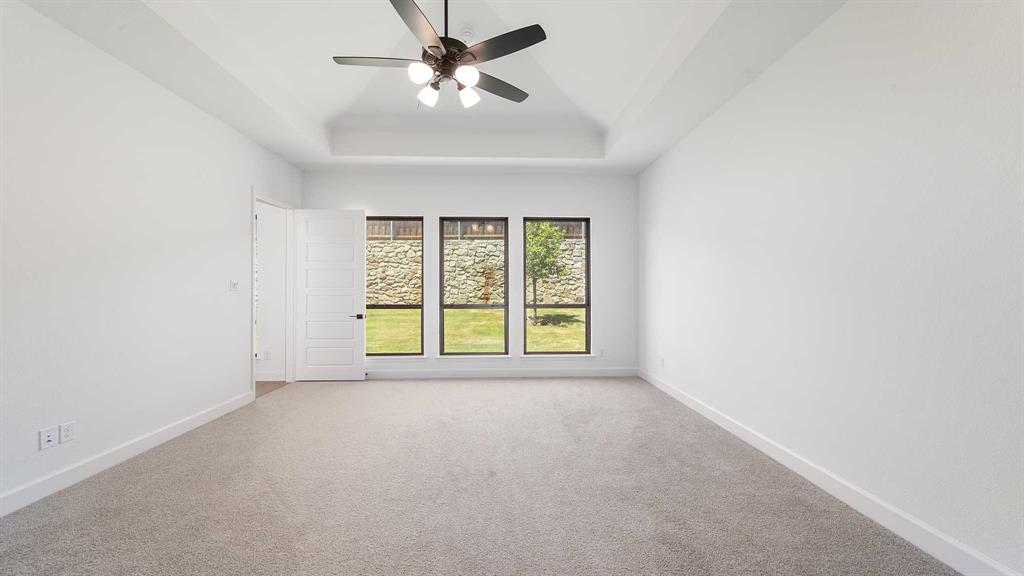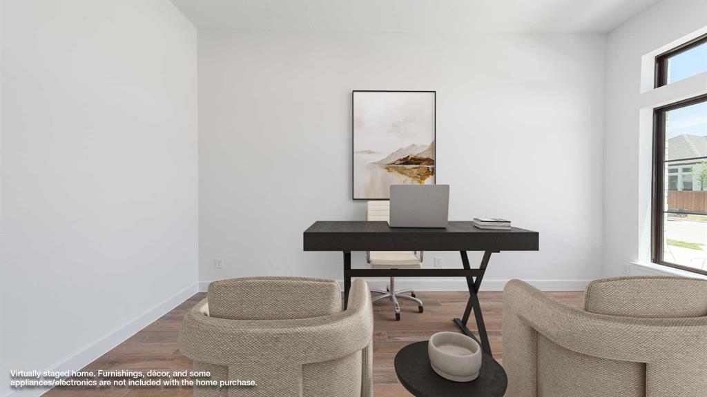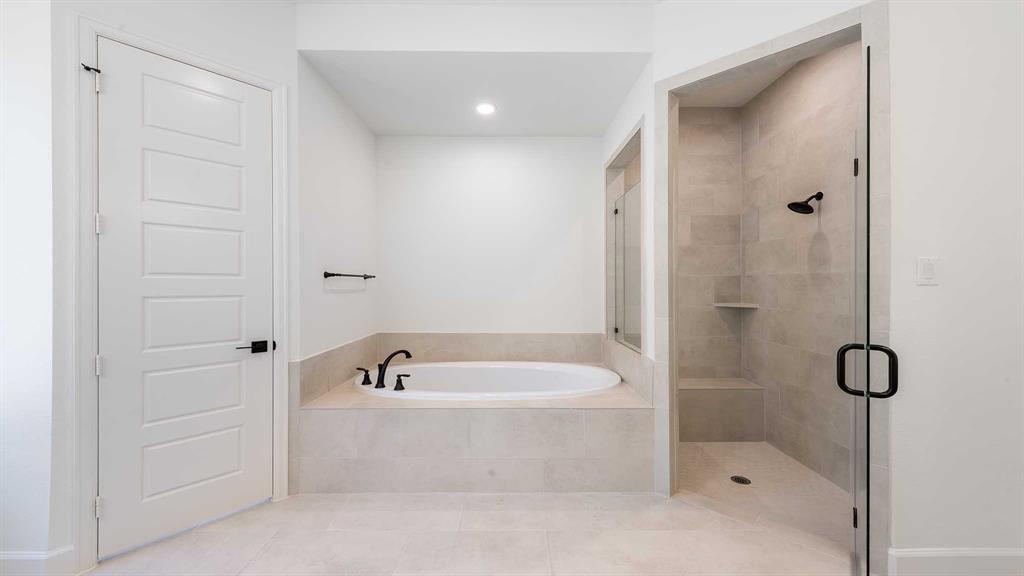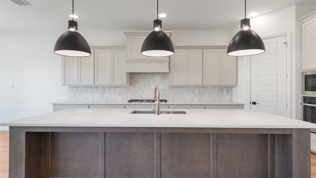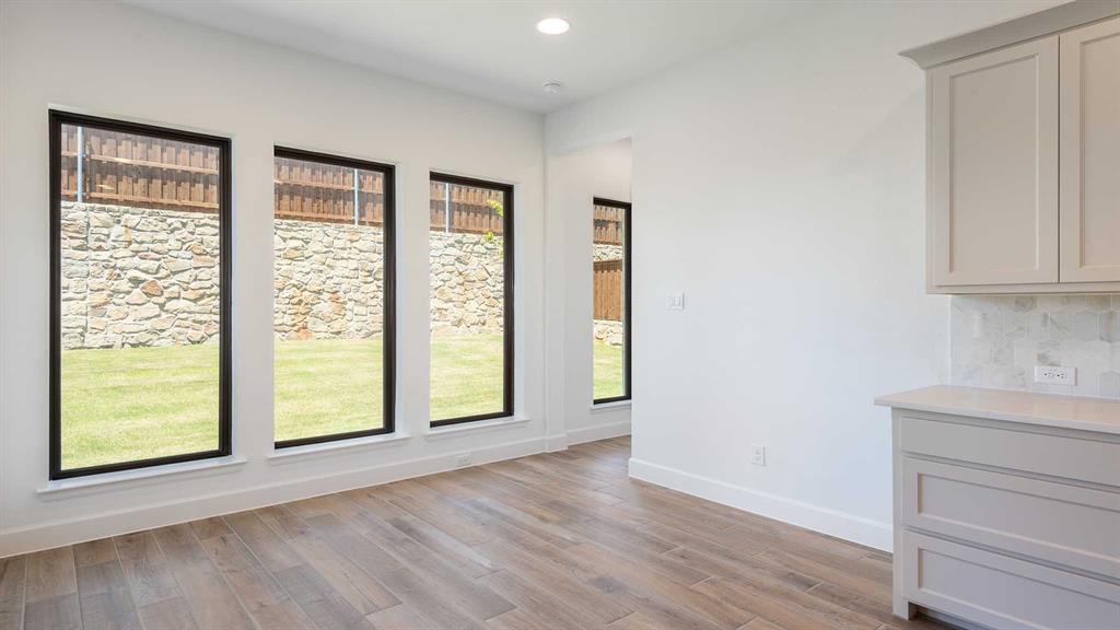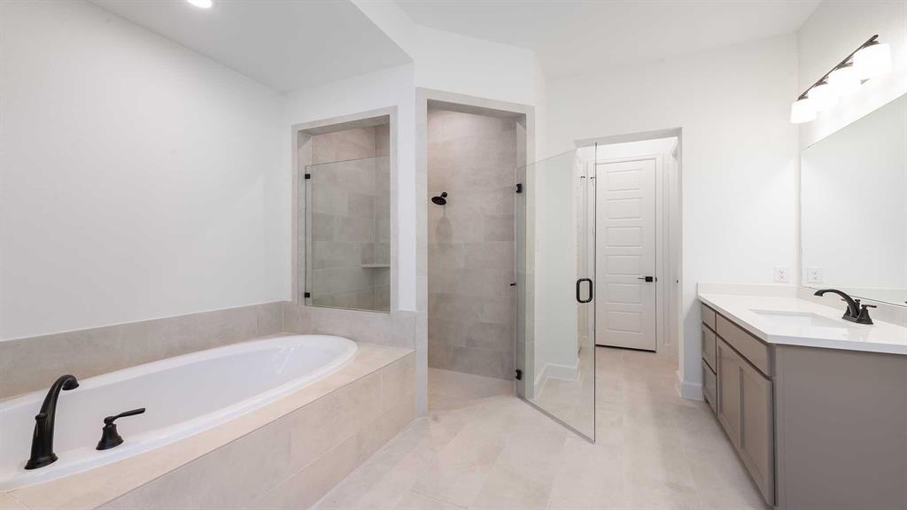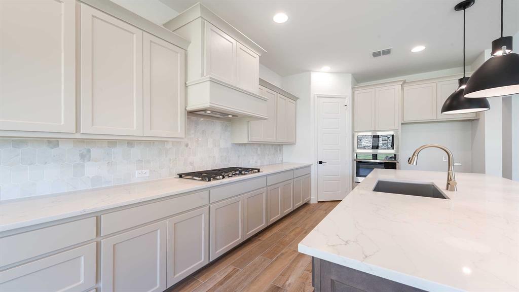 Home office with French doors set entry. Media room with French doors off extended entry. Formal dining room flows into open family room with a wood mantel fireplace and wall of windows. Kitchen features corner walk-in pantry, 5-burner gas cooktop and generous island with built-in seating space. Adjoining morning area features wall of windows. Primary suite includes double-door entry to primary bath with dual vanities, garden tub, separate glass-shower and two walk-in closets. Guest suite offers private bath. High ceilings and abundant closet space add to this spacious four-bedroom design. Covered backyard patio. Mud room off three-car garage.
