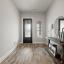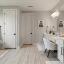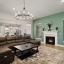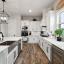 The open-concept kitchen is a chef’s dream, boasting quartz countertops, a designer backsplash, a gas cooktop, dual ovens, a wine fridge, Beautiful wood looking tile, and a charming farmhouse sink. Decorative lighting throughout the home adds a touch of elegance, while the cozy fireplace creates a warm and inviting atmosphere.