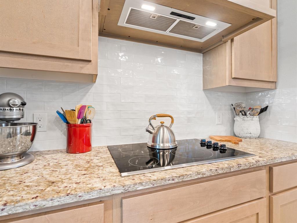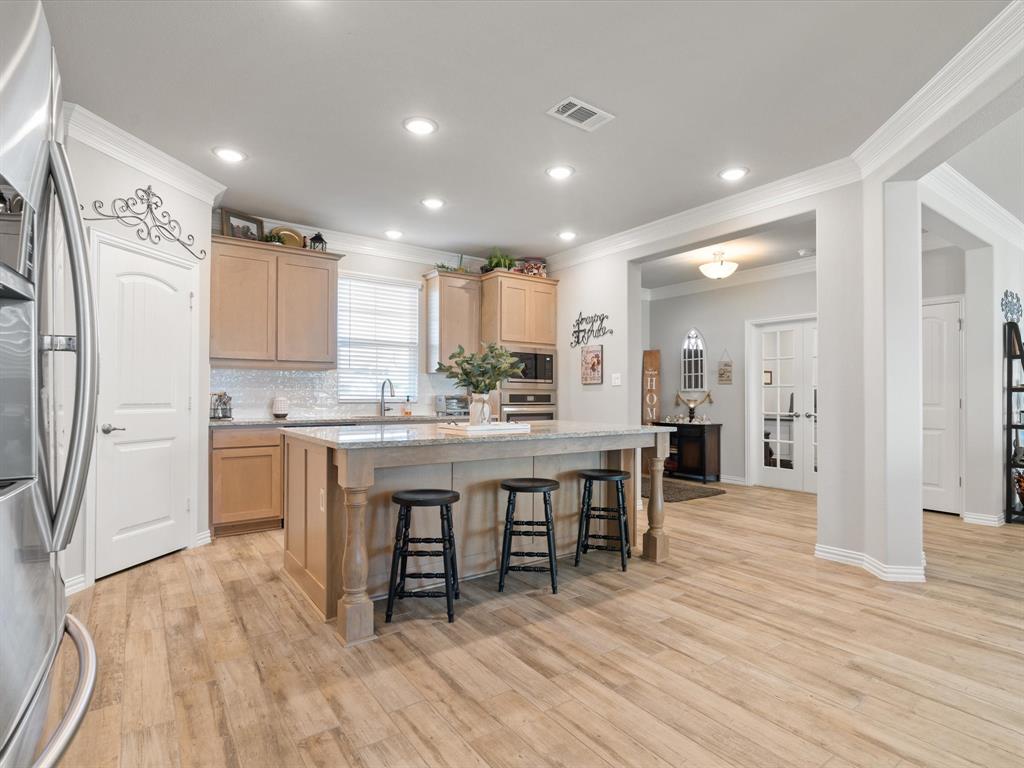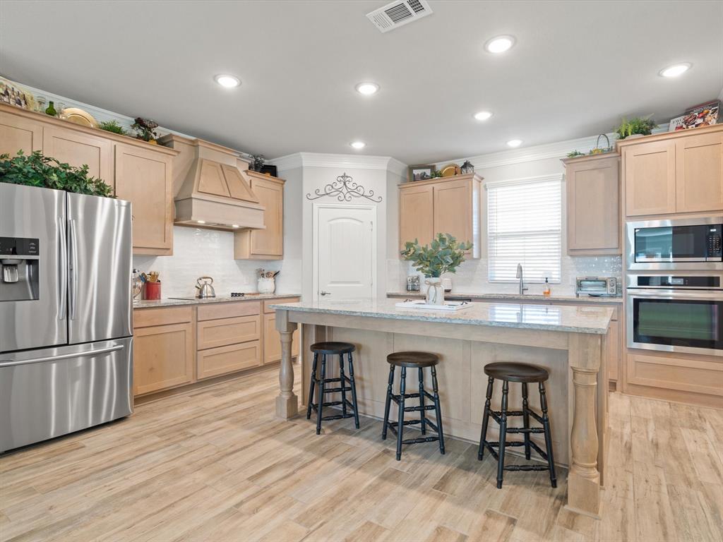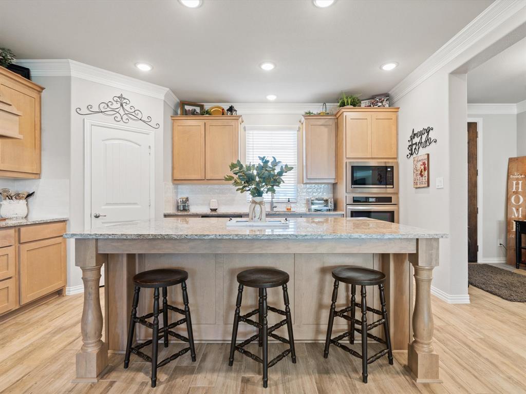Inside, natural light fills the open-concept layout where the spacious living room—anchored by a cozy wood-burning fireplace—flows seamlessly into the modern kitchen. With its oversized island, breakfast bar, built-in oven and microwave, and abundant cabinet space, the kitchen is designed for both everyday living and effortless entertaining.
