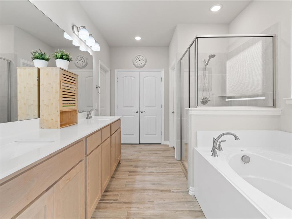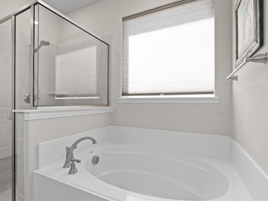 The primary suite is your personal retreat, featuring dual sinks, a soaking garden tub, and a separate shower. Step outside to enjoy the covered patio or make use of the beautifully crafted wooden shed—perfect for hobbies, storage, or keeping the garage tidy.