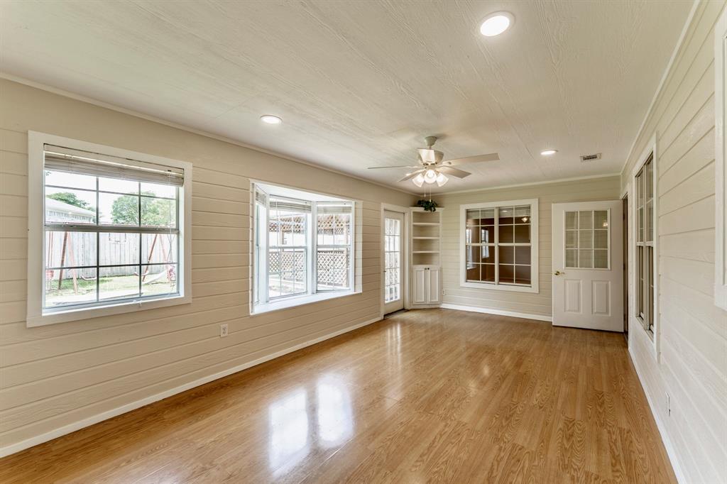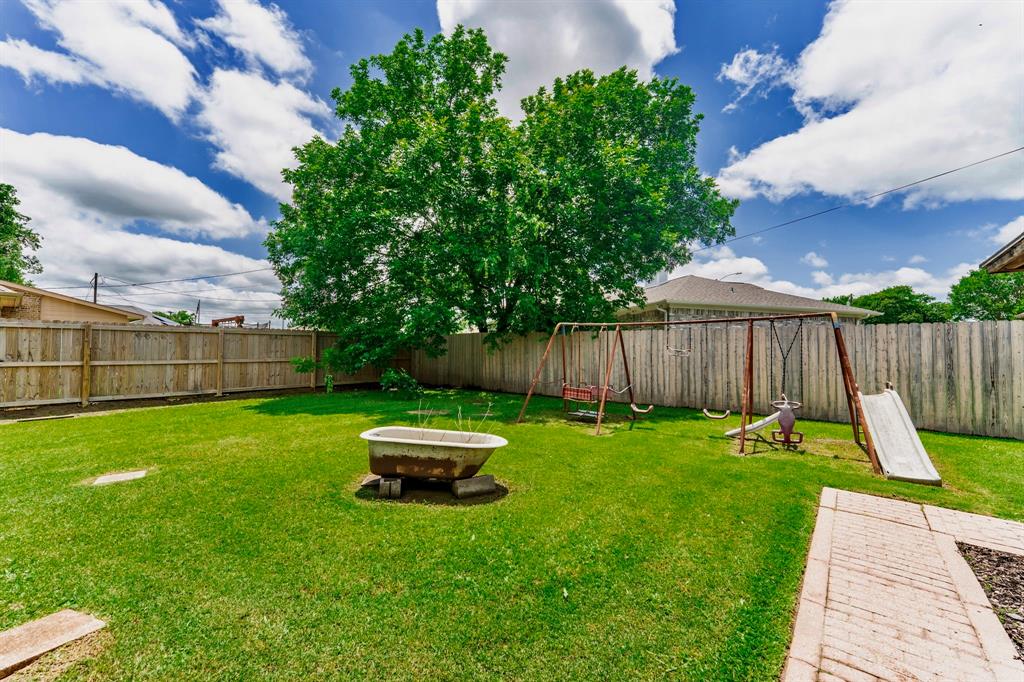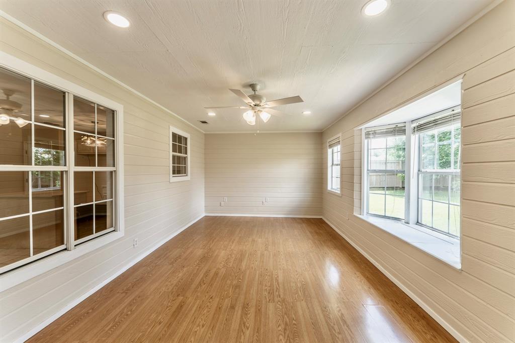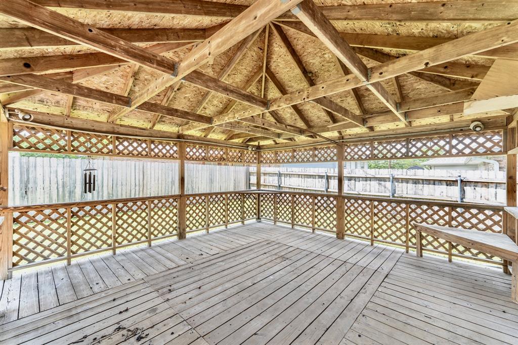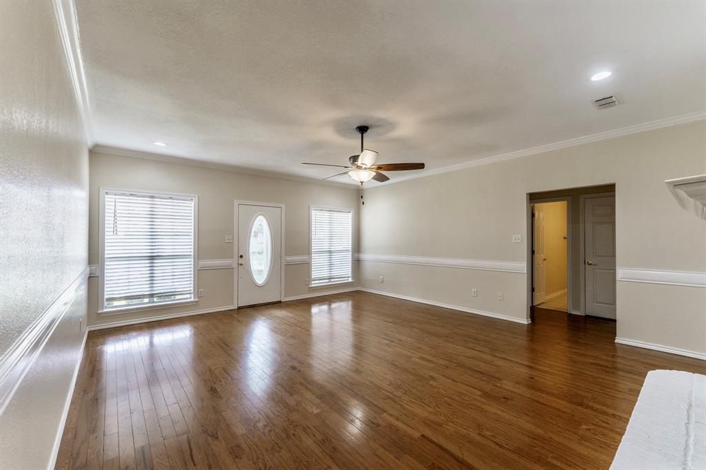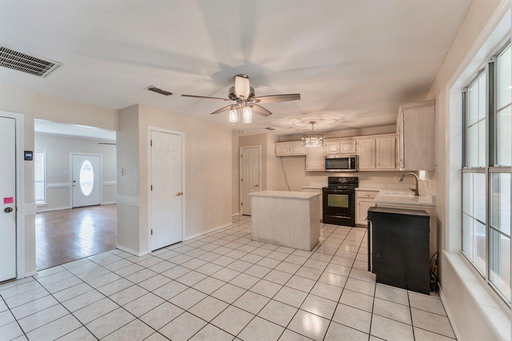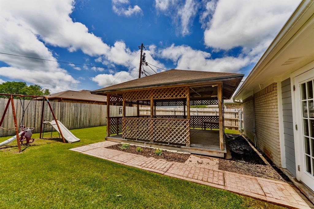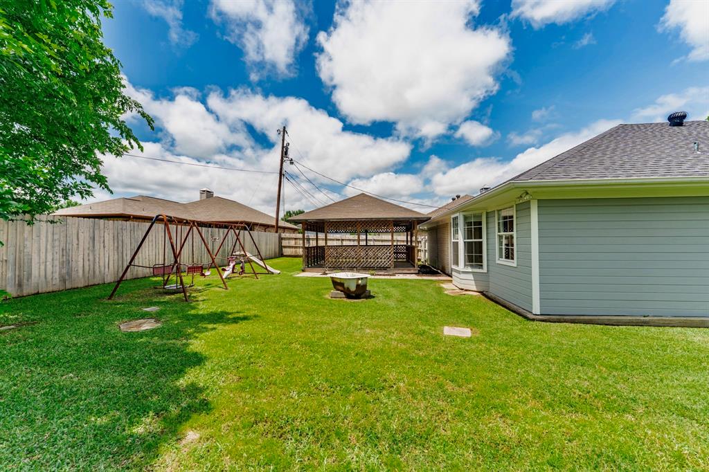 Come see this updated 3 bedroom, 2 bathroom, with 2,109 square feet, tucked inside Woodbridge Crossing subdivision! There is a bonus room off the kitchen that would be a great home office, home gym, kids playroom, or den. A wood-burning fireplace, recessed lights, and wood laminate floors make the living room a great space. From a bright and fresh kitchen, with light tile and cabinets, you’ll find granite countertops, an island, and stainless steel appliances. The primary bedroom includes a trey ceiling, wood laminate flooring, ceiling fan and bathroom with split double sinks, ceramic tile, and walk-in closet. For additional privacy, the primary bedroom is split from the guest bedrooms. A spacious backyard comes with a large covered gazebo and wood privacy fence. Your lawn will be easier to care for with a built-in sprinkler system. Bring your fishing poles to the community lakes and enjoy a picnic under the covered pavilion!