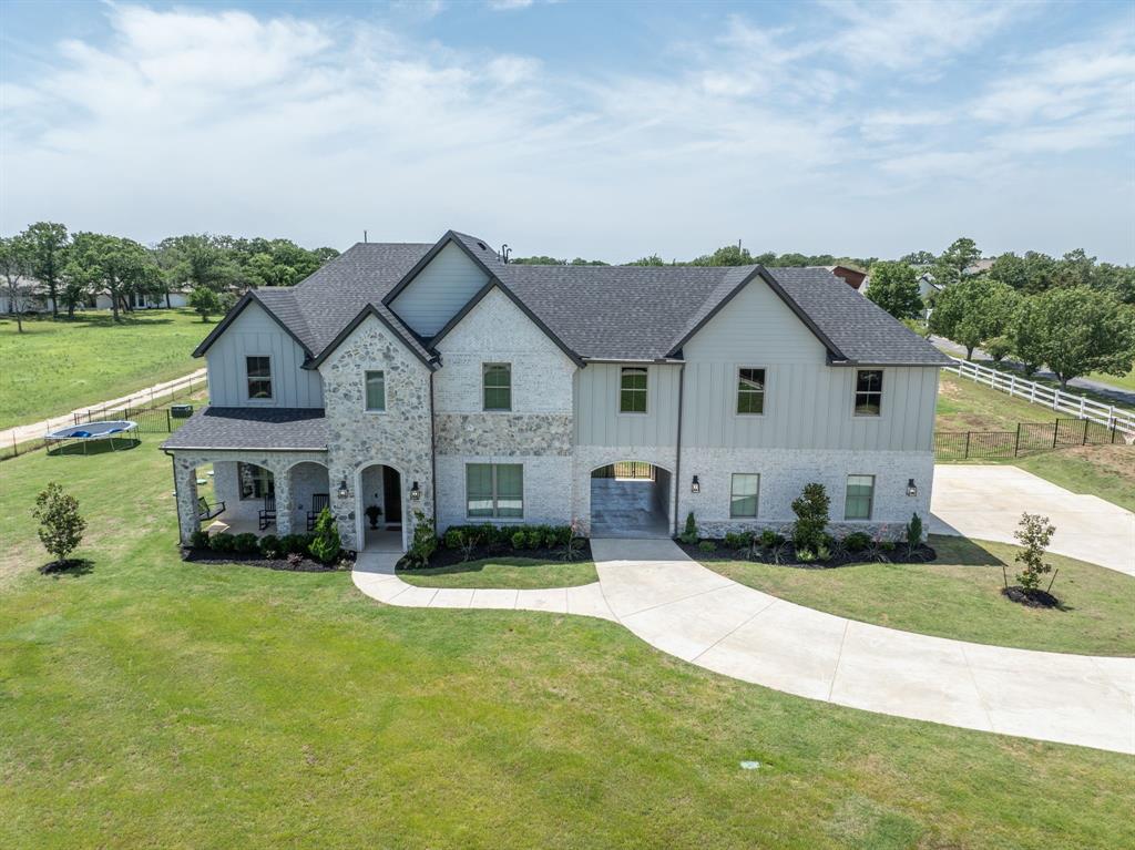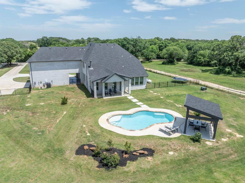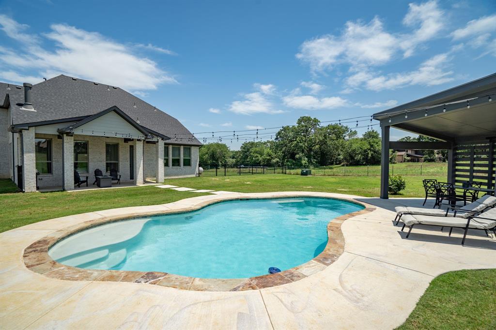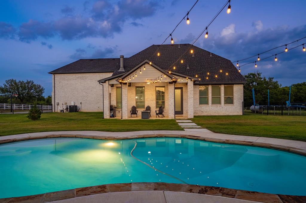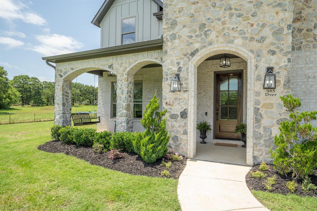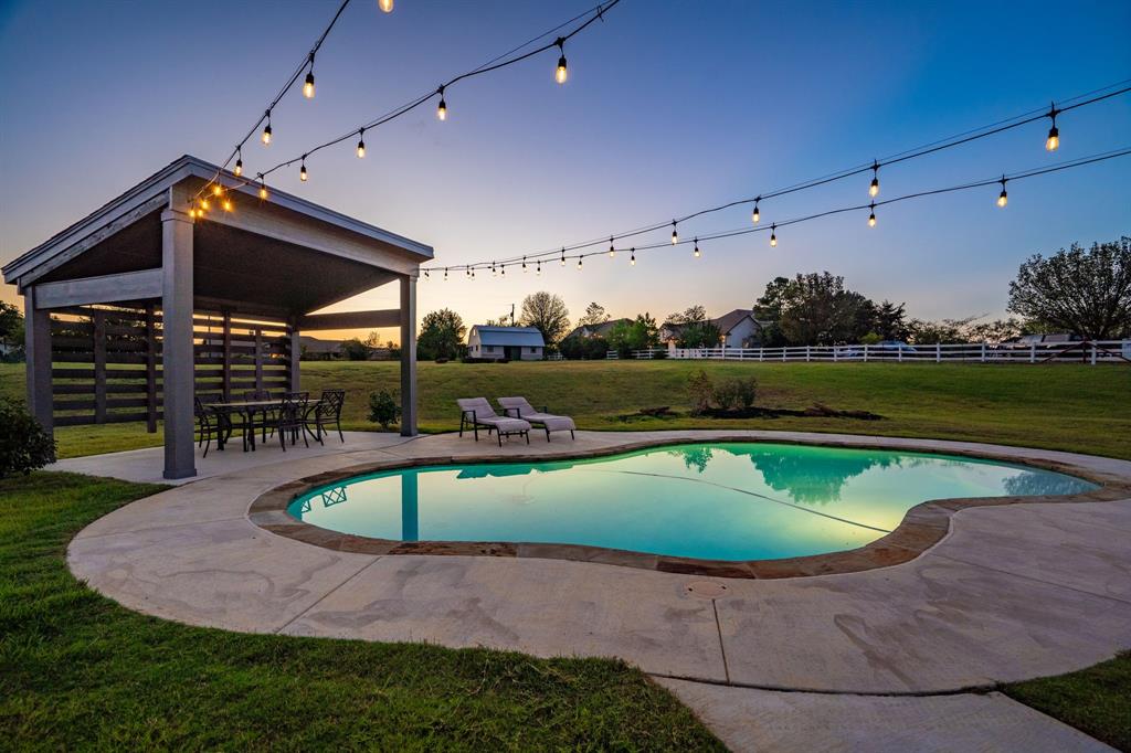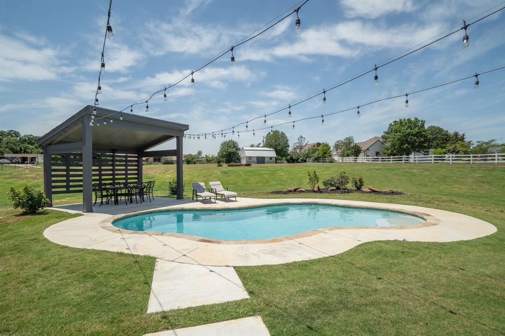 Welcome Home to Dyer Estates! This 5 bed, 4.5 bath estate on 2.4 acres offers the perfect blend of elegance and charm, all with no HOA restrictions! Spacious living areas, tall ceilings, oversized windows, and a cozy fireplace round out the main floor. The chef's kitchen is a culinary delight, featuring stainless steel appliances and custom cabinetry. A luxurious primary suite is a true sanctuary, boasting a spa-like bath with a soaking tub, dual vanities, and a separate shower. Additional highlights include beautiful hardwood floors, a dedicated home office, and a versatile bonus space perfect for fight night, game night, or overnight guests. Enjoy endless summer days by the pool, surrounded by expansive patio areas ideal for entertaining. This property features a sizeable barn, perfect for horses, events, or recreational vehicle and toy storage. Animals welcome! Zoned to Argyle School District, this peaceful blend of rural living and urban proximity is a must-see!