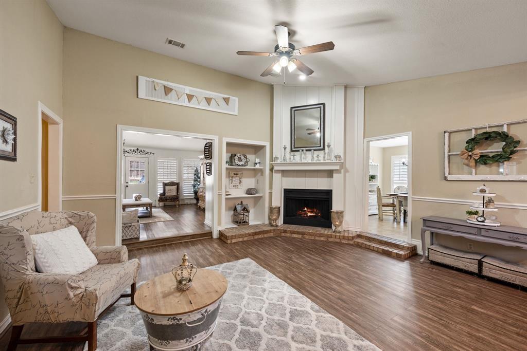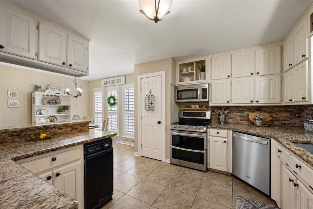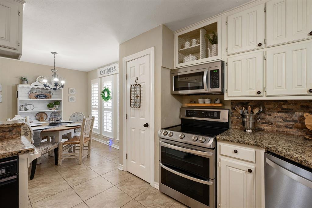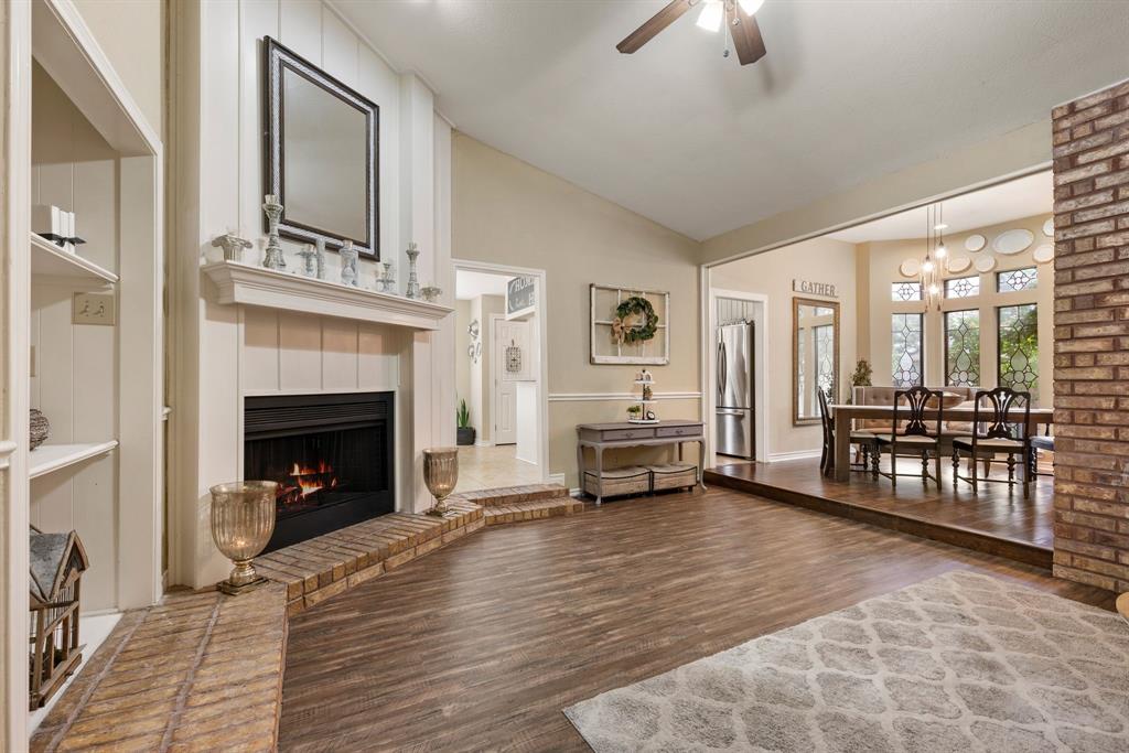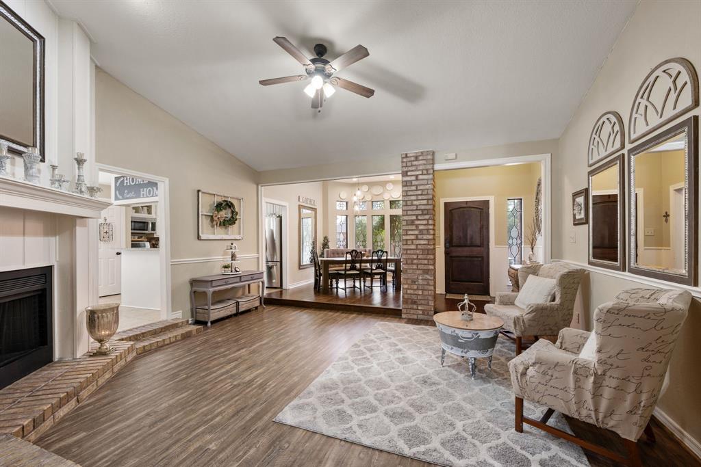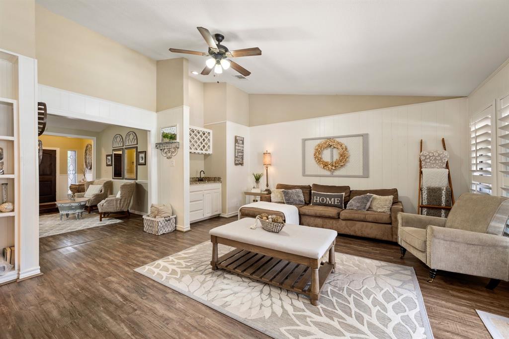 NEW ROOF, GUTTERS, AND FENCE STAINING. Step into timeless charm with this beautifully styled 3-bedroom, 2.5-bath home, offering the perfect blend of rustic farmhouse character and modern comfort. Nestled in a quiet, welcoming neighborhood, this spacious residence features two inviting living rooms—ideal for both cozy nights in and lively entertaining. Exposed brick accents and thoughtfully selected farmhouse finishes create a warm, inviting atmosphere throughout. Enjoy natural light pouring in through classic plantation shutters, adding elegance and privacy to every room. Main living room offers a fireplace and shelving. The secondary living room hosts a wet bar and views of your gorgeous backyard. The kitchen features white cabinetry, a new double oven and microwave, and granite counters. This home has two dining area options! The primary bedroom features a sitting area and door to your patio. The en-suite bath is spacious with two walk-in closets, two sinks, a walk-in shower, and tub. Two secondary bedrooms complete the space. Out back, your private oasis awaits—a sparkling pool surrounded by mature landscaping, perfect for weekend lounging or summer gatherings. The pool was recently replastered. Upgrades include electrical panel, plantation shutters, new garage door, new thermostat, and new air handler for HVAC system. Whether you’re drawn to the style, space, or seamless indoor-outdoor living, this home has something for everyone. Don't miss this home in a fantastic location! The seller will have the home painted upon move-out, the new home-owner gets to select the new paint color!